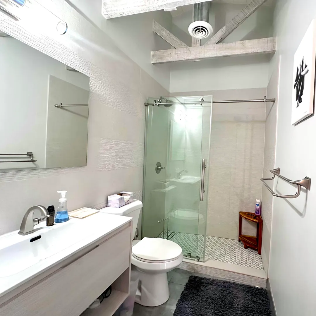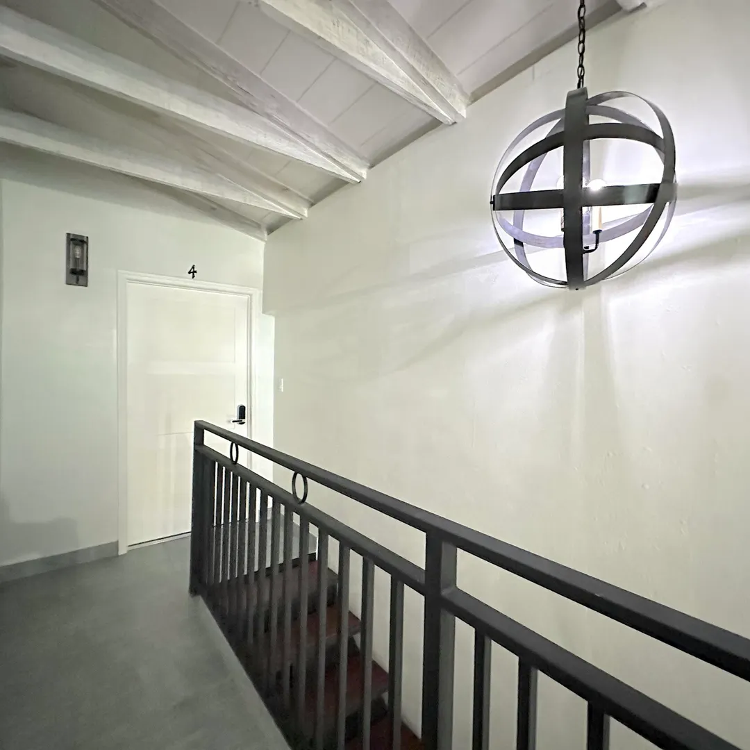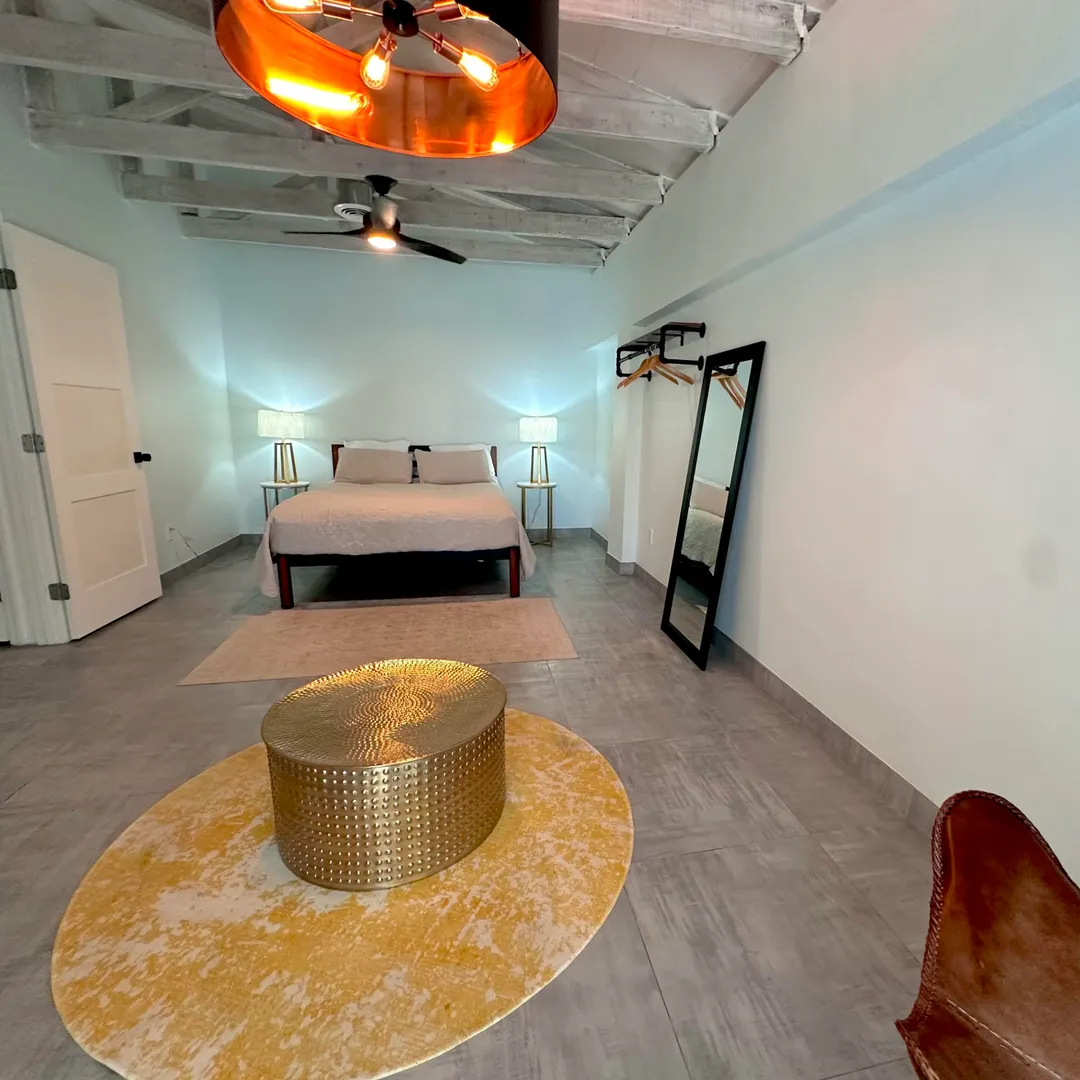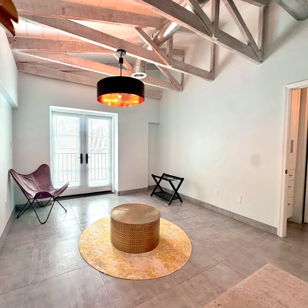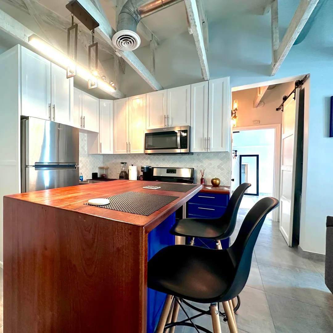 1-Bedroom/1-Bath upper-level apartment with a sea view in the heart of Christiansted Town. Unit is fully furnished with updated kitchen, private home office nook with desk, central A/C, flat screen Smart TV, washer/dryer, WiFi, monthly pest control, & trash pick up. Tenant pays utilities & a $50/Mo water fee. Private parking is available for Tenants. Unit is above a modern work space & cafe which features great breakfast, lunch, coffee, tea, & smoothies as well as private, enclosed work spaces with desks perfect for remote work. Dinner is available at the downstairs restaurant which also features a Biergarten & cocktail/wine bar. Unit is cozy and provides both quiet privacy with updated windows and central A/C. Walking distance to restaurants, bars, stores, groceries, banks, & a public p