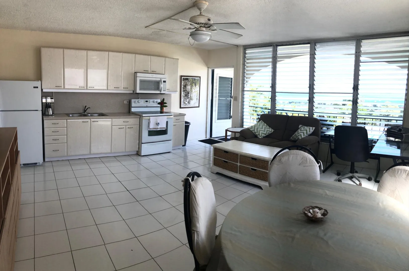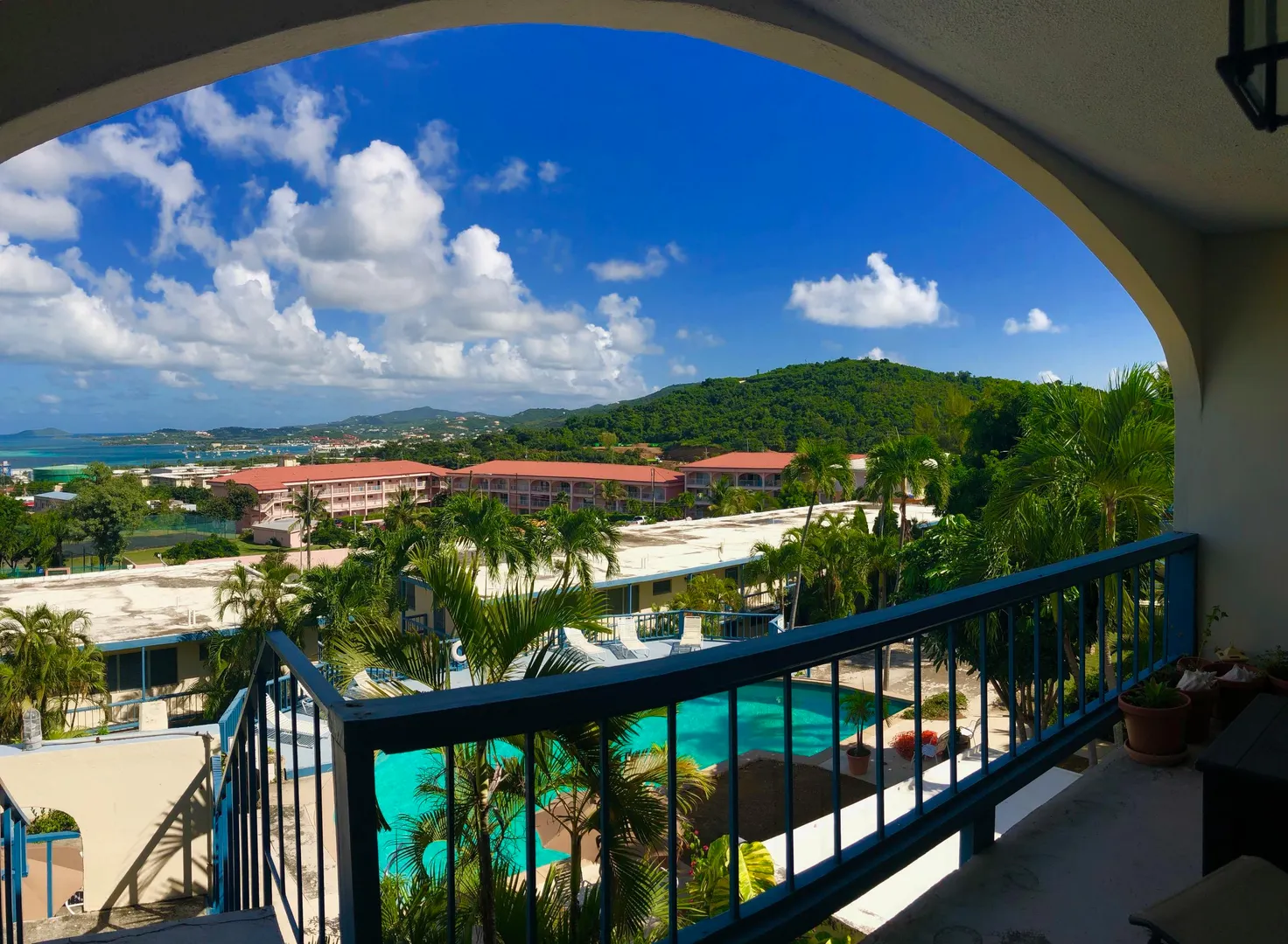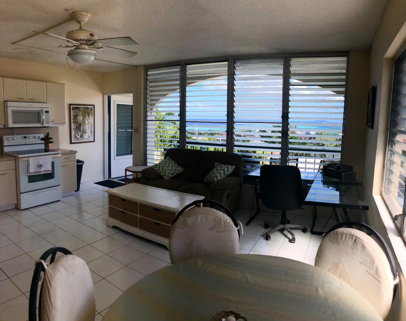One bedroom condo with beautiful views of Christiansted and the blue Caribbean Sea.3rd floor end unit with great breezes. The common areas are in good shape, nicely landscaped and low fees!Walk to shopping, beaches, restaurants and transportation. Parking lot is fenced.Some tile in the bedroom needs to be replaced. Wasn't put in right and some have come off.
