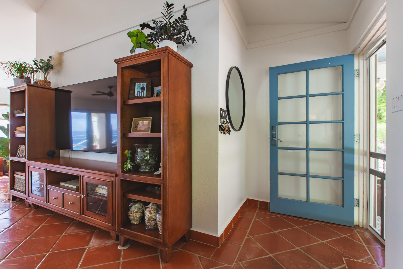 Nestled in the leafy enclave of Maggie Hill is this furnished, turn-key, 2 bedroom, 2 bath home with a pool, solar, central AC and mini splits, a studio cottage, lush landscaping and sweeping views of the South Shore. Gorgeous ocean blues fill the open floor plan through huge windows that line the entire southern exposure of the home. A terraced front yard filled with trees, perfect for dogs - the entire property has been fully fenced. Meticulously maintained....the Sellers have completed a multitude of improvements in the short time, they have owned the property - a full list of improvements is in the documents section. Perfect as a first or second home or turnkey vacation rental! (continued)The kitchen features new appliances, new backsplash tile, granite countertops, a separate wine fridge and a large pantry. The kitchen has a west facing door for easy access to the pool and grill when entertaining. The dining table with upholstered bench provides for comfy and relaxing meals while starring out at the ocean. There is enough seating for more than 10 people comfortably at this window seat bench/dining area. There are many areas to lounge in this home. The spacious covered deck off the two living rooms has lots of cozy seating for ocean gazing or watching the activity down at Divi. The second living room leads to two bedrooms, both with their own bathroom. The primary bedroom has a large seating area, its own exit to the driveway, a walk-in closet and a dressing room between the ensuite bathroom and closet -any clotheshorse dream come true. The guest bathroom has been redone.