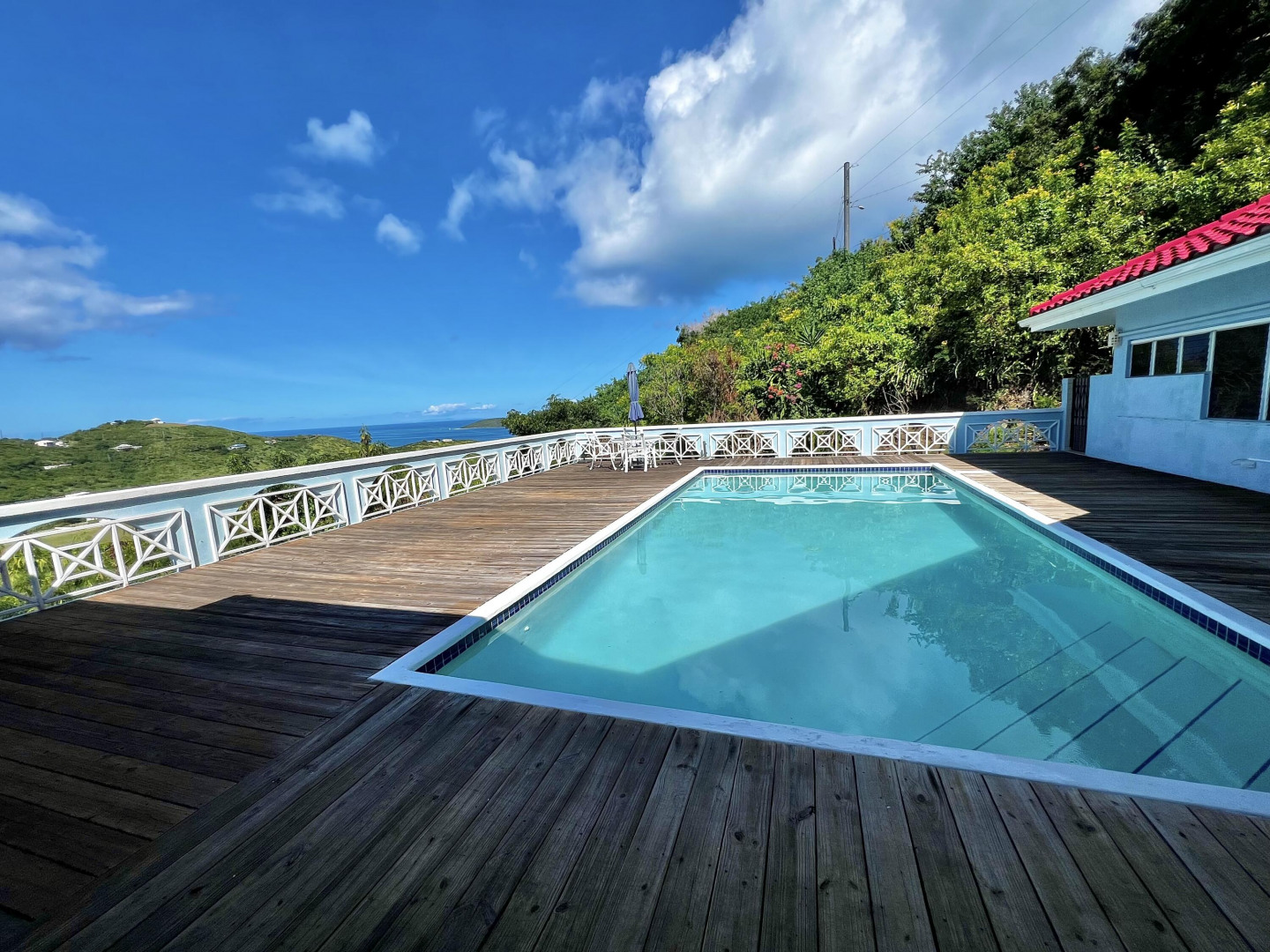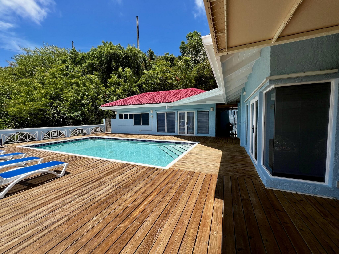 Mandevilla, where luxury living blends seamlessly with breathtaking sea views and surrounding natural beauty. This pod-style island retreat offers the perfect balance of indoor-outdoor living, with 3 en-suite bedrooms in the main house, a fully equipped lower-level apartment, totaling 4 bedrooms and 4.5 baths--designed for privacy and comfort.The heart of this home is its light-filled kitchen, completely remodeled in 2023. A new skylight floods the space with natural light, beautifully highlighting the quartz countertops, sleek new appliances, and a stylish kitchen hood. The living area features new shades and a mini-split AC system, ensuring a comfortable and inviting atmosphere. Step outside to your private outdoor haven, complete with a salt-chlorinated,heated pool surrounded by multiple seating areas for sun or shade. A recently added concrete path leads you to the front door, enhancing both convenience and curb appeal.