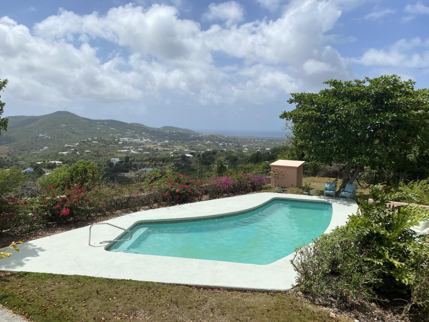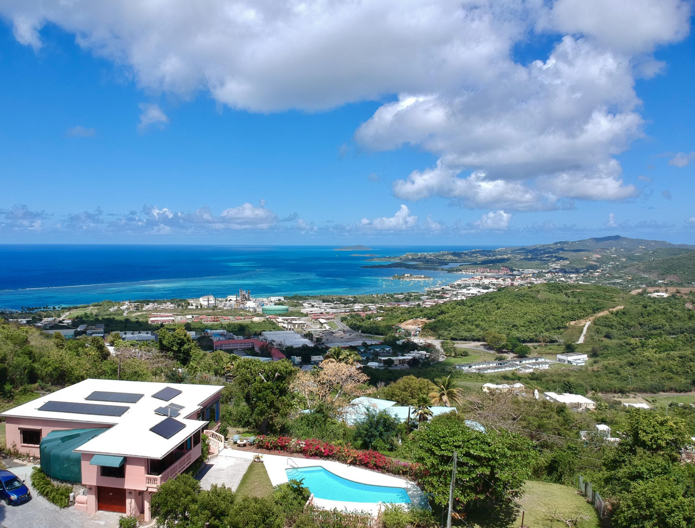 Elegant & Classy Stately home never before offered. Newly refurbished pool, perfect for swimming those early evening laps. Freshly painted pool apron all the better for the gathering of friends and family (when we are back doing that) or romantic interludes under the stars. Dual shore views from Christiansted harbor to south shore provide views for all times of the day or night. Separate air conditioned master bedroom ensuite with large bath with a Caribbean Sea view. Guest Bedrooms each have their own half bath wth a Jack 'n Jill shared walk-in ceramic tiled shower. Net metering means no electric (WAPA) bills, only credits. Quality finishes throughout, mahogany doors and windows, marble and ceramic tile floors, hurricane shutters all round plus some new impact glass.Custom made office with space saving features with mahogany bar built by local craftsman, Mark Mandon. Screened back porch perfect for your special plants, herbs and orchids. So many recent upgrades: March 2020 Exterior Completely Repainted January 2020 New 3.8kw Net Metering with 13 solar panels with battery invertor system AT&T booster system and router on solar along with water pump, refrigerator, fans, kitchen lights & outlets and about 75% of all electric. Solar Hot Water System 2019 New Refrigerator 2019 Six New Roll Down Shutters Installed 2019 Septic Tank pumped (rarely necessary, last time was 30 years ago) Fall 2018 Cisterns cleaned, repaired and re-coated Fall 2018 Pool totally redone by Aqua Tek. re-coated, new drain installed to meet code, new pool pump, new surface, new water line ceramic tile Extra built Roof and Ceilings, Cypress Tongue and Groove Ceilings under 1.5" thick treated plywood. Roof re-coated about 3 years ago. Rare One Car Garage Owner Financing May be Considered Some Furniture excluded and all personal items to be excluded. Inventory to be provided