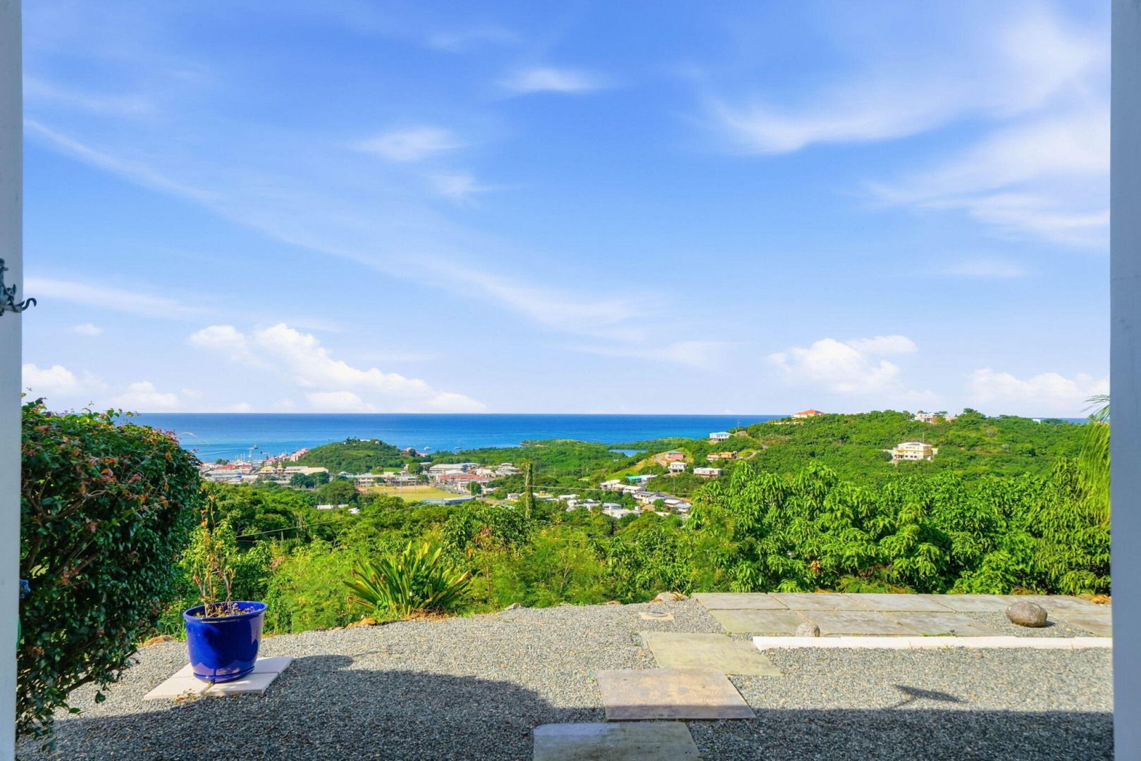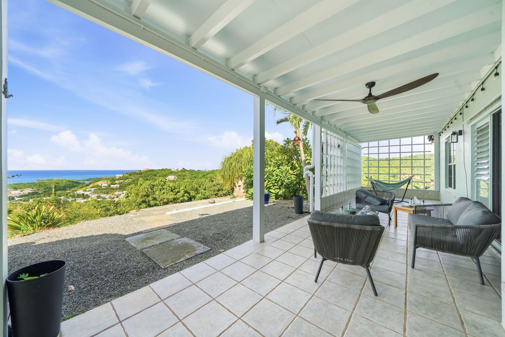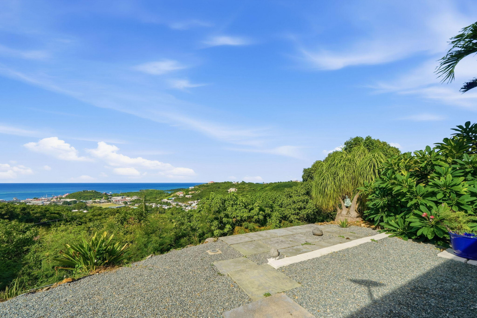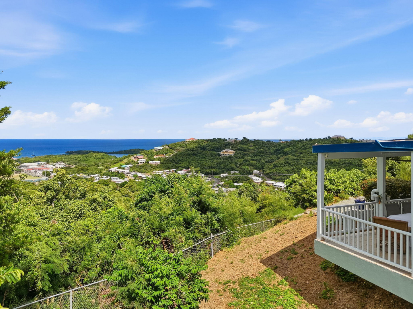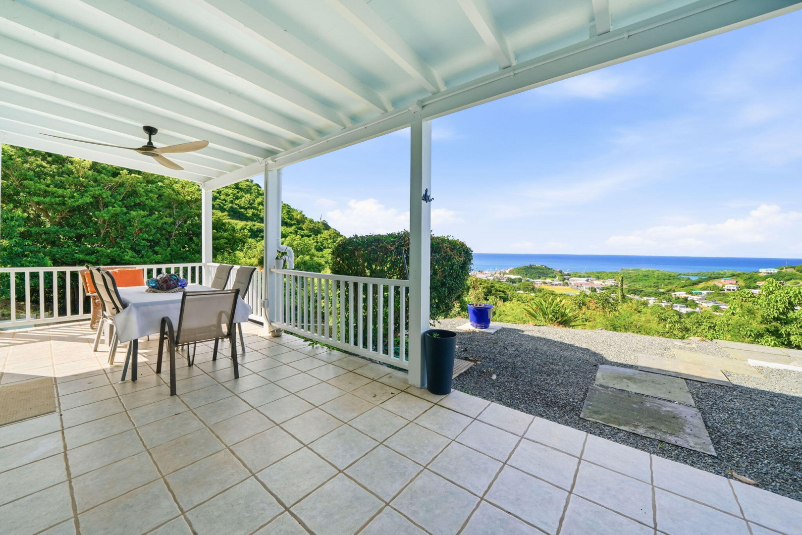 Spectacular sea views overlooking Gallows Bay all the way to St. Thomas and St. John. Great space for indoor/outdoor entertaining, or soak in the privacy as you dine al fresco or relax on the covered patio enjoying the soft sea breezes and the serenity of passing sailboats. Beautiful built in woodwork adds rich, tropical flair with a mahogany bar gracing the kitchen to dining room pass through, a built-in in desk in a bedroom currently used as an office, and beamed, vaulted ceilings in the open living and dining areas. Solar panels and batteries keep electric costs low. The 0.7 acre yard is partially fenced with a mature cashew tree, mango, baobab, carambola, banana, soursop, sugar apple, Caribbean cherry and a terraced garden with starts of rosemary, basil, garlic chive, and pineapple.