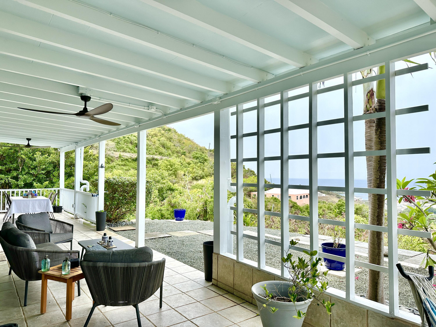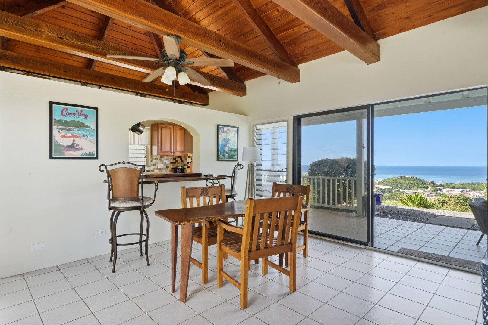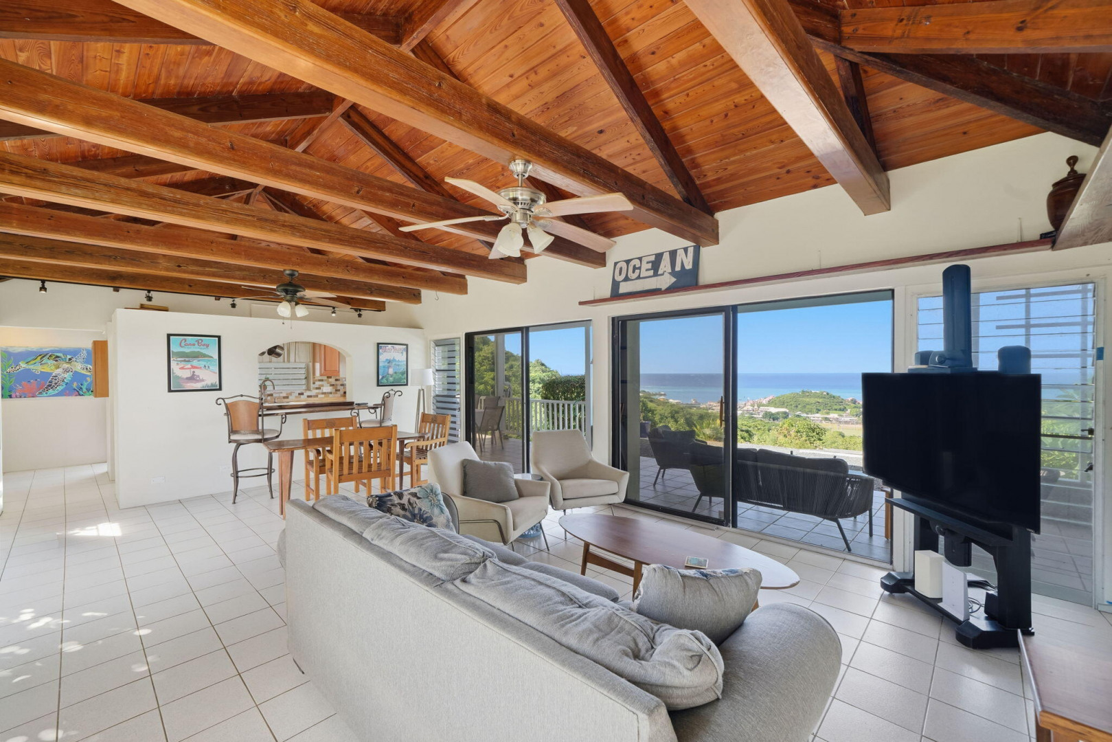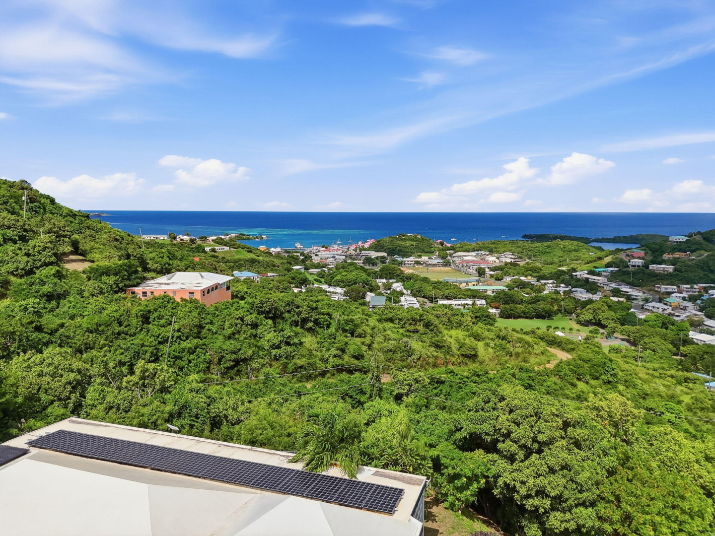Spectacular sea views overlooking Gallows Bay all the way to St. Thomas and St. John. Great space for indoor/outdoor entertaining, or soak in the privacy as you dine al fresco or relax on the covered patio enjoying the soft sea breezes and the serenity of passing sailboats. Beautiful built in woodwork adds rich, tropical flair with a mahogany bar gracing the kitchen to dining room pass through, a built-in in desk in a bedroom currently used as an office, and beamed, vaulted ceilings in the open living and dining areas. Solar panels and batteries keep electric costs low. The 0.7 acre yard is partially fenced with a mature cashew tree, mango, baobab, carambola, banana, soursop, sugar apple, Caribbean cherry and a terraced garden with starts of rosemary, basil, garlic chive, and pineapple.