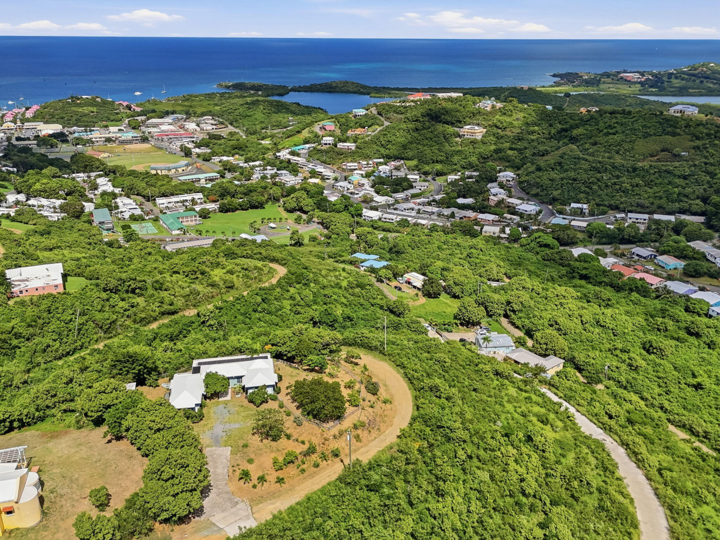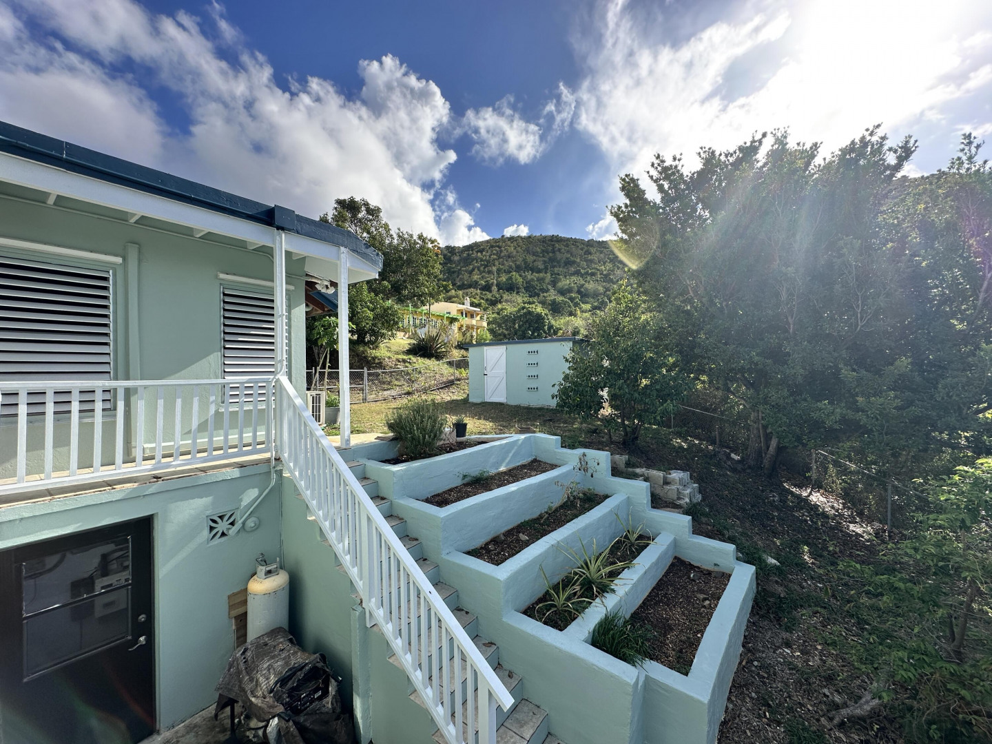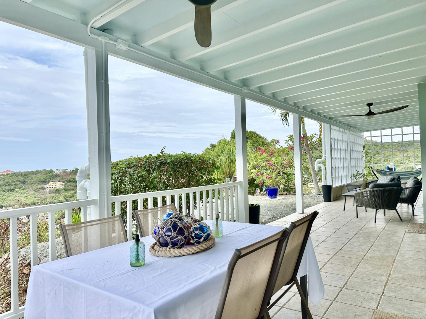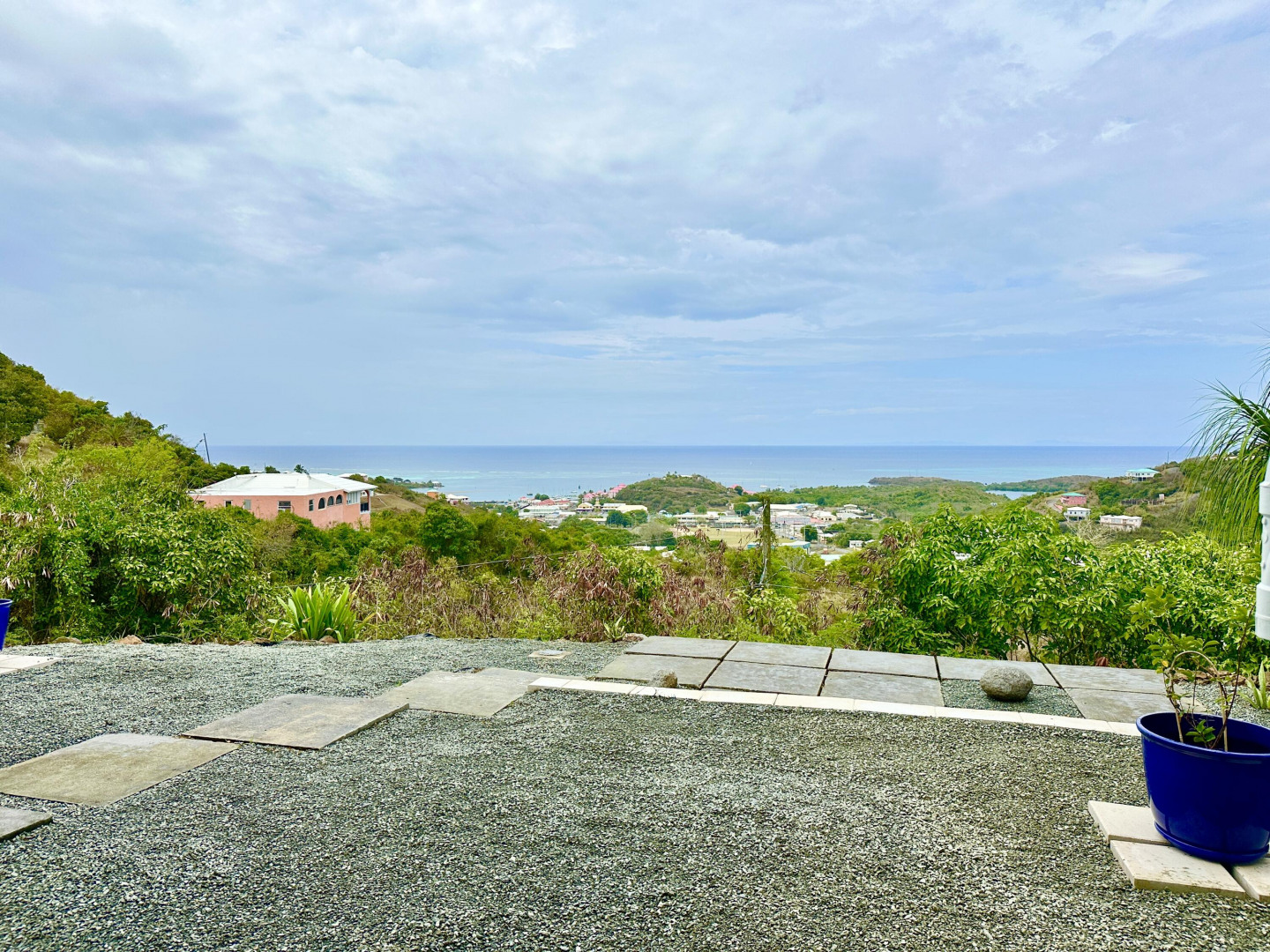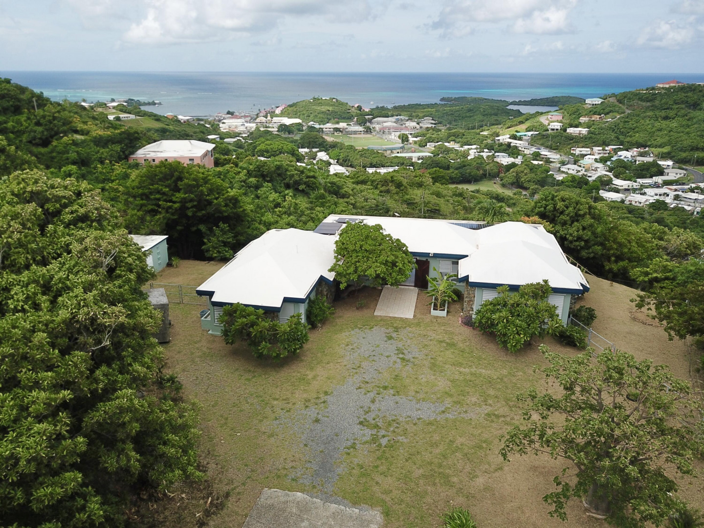 Spectacular sea views overlooking Gallows Bay all the way to St. Thomas and St. John. Great space for indoor/outdoor entertaining, or soak in the privacy as you dine al fresco or relax on the covered patio enjoying the soft sea breezes and the serenity of passing sailboats. Beautiful built in woodwork adds rich, tropical flair with a mahogany bar gracing the kitchen to dining room pass through, a built-in in desk in a bedroom currently used as an office, and beamed, vaulted ceilings in the open living and dining areas. Solar panels and batteries keep electric costs low. The 0.7 acre yard is partially fenced with a mature cashew tree, mango, baobab, carambola, banana, soursop, sugar apple, Caribbean cherry and a terraced garden with starts of rosemary, basil, garlic chive, and pineapple.