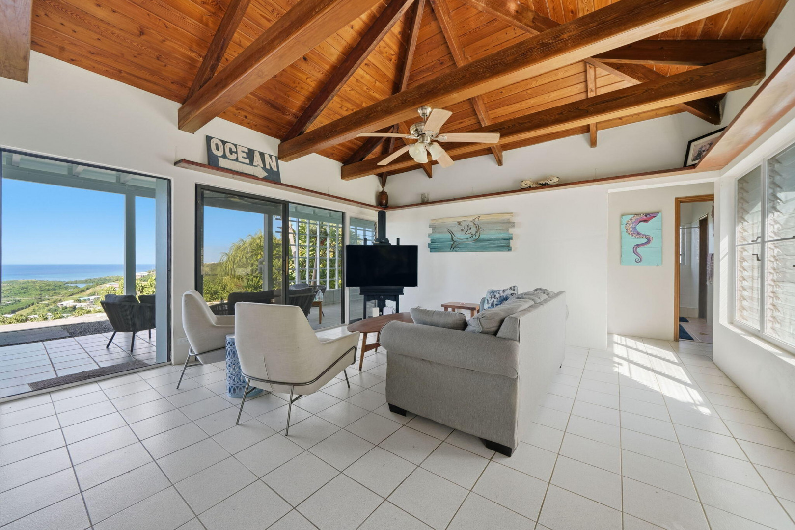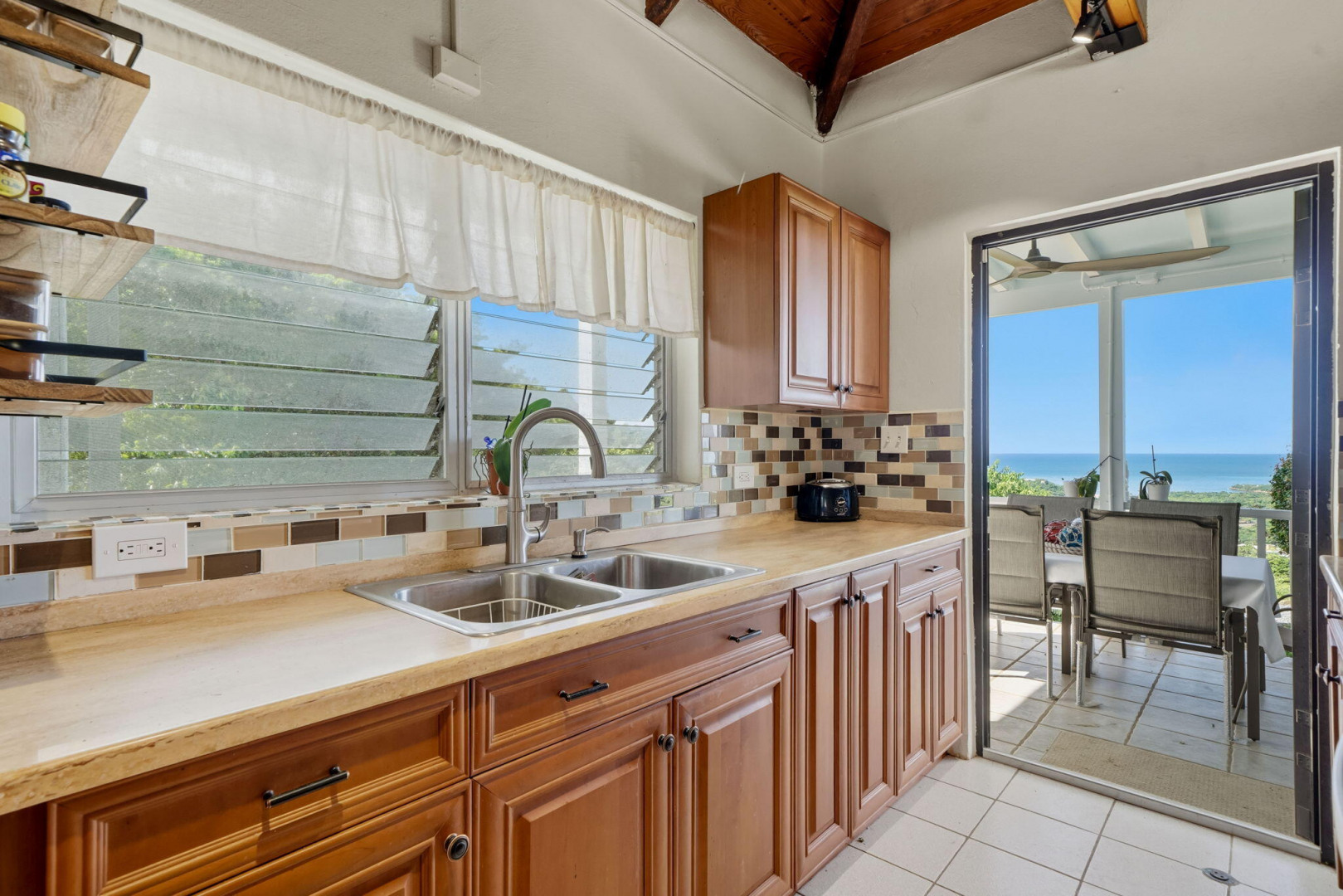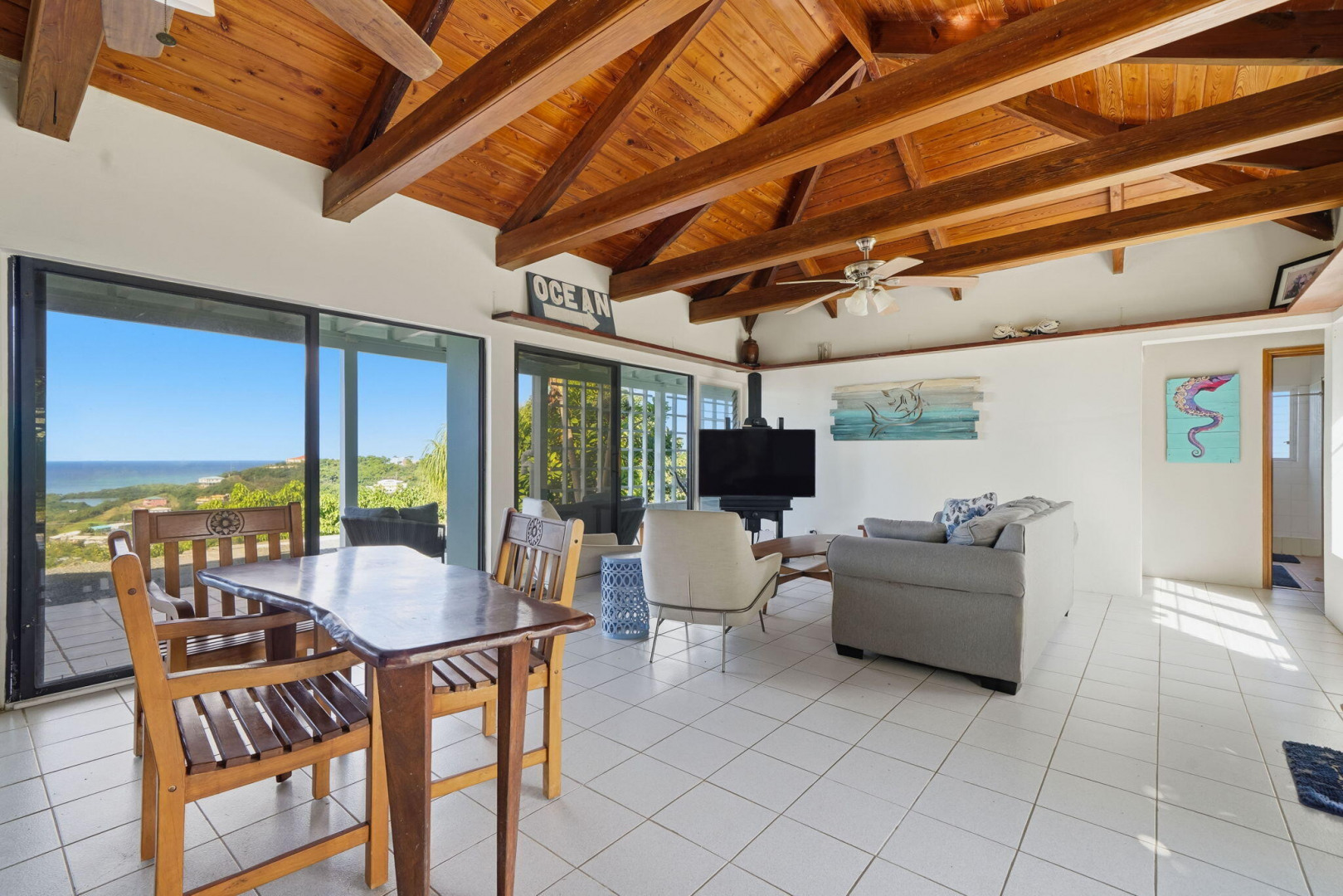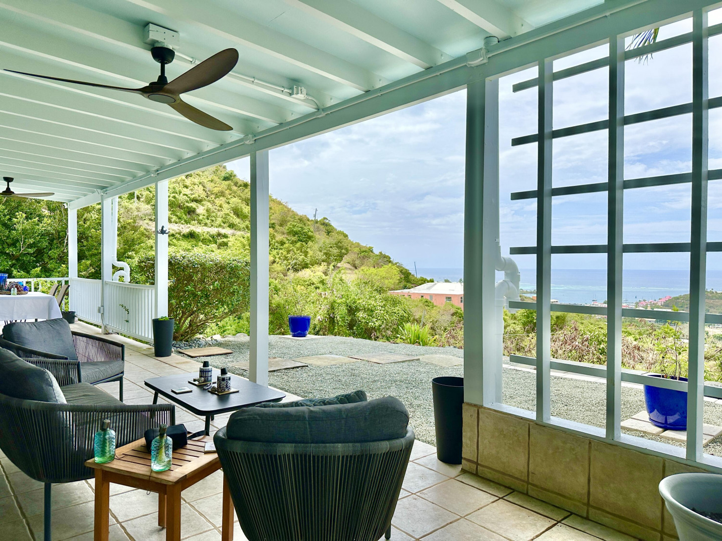 Spectacular sea views overlooking Gallows Bay all the way to St. Thomas and St. John. Great space for indoor/outdoor entertaining, or soak in the privacy as you dine al fresco or relax on the covered patio enjoying the soft sea breezes and the serenity of passing sailboats. Beautiful built in woodwork adds rich, tropical flair with a mahogany bar gracing the kitchen to dining room pass through, a built-in in desk in a bedroom currently used as an office, and beamed, vaulted ceilings in the open living and dining areas. Solar panels and batteries keep electric costs low. The 0.7 acre yard is partially fenced with a mature cashew tree, mango, baobab, carambola, banana, soursop, sugar apple, Caribbean cherry and a terraced garden with starts of rosemary, basil, garlic chive, and pineapple.