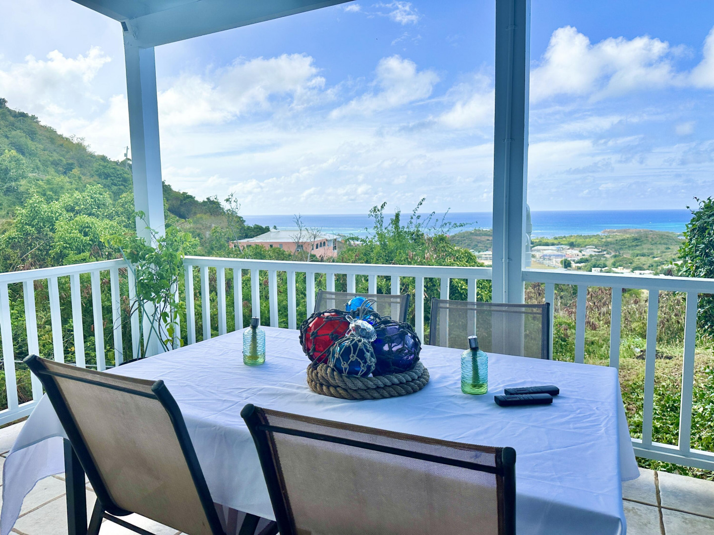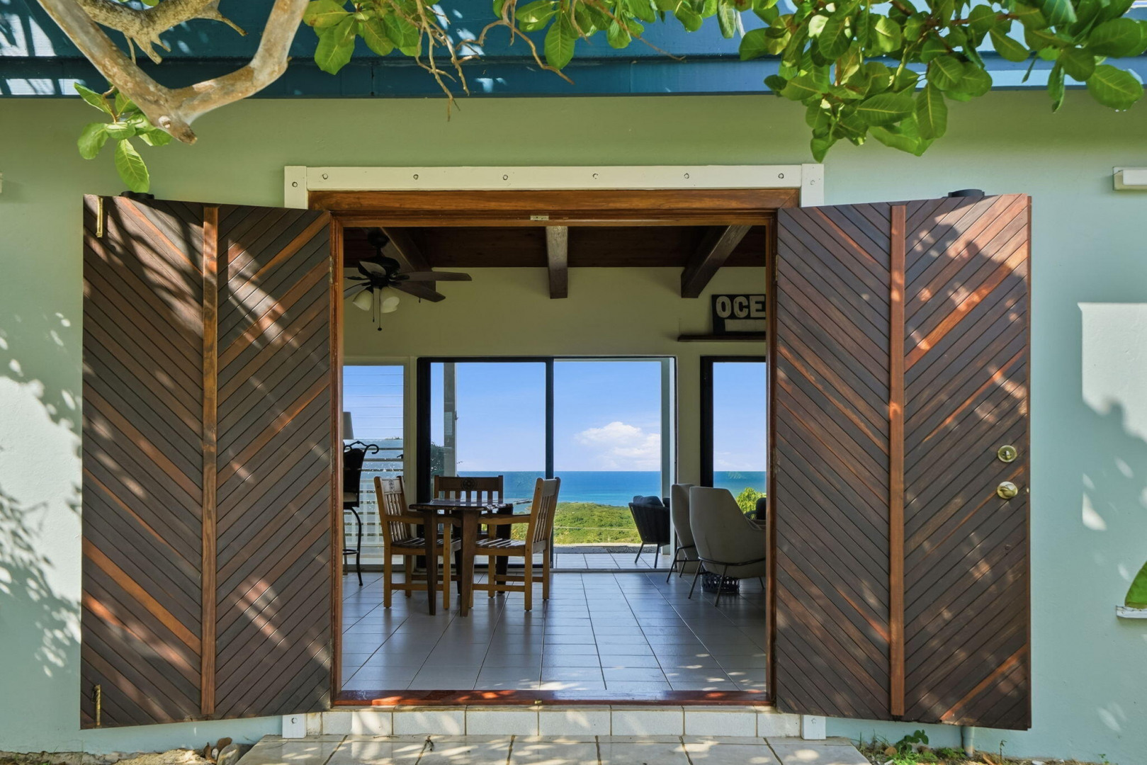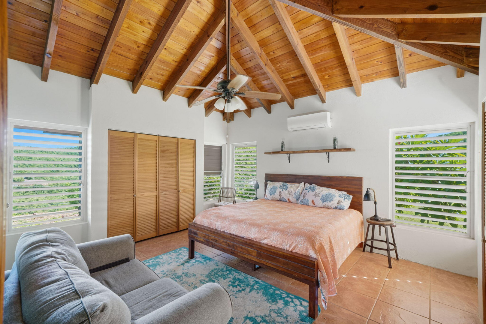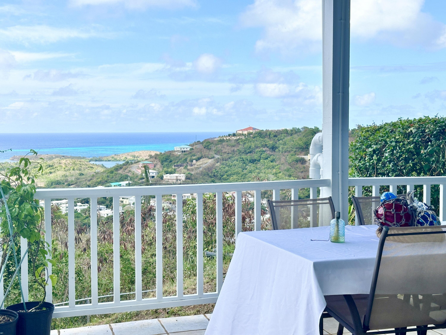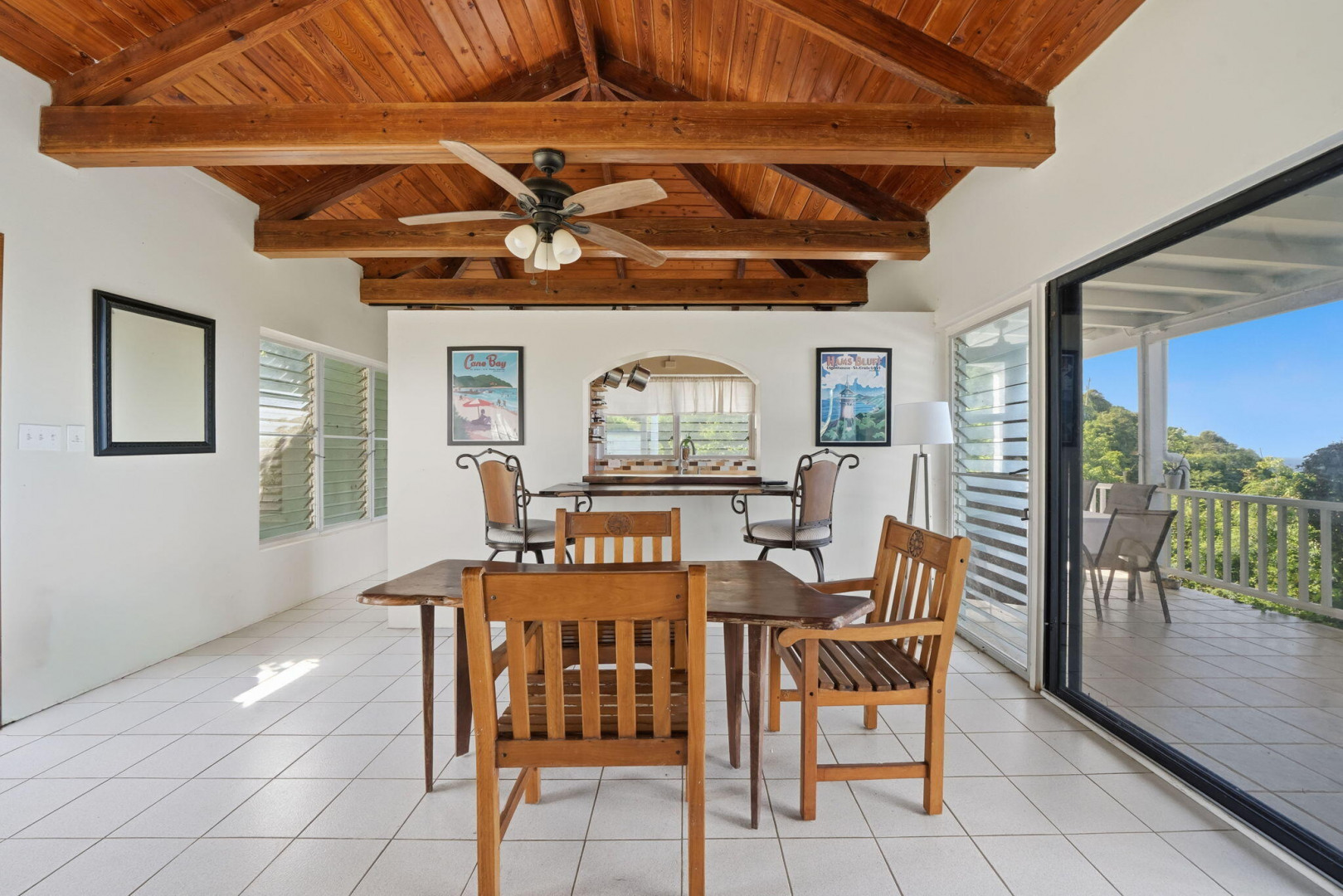 Spectacular sea views overlooking Gallows Bay all the way to St. Thomas and St. John. Great space for indoor/outdoor entertaining, or soak in the privacy as you dine al fresco or relax on the covered patio enjoying the soft sea breezes and the serenity of passing sailboats. Beautiful built in woodwork adds rich, tropical flair with a mahogany bar gracing the kitchen to dining room pass through, a built-in in desk in a bedroom currently used as an office, and beamed, vaulted ceilings in the open living and dining areas. Solar panels and batteries keep electric costs low. The 0.7 acre yard is partially fenced with a mature cashew tree, mango, baobab, carambola, banana, soursop, sugar apple, Caribbean cherry and a terraced garden with starts of rosemary, basil, garlic chive, and pineapple.
