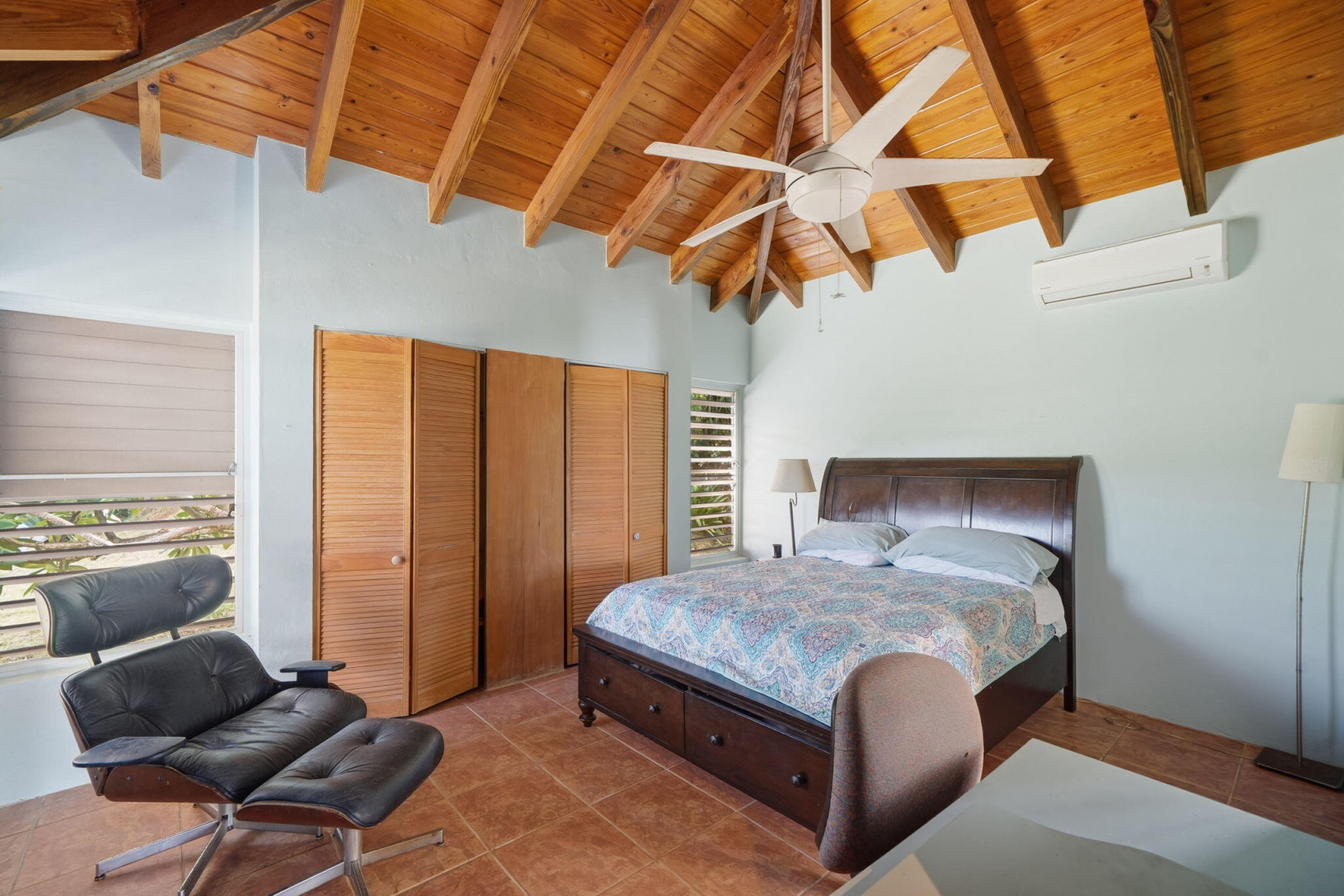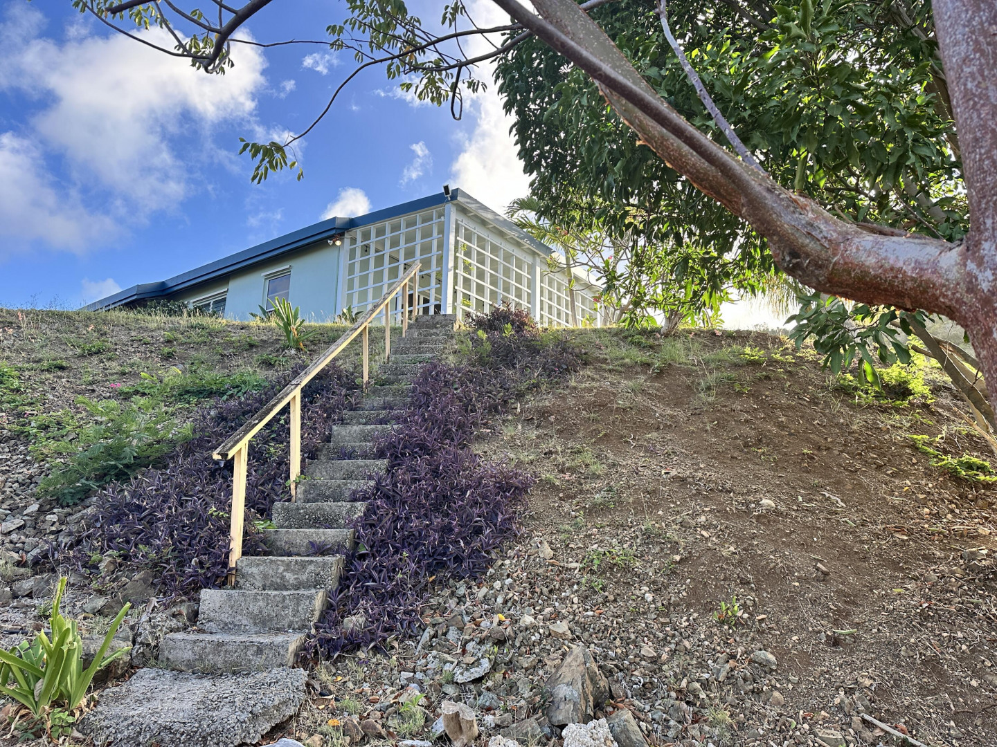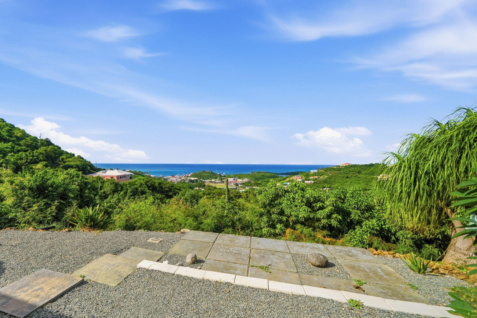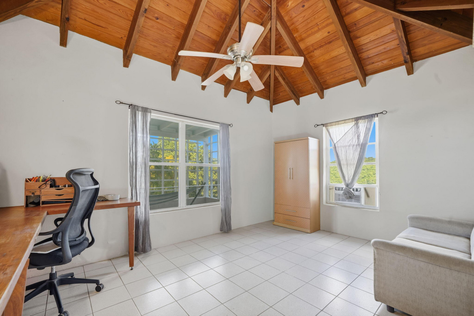 Spectacular sea views overlooking Gallows Bay all the way to St. Thomas and St. John. Great space for indoor/outdoor entertaining, or soak in the privacy as you dine al fresco or relax on the covered patio enjoying the soft sea breezes and the serenity of passing sailboats. Beautiful built in woodwork adds rich, tropical flair with a mahogany bar gracing the kitchen to dining room pass through, a built-in in desk in a bedroom currently used as an office, and beamed, vaulted ceilings in the open living and dining areas. Solar panels and batteries keep electric costs low. The 0.7 acre yard is partially fenced with a mature cashew tree, mango, baobab, carambola, banana, soursop, sugar apple, Caribbean cherry and a terraced garden with starts of rosemary, basil, garlic chive, and pineapple.