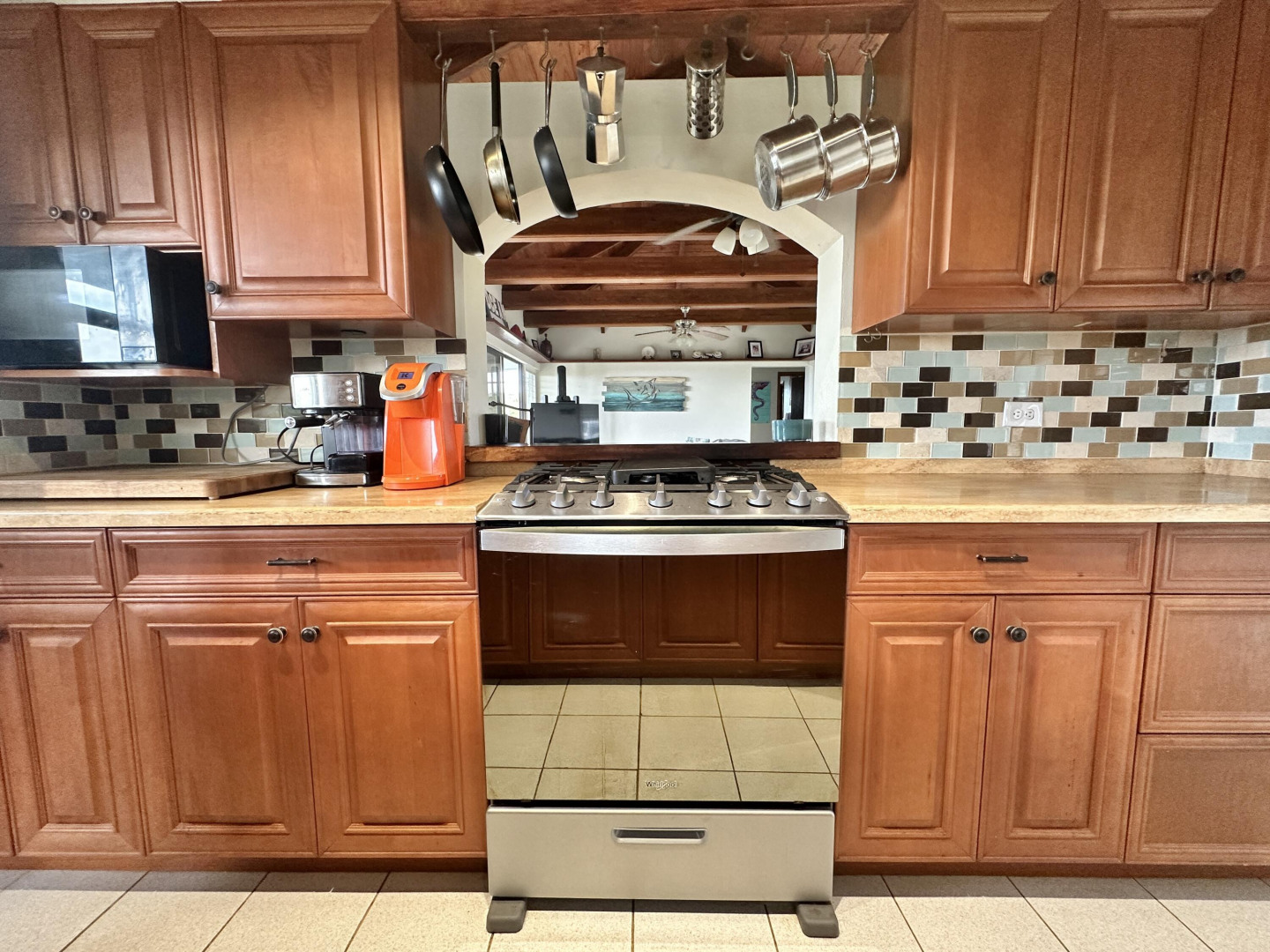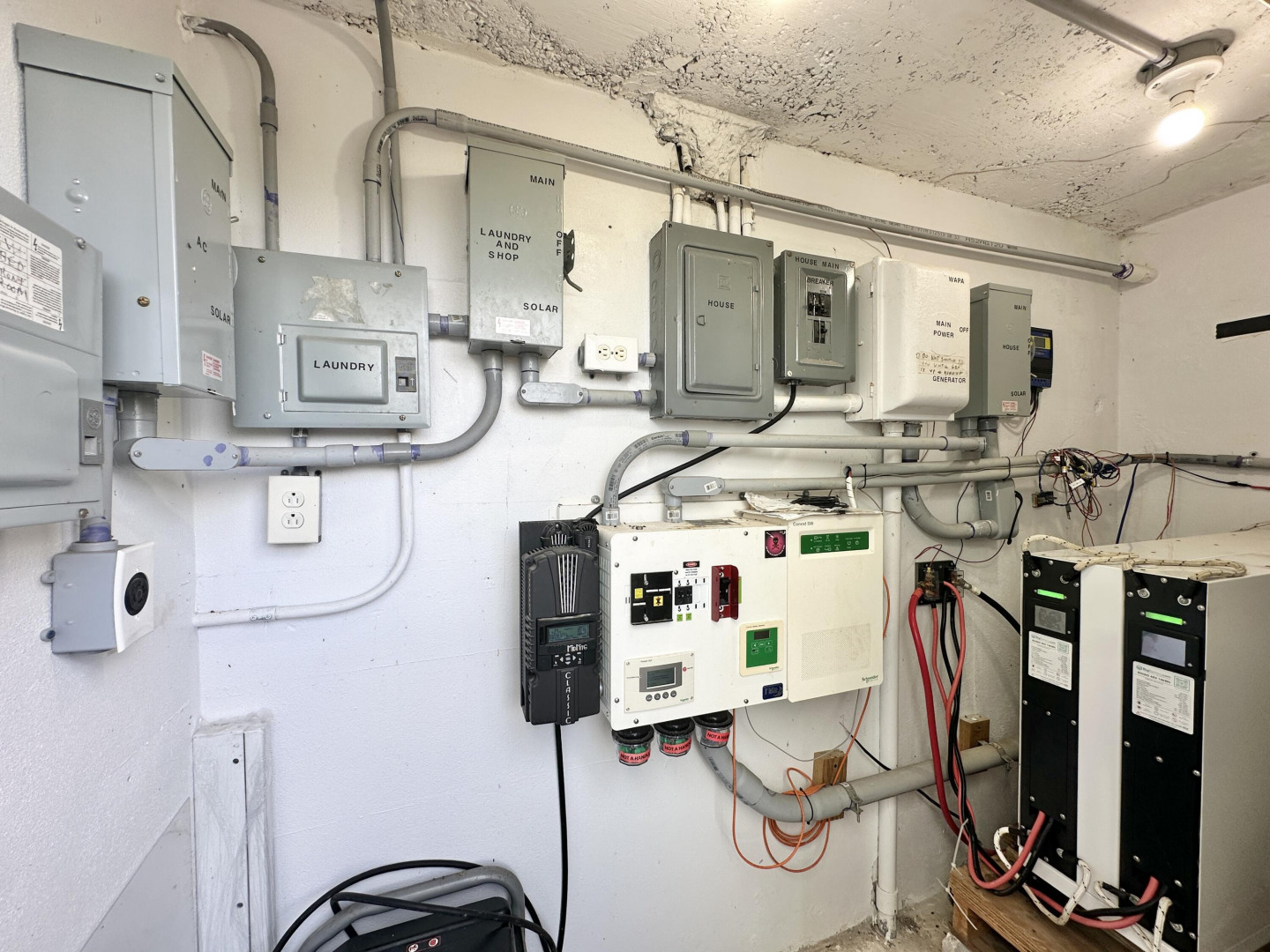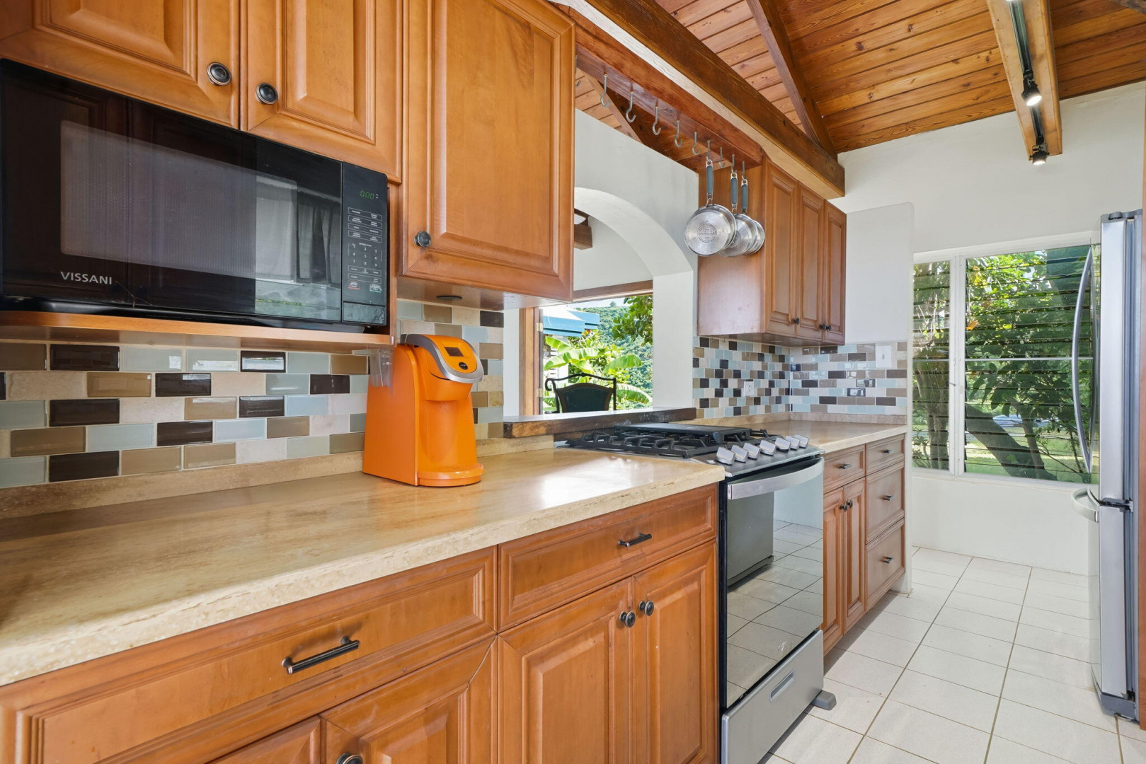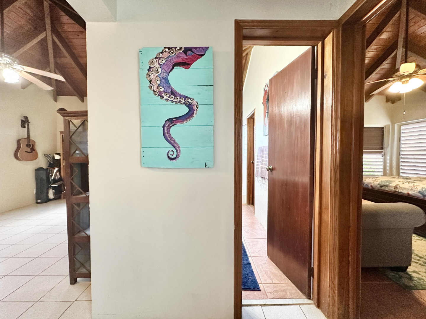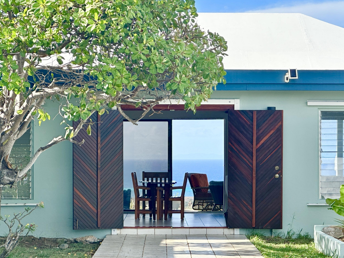 Spectacular sea views overlooking Gallows Bay all the way to St. Thomas and St. John. Great space for indoor/outdoor entertaining, or soak in the privacy as you dine al fresco or relax on the covered patio enjoying the soft sea breezes and the serenity of passing sailboats. Beautiful built in woodwork adds rich, tropical flair with a mahogany bar gracing the kitchen to dining room pass through, a built-in in desk in a bedroom currently used as an office, and beamed, vaulted ceilings in the open living and dining areas. Solar panels and batteries keep electric costs low. The 0.7 acre yard is partially fenced with a mature cashew tree, mango, baobab, carambola, banana, soursop, sugar apple, Caribbean cherry and a terraced garden with starts of rosemary, basil, garlic chive, and pineapple.