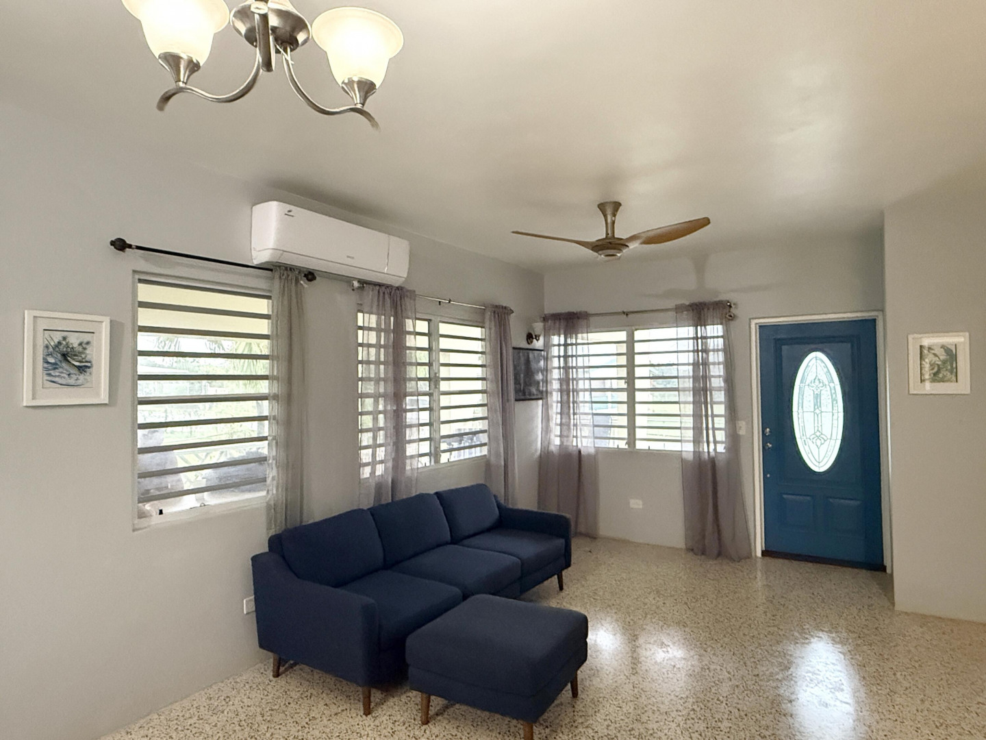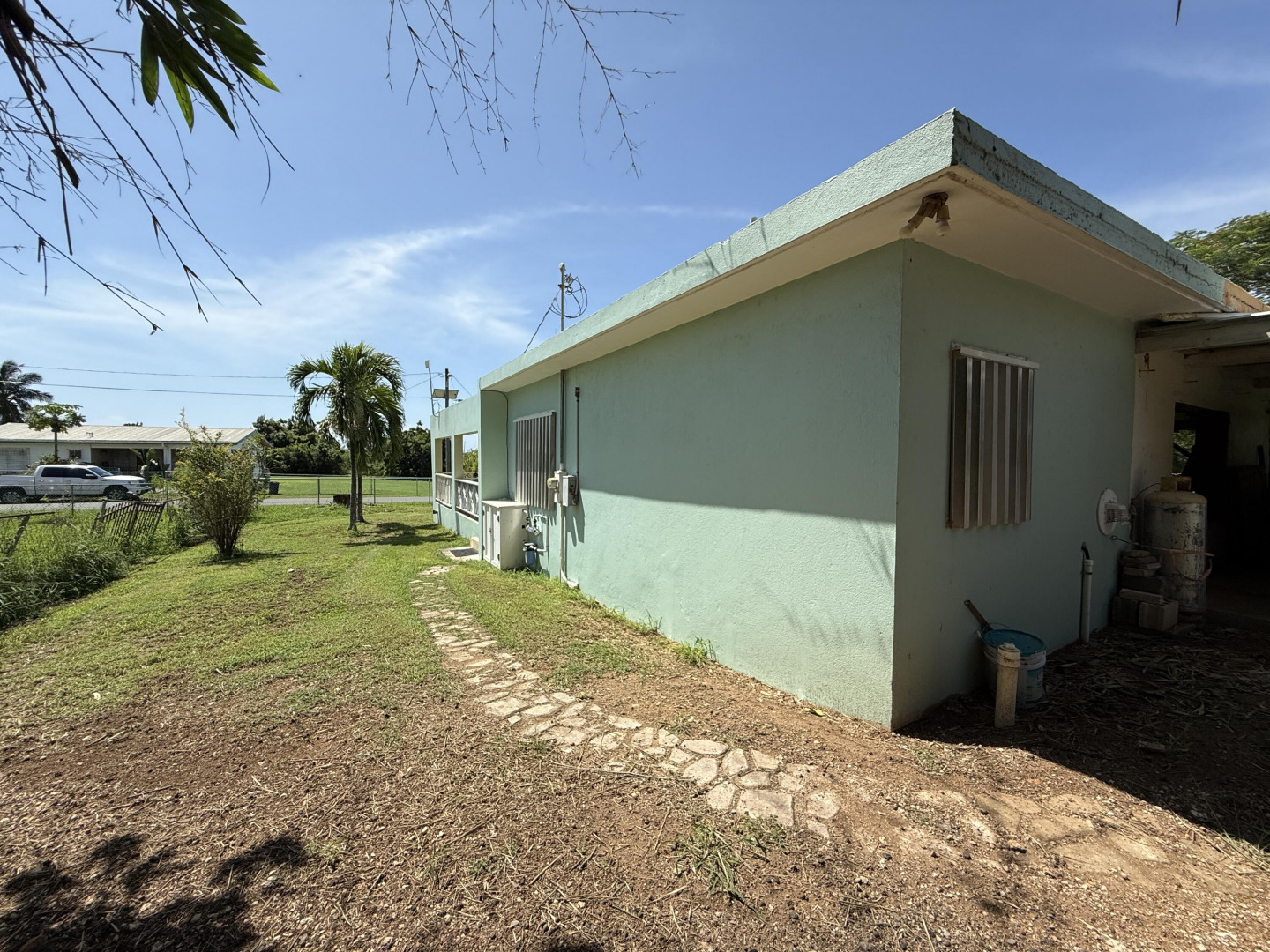 Lovely home in a nice, convenient West End neighborhood. The kitchen and baths of this mid century modern home have been nicely renovated. New windows and A/C were just installed, and the wonderful terrazzo floors have been refinished. Solar hot water, new water pump and UV purification. Six solar panels with marine batteries. Enjoy fruit trees galore in this great yard with mature coconut palms, pomegranate, starfruit, avacado, guava and noni. Convenient to Frederiksted and beautiful West End beaches, with good roads and easy access to the highway. Carport and bonus covered space offer flexibility to easily build out. Take advantage of the peek-a-boo sea views from the concrete roof by installing a sun deck, or the large slightly elevated back yard by building another home here!