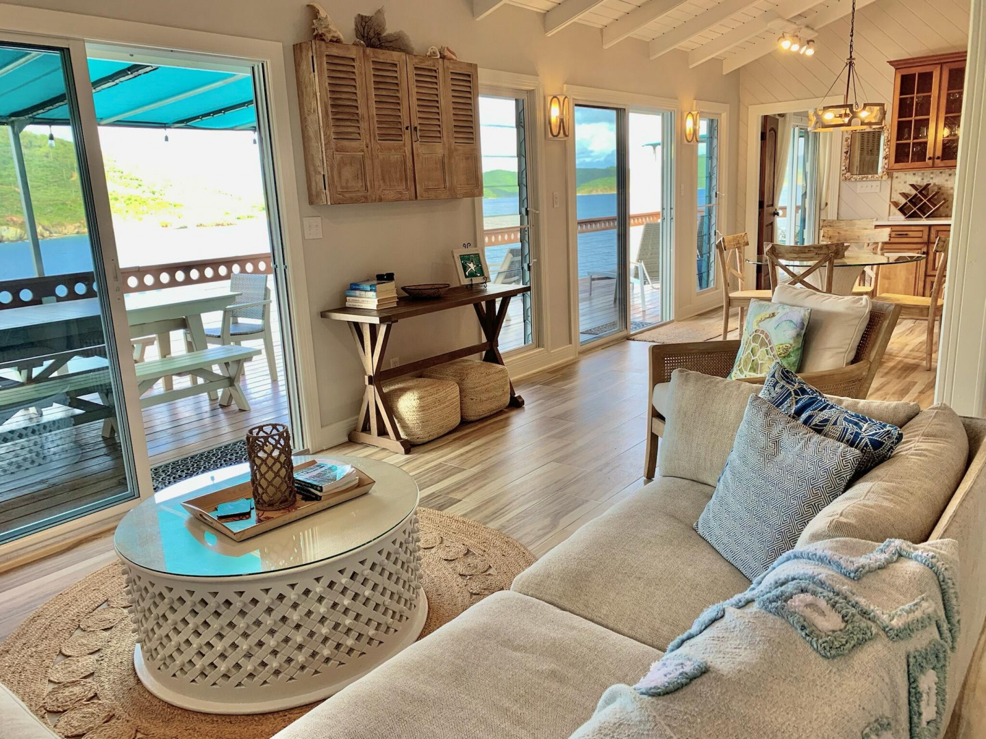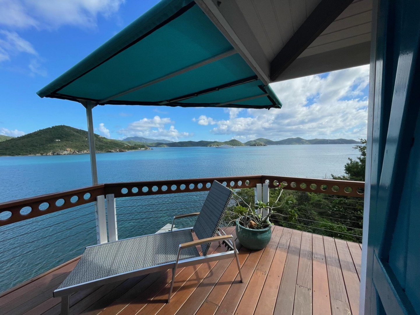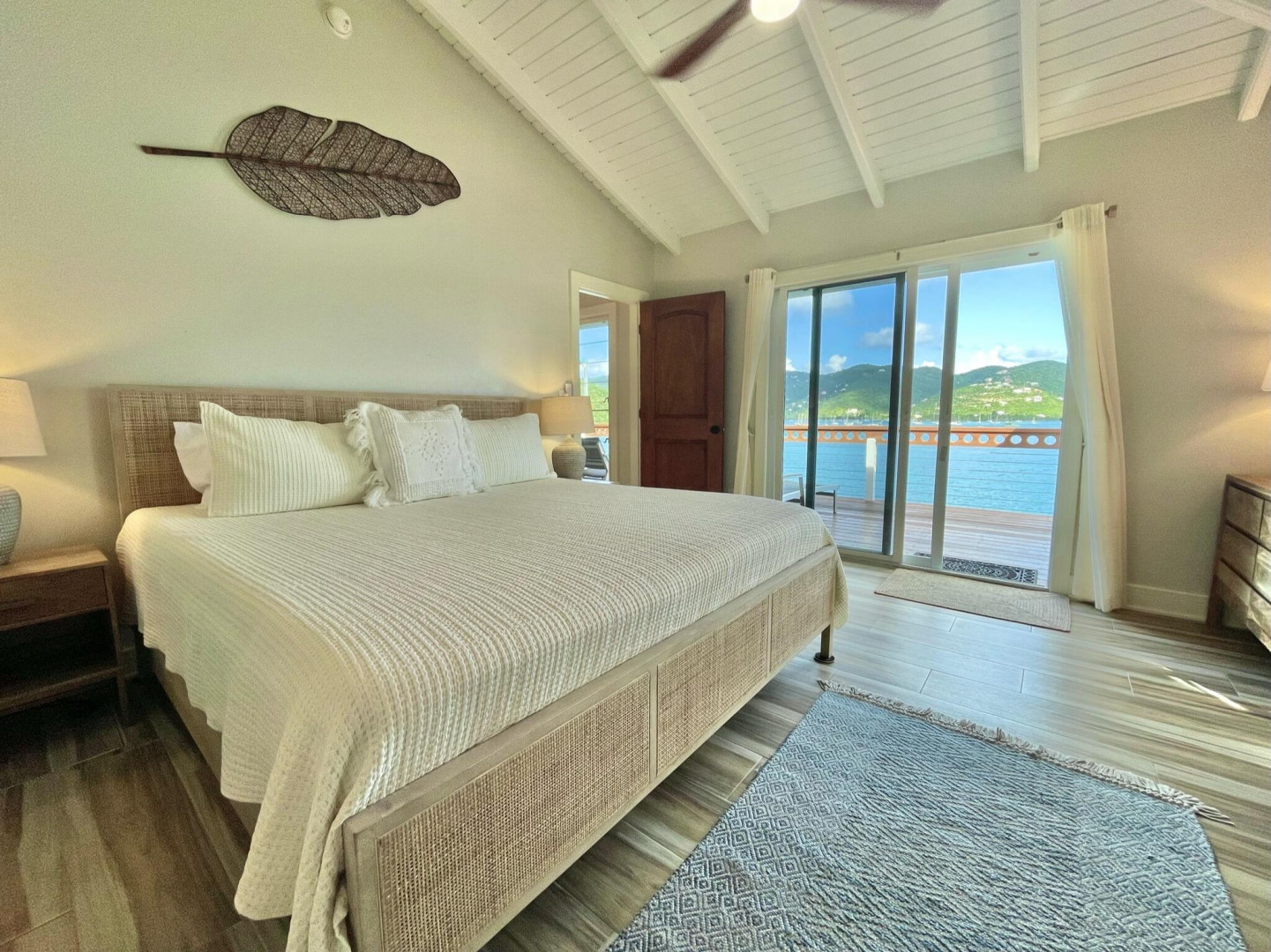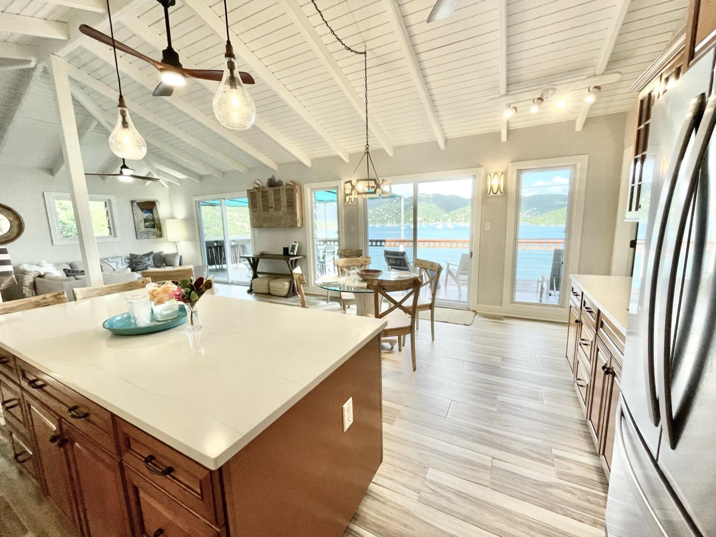 It's hard to put a value on being oceanfront to the clear Caribbean Sea and the enjoyment and peace of 225 degree unobstructed views. To sit above the ocean at Cliffhanger is something that simply has to be seen to be appreciated. Couple that with a stylish and modern designed fully turn-key beach house that is an extremely popular and successful rental and you can stop your search for your affordable dream house on St John. Newly added solar and Tesla battery system, coupled with all of the amenities, you can step in this villa which has been updated with new tile floors accented with driftwood and rattans, shades of blues and soft grays against the clean white quartz countertops. The bright new look and modern furnishings are all center stage for the big blue ocean backdrop.