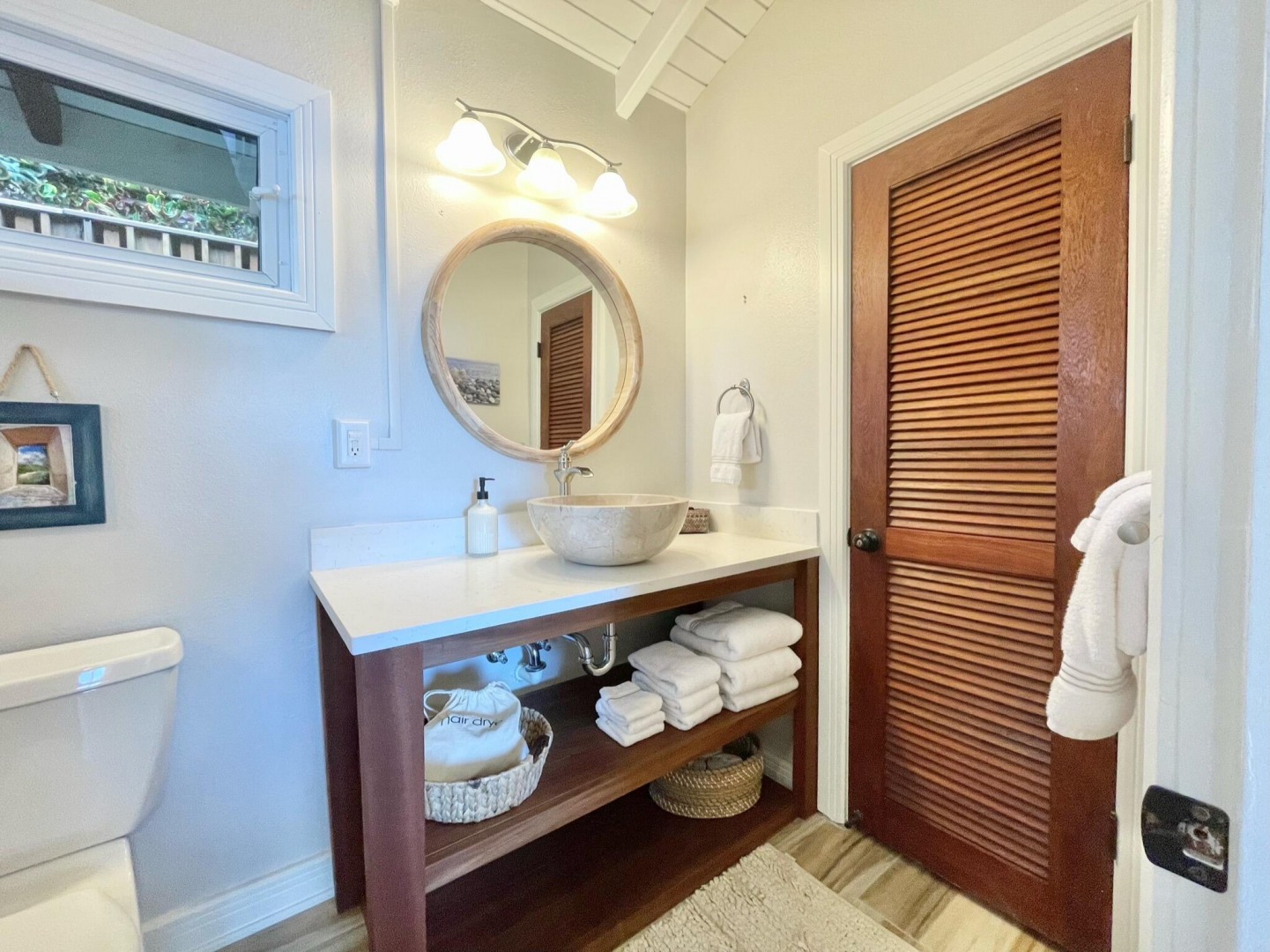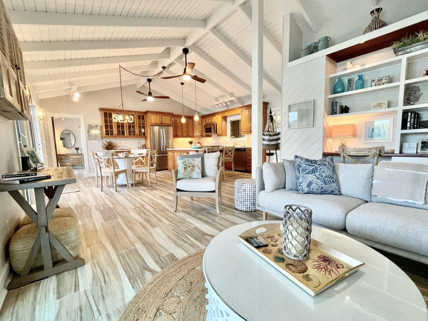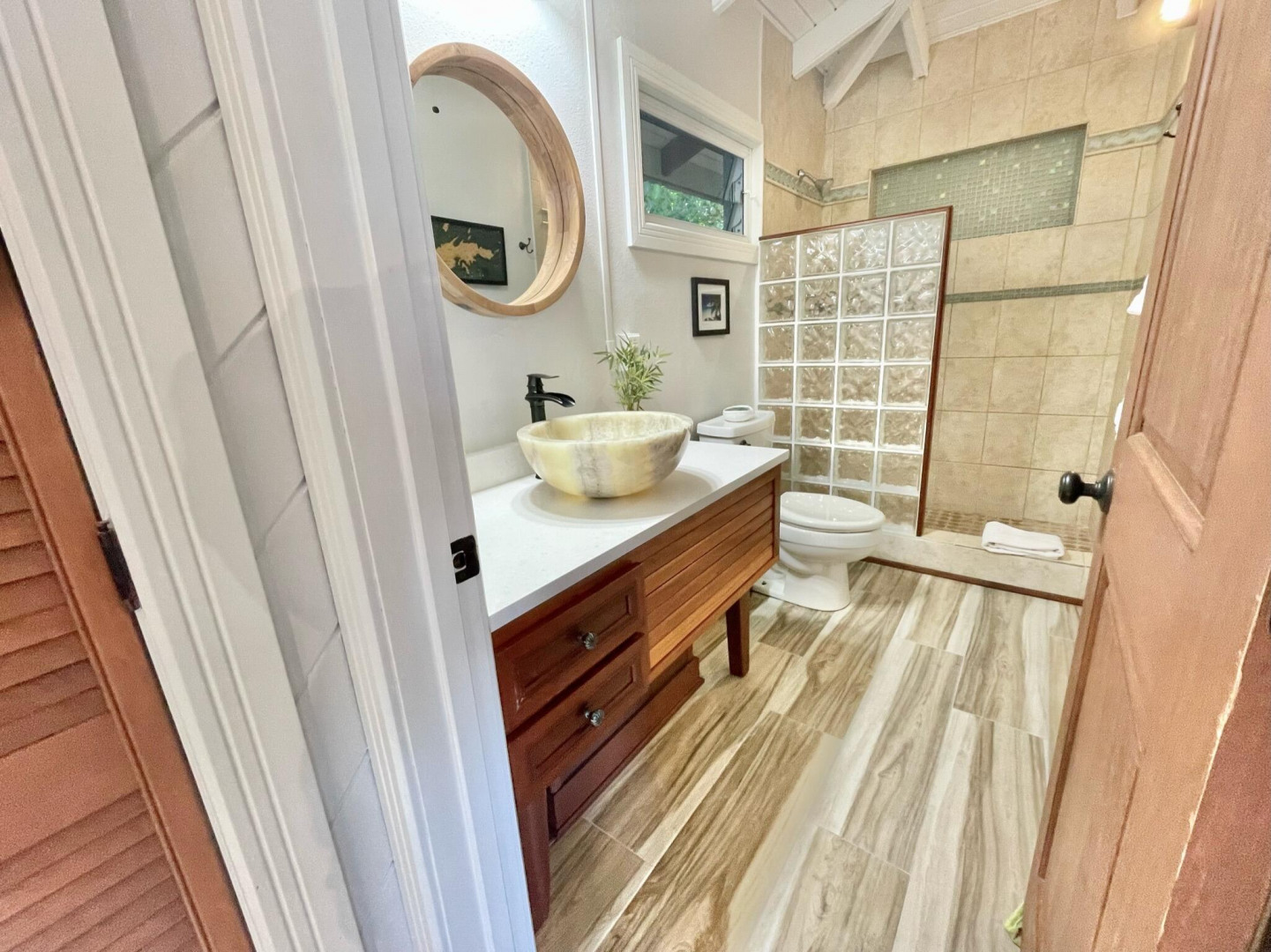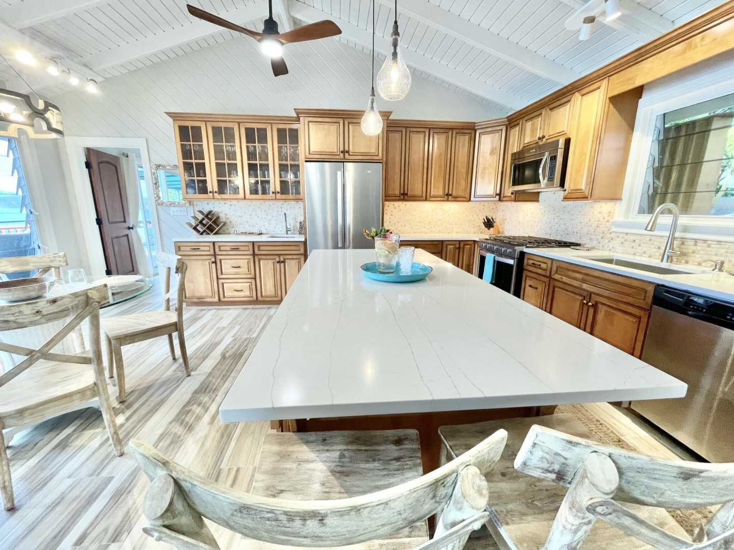 It's hard to put a value on being oceanfront to the clear Caribbean Sea and the enjoyment and peace of 225 degree unobstructed views. To sit above the ocean at Cliffhanger is something that simply has to be seen to be appreciated. Couple that with a stylish and modern designed fully turn-key beach house that is an extremely popular and successful rental and you can stop your search for your affordable dream house on St John. Newly added solar and Tesla battery system, coupled with all of the amenities, you can step in this villa which has been updated with new tile floors accented with driftwood and rattans, shades of blues and soft grays against the clean white quartz countertops. The bright new look and modern furnishings are all center stage for the big blue ocean backdrop.