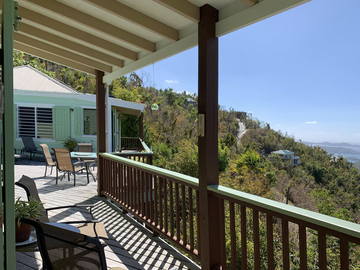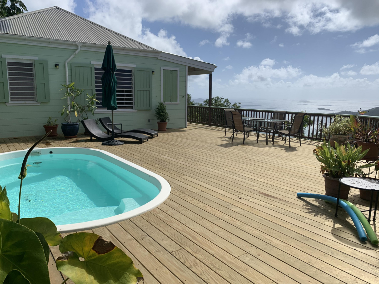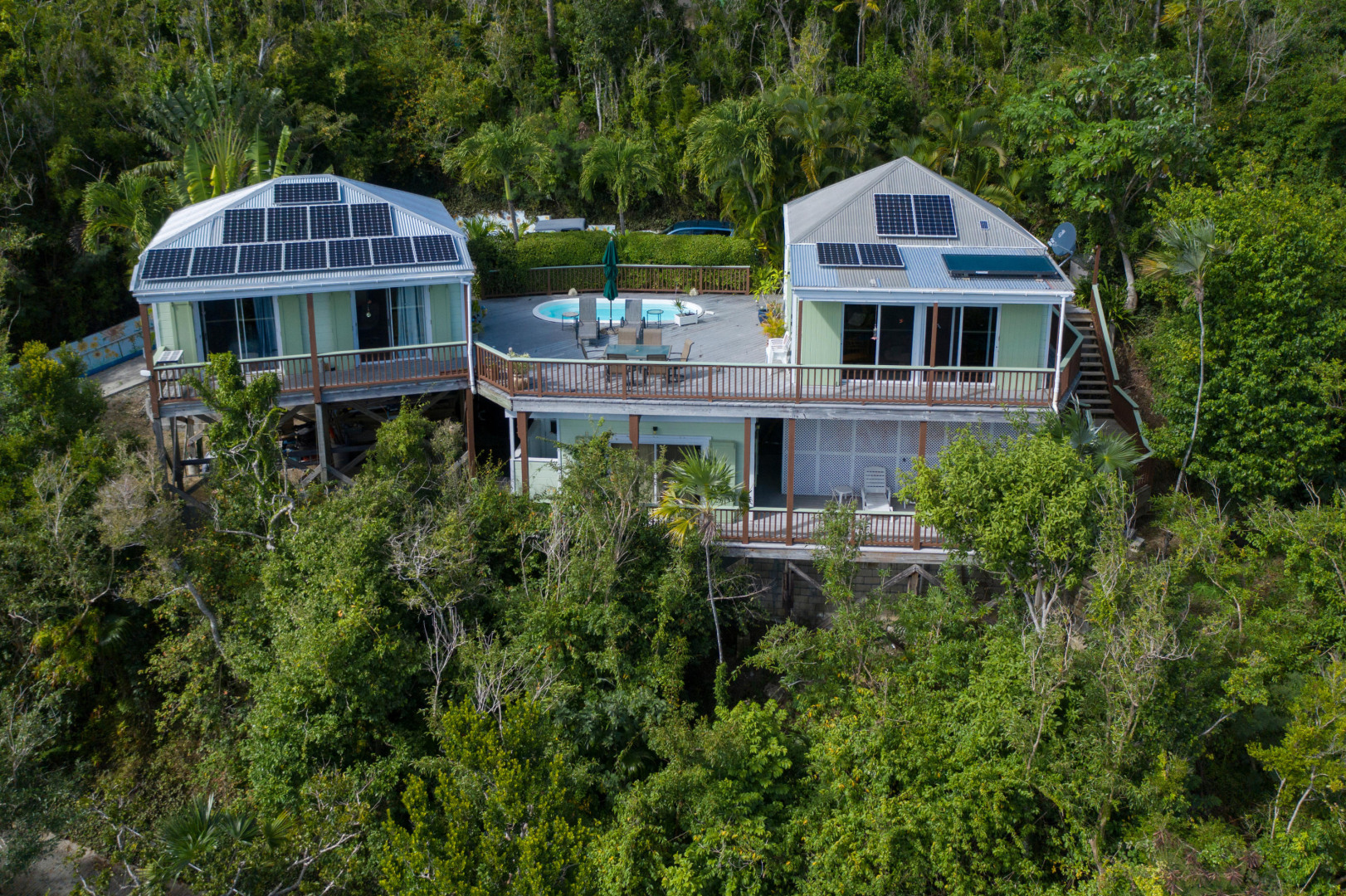 Caribbean style home in a lush, private setting with breath-taking ocean and mountain views. Located high on Ajax Peak just a short drive to Coral Bay or the famed National Park beaches. This wood frame withstood two Cat5 hurricanes perfectly; with full hurricane shutters, solar net metering and a Tesla Powerwall that provides backup power within seconds of an outage. Layout consists of a main living area and building with two bedrooms on one level joined together by a pool and NEW deck. The lower level is a gracious guest bedroom suite and a large workshop area that could be converted to additional living space, a bedroom or a garage. Sunflower villa is the perfect turn key package...short term rental, solar, excellent location, views & pool!!