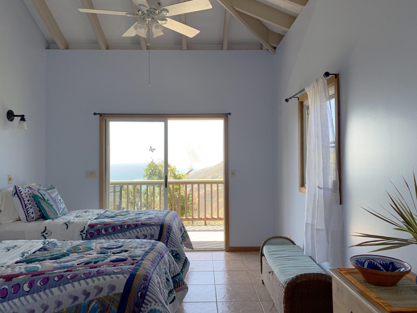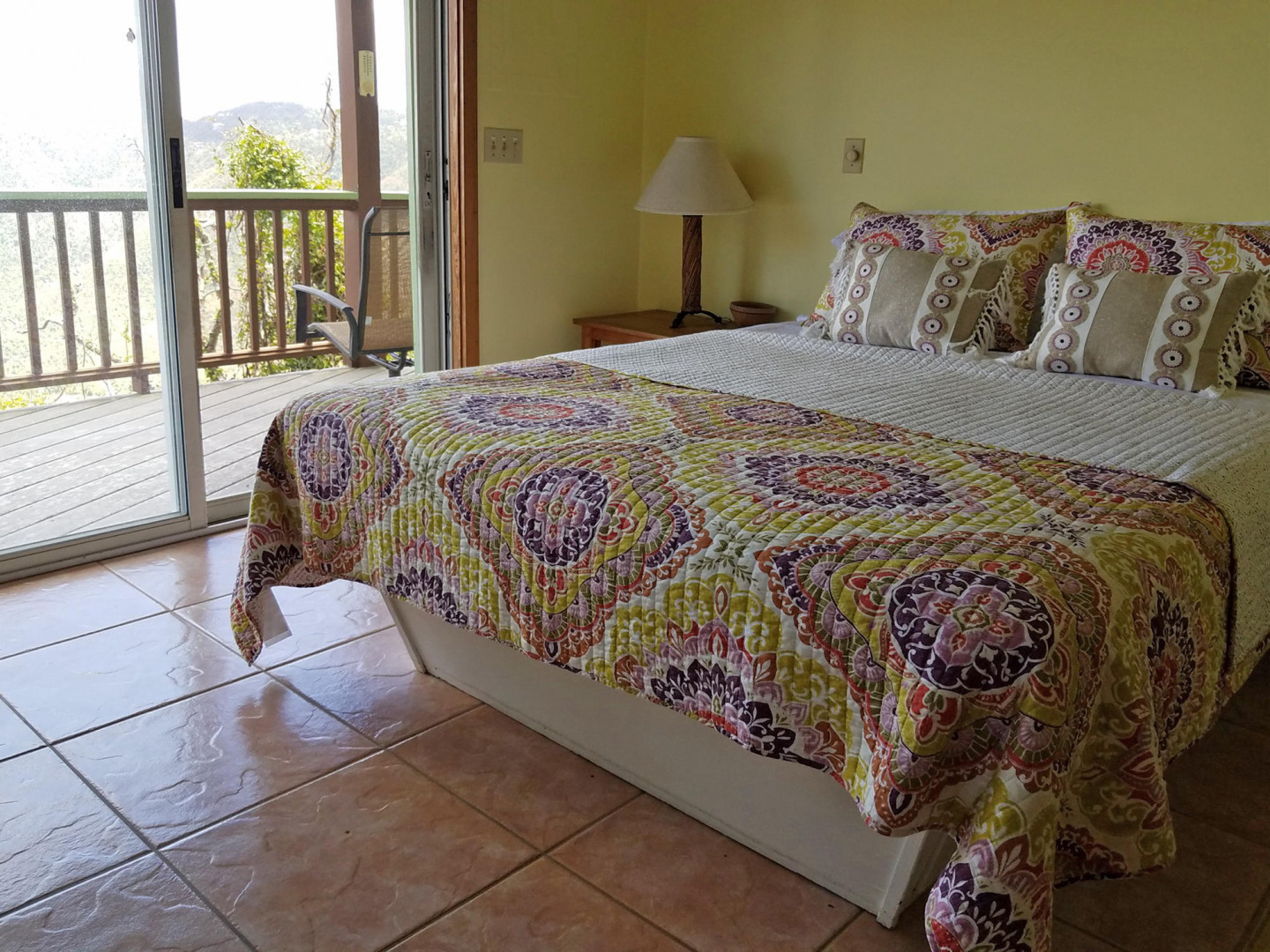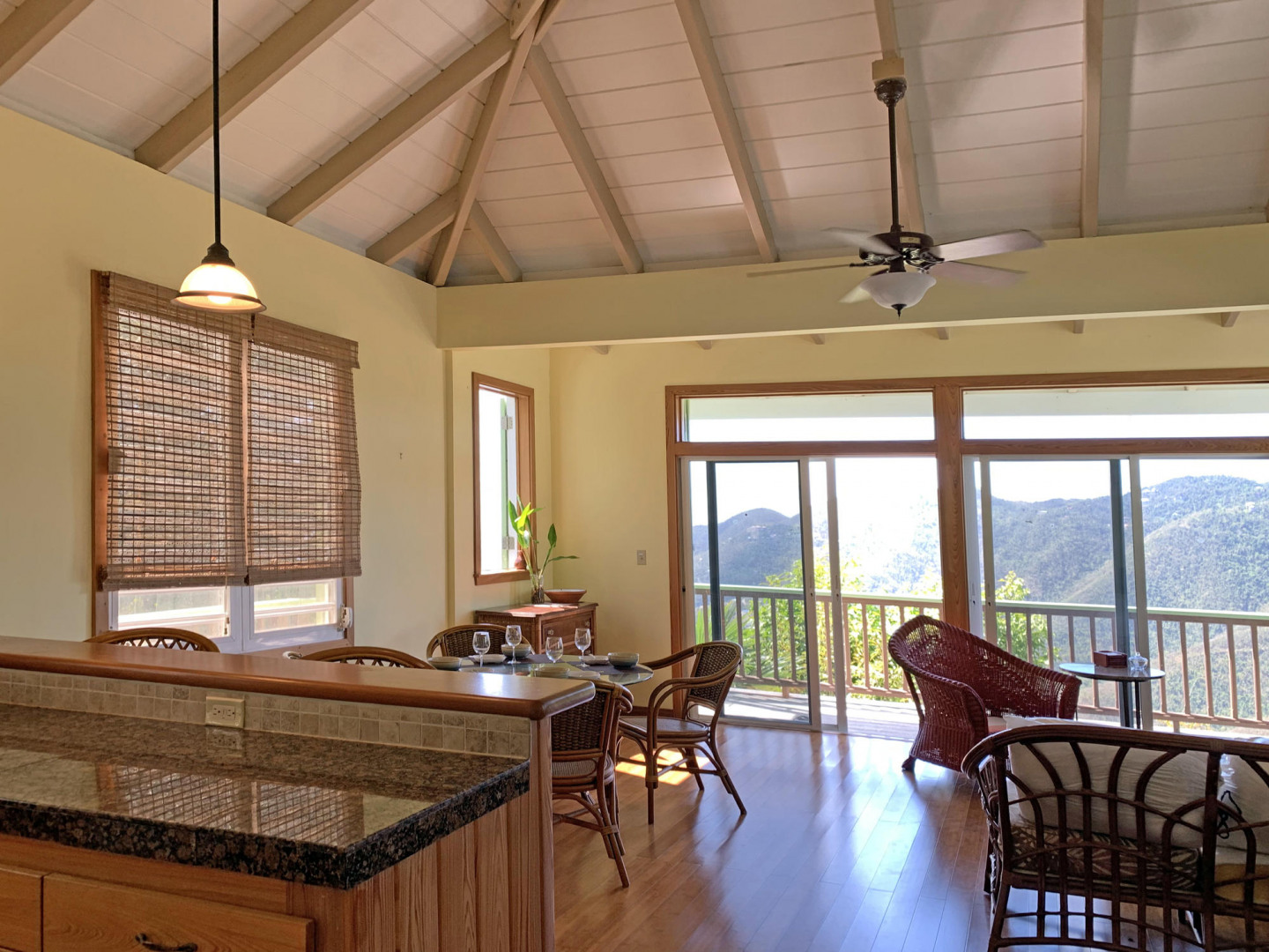 Caribbean style home in a lush, private setting with breath-taking ocean and mountain views. Located high on Ajax Peak just a short drive to Coral Bay or the famed National Park beaches. This wood frame withstood two Cat5 hurricanes perfectly; with full hurricane shutters, solar net metering and a Tesla Powerwall that provides backup power within seconds of an outage. Layout consists of a main living area and building with two bedrooms on one level joined together by a pool and NEW deck. The lower level is a gracious guest bedroom suite and a large workshop area that could be converted to additional living space, a bedroom or a garage. Sunflower villa is the perfect turn key package...short term rental, solar, excellent location, views & pool!!