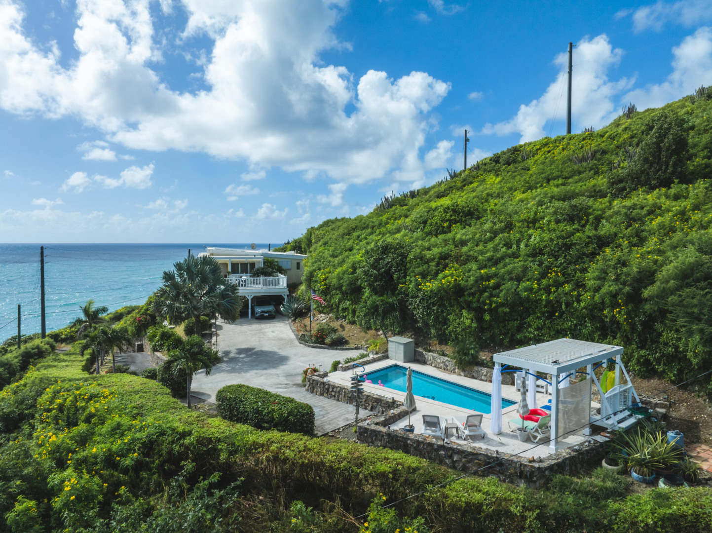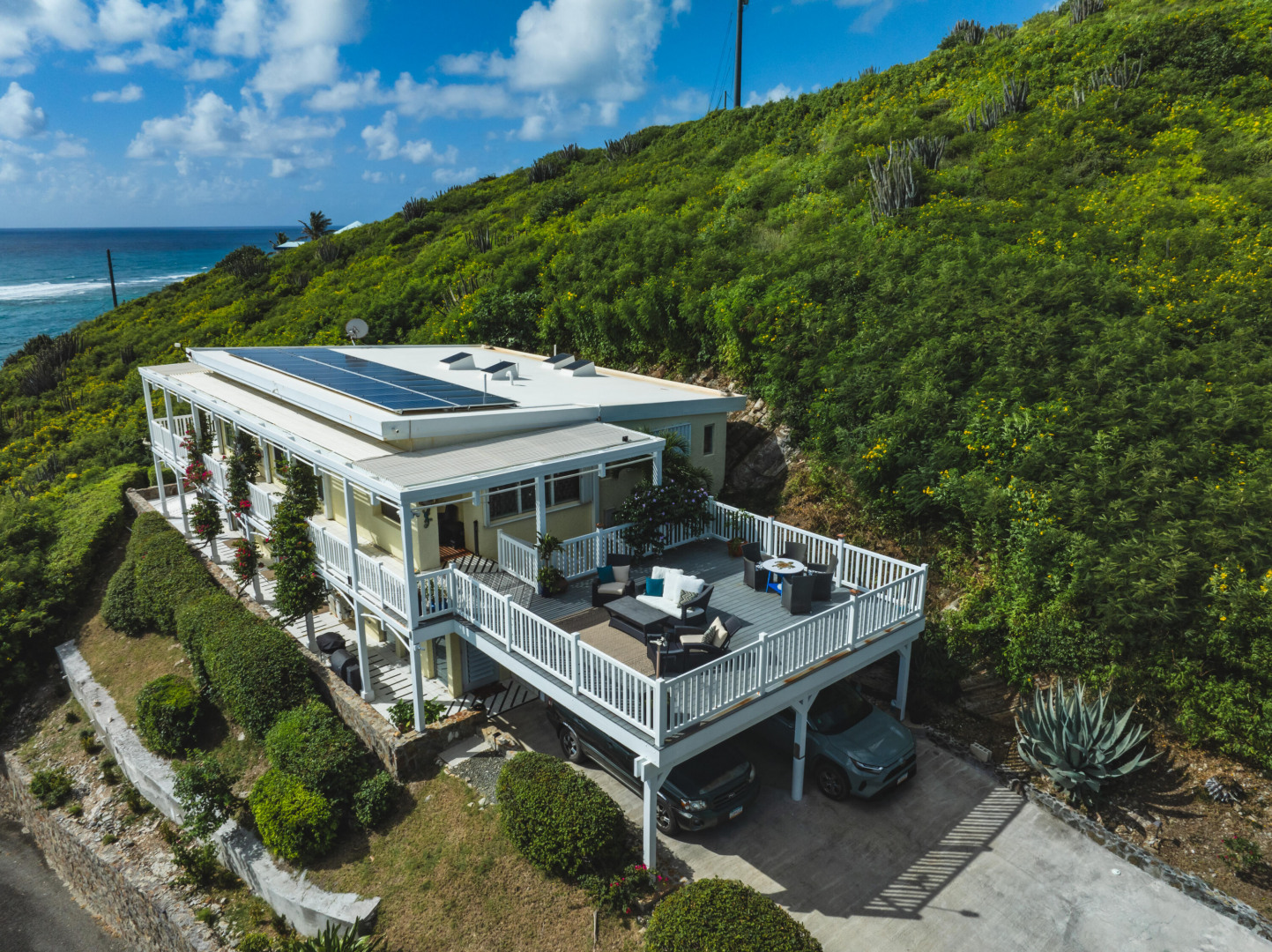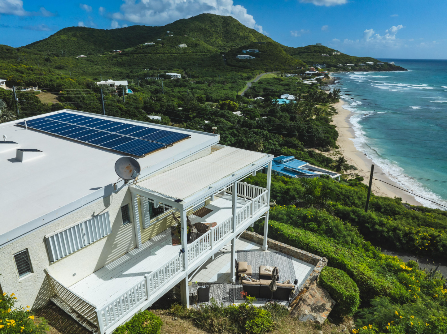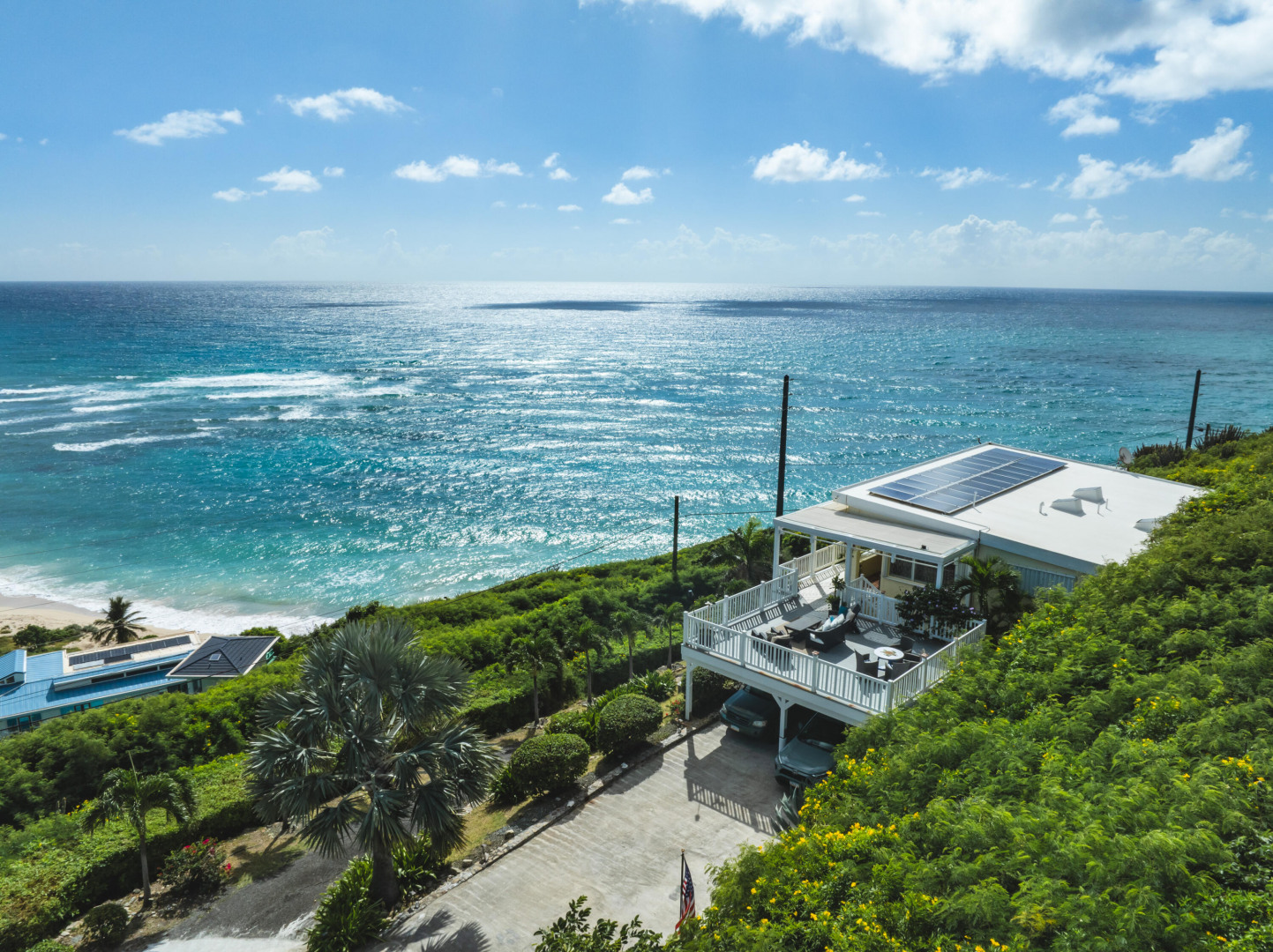 Your Caribbean Dream Starts here! Picture-perfect 2-bedrooms, 2.5 baths with a 1-bedroom, 1-bath apartment, located on large 3/4 acre lot with panoramic South Shore Sea views - directly across the street from a white sandy beach! This home also features a concrete pool w/ cabana & Travertine tile pool patio, gated entrance, 2-car car port, wrap around Trex deck, Laundry/Mechanical room w/ half-bath, 24 solar panels (6800 watts) w/ 6 batteries (24KW), Split A/C's, accordion shutters, dual main bedrooms each with en-suite baths and adjoining bonus rooms, 2 cisterns (29K gallons), energy efficient sliding glass doors. The apartment with its own private entrance, gallery & patio is a 5-star rated VRBO rental - booked throughout the season!