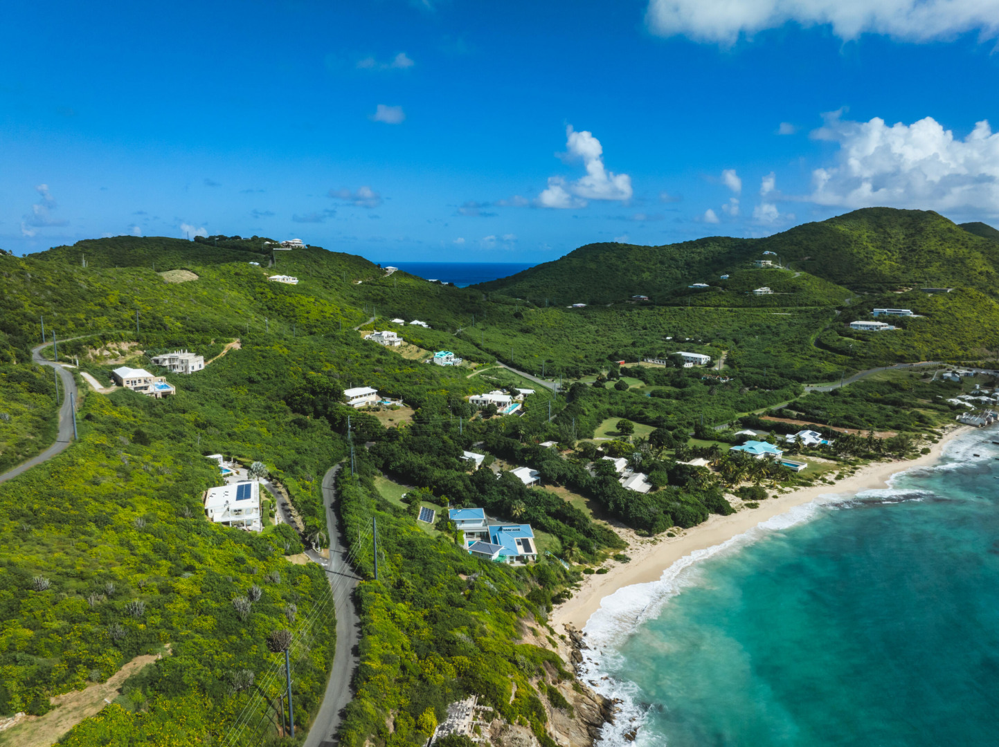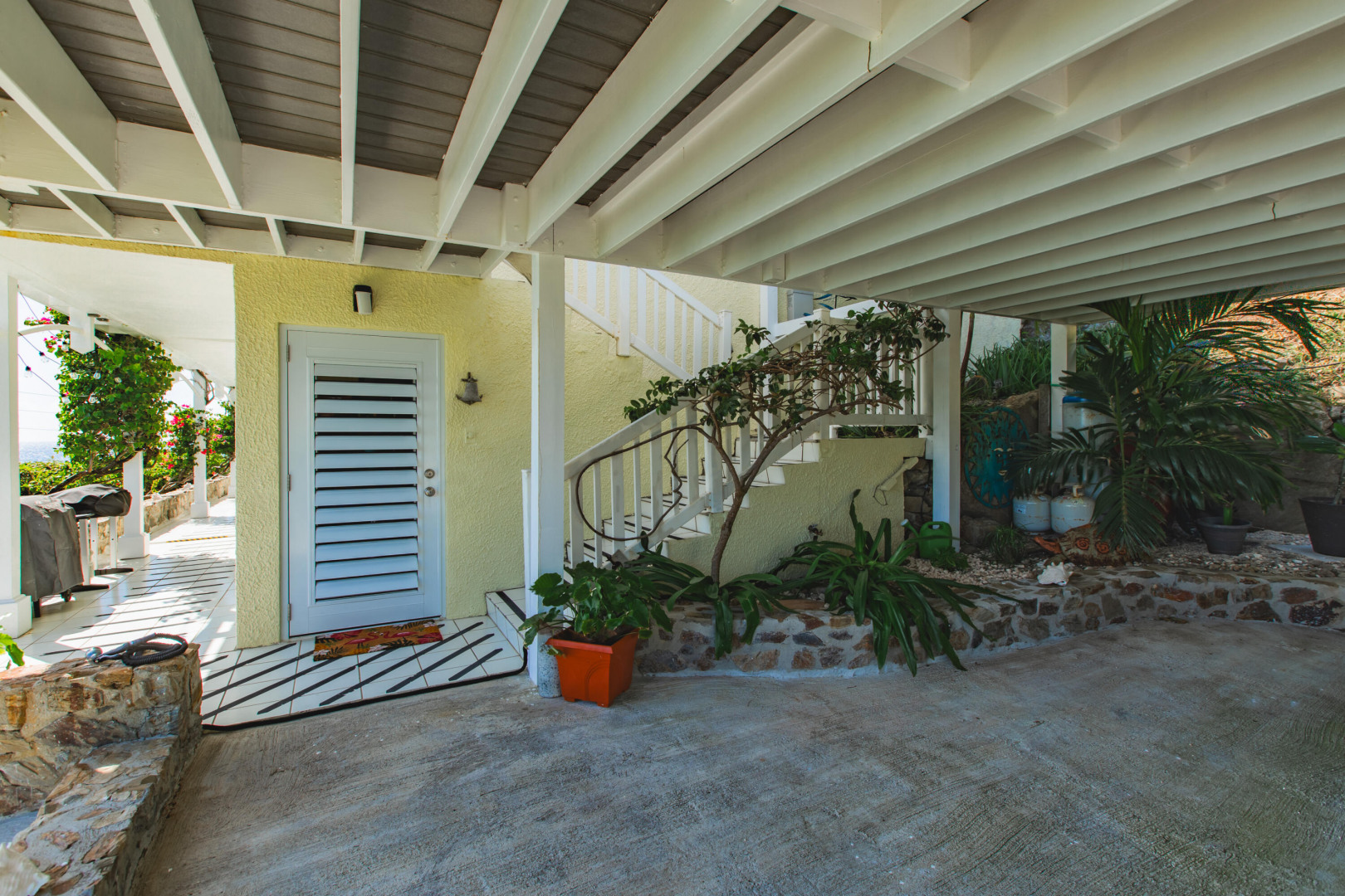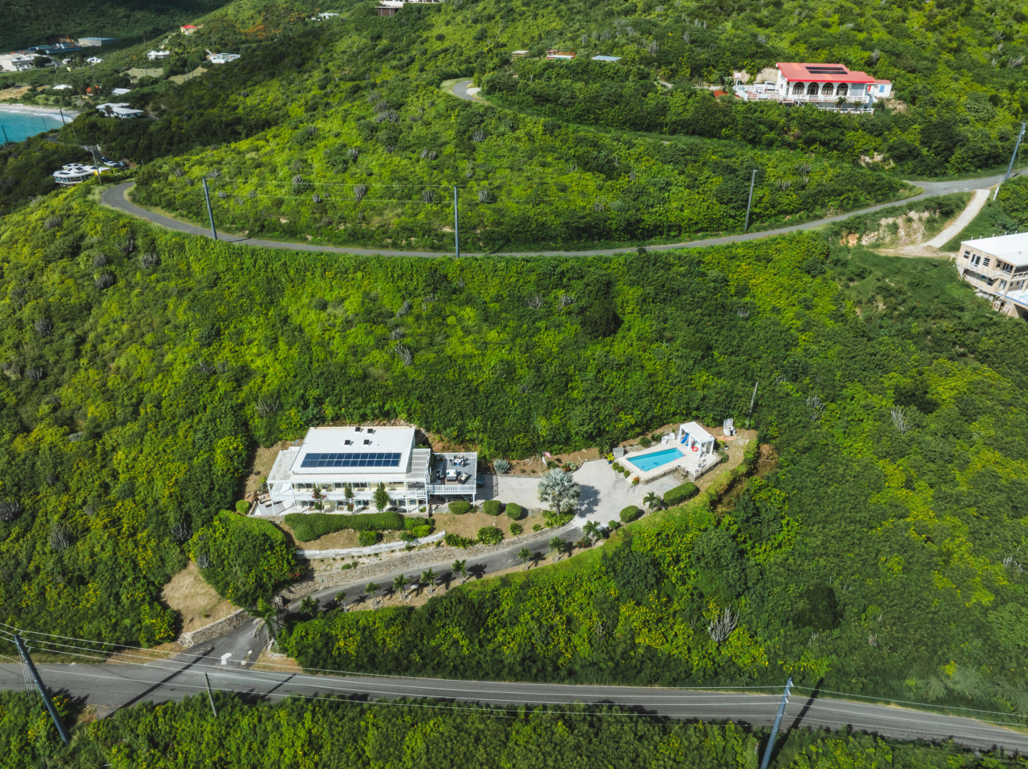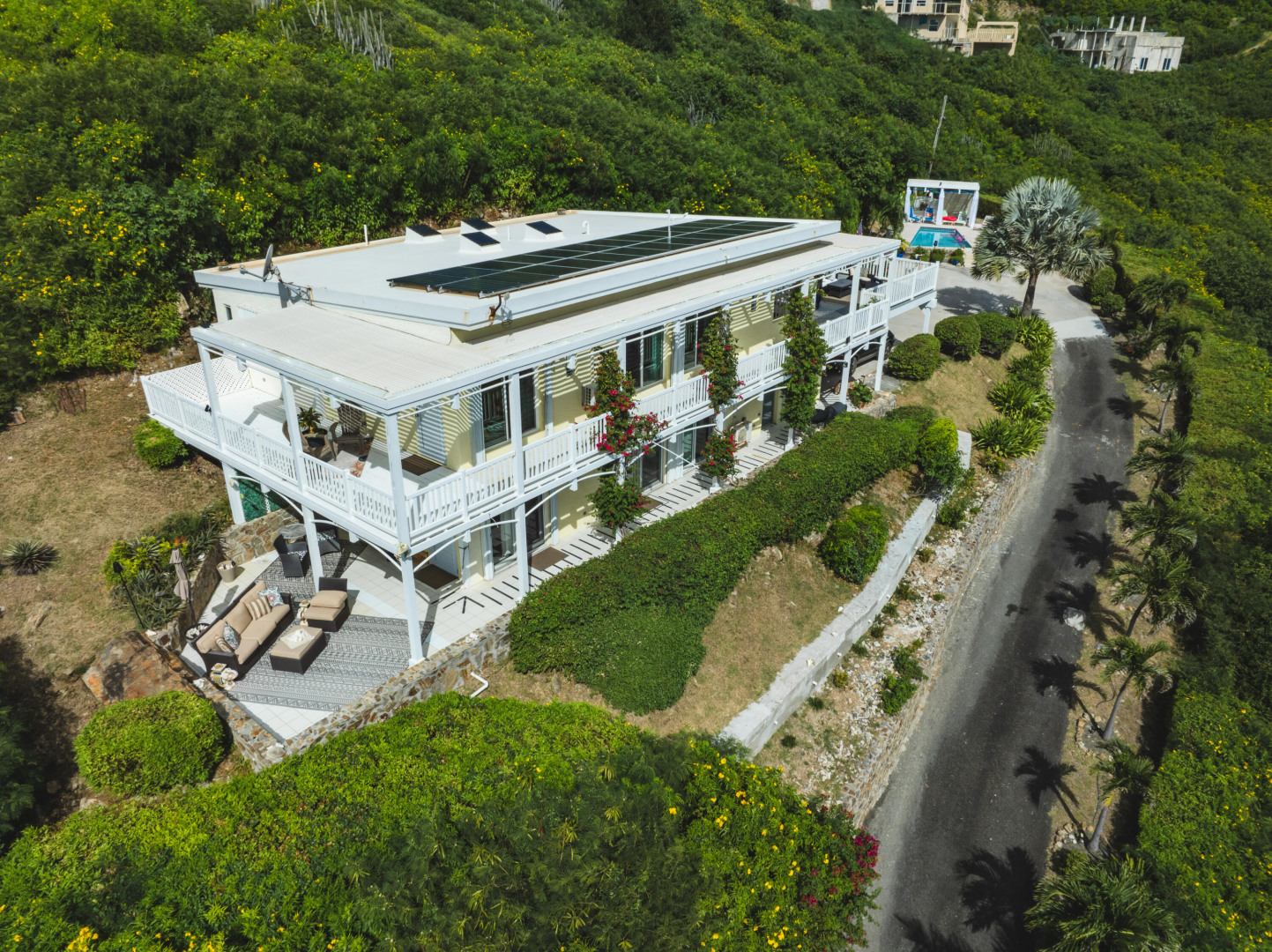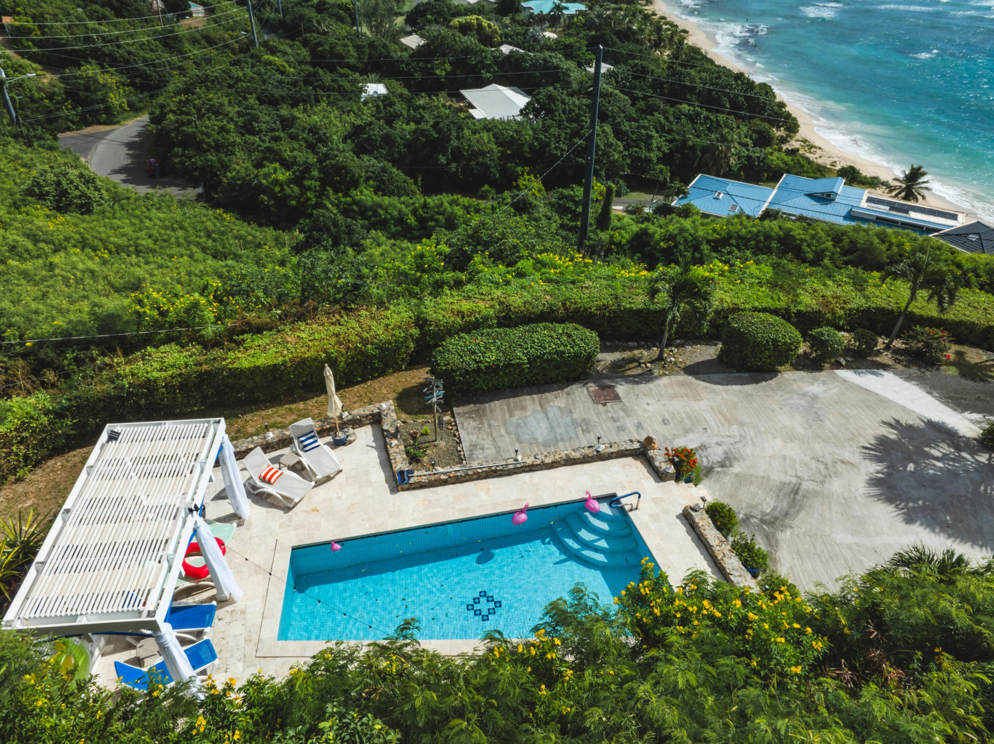 Your Caribbean Dream Starts here! Picture-perfect 2-bedrooms, 2.5 baths with a 1-bedroom, 1-bath apartment, located on large 3/4 acre lot with panoramic South Shore Sea views - directly across the street from a white sandy beach! This home also features a concrete pool w/ cabana & Travertine tile pool patio, gated entrance, 2-car car port, wrap around Trex deck, Laundry/Mechanical room w/ half-bath, 24 solar panels (6800 watts) w/ 6 batteries (24KW), Split A/C's, accordion shutters, dual main bedrooms each with en-suite baths and adjoining bonus rooms, 2 cisterns (29K gallons), energy efficient sliding glass doors. The apartment with its own private entrance, gallery & patio is a 5-star rated VRBO rental - booked throughout the season!
