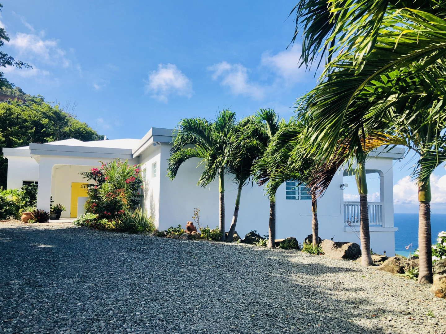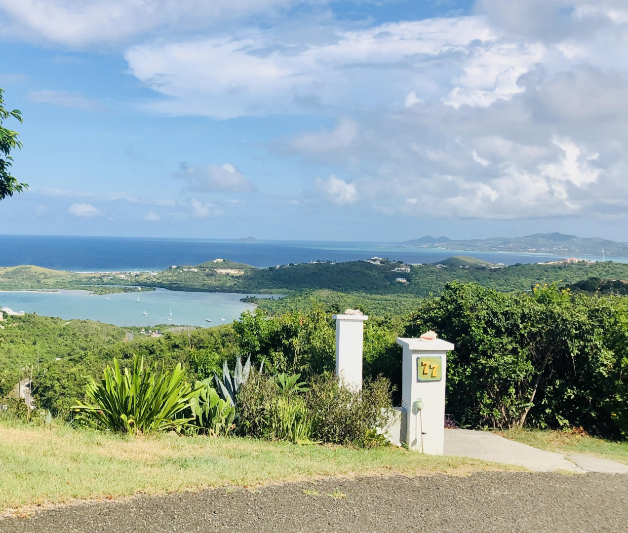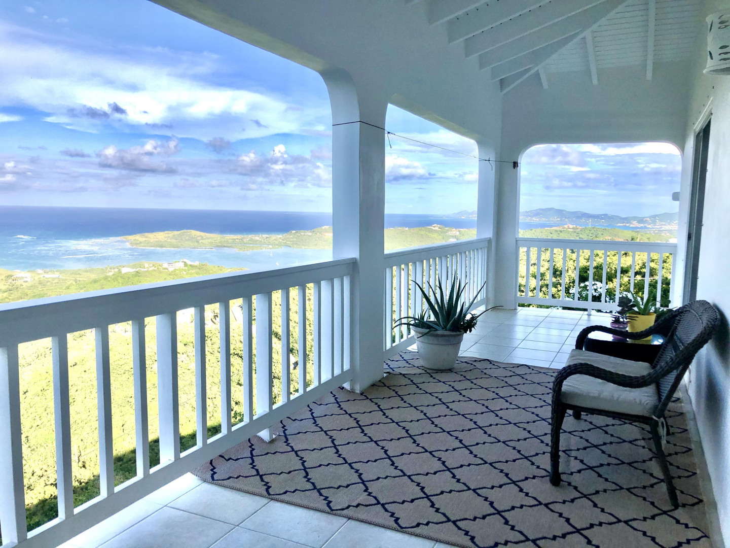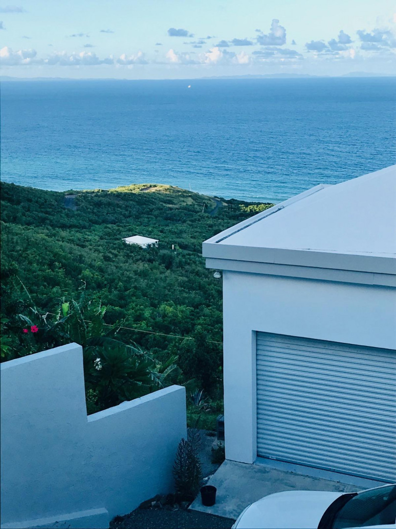 SPECTACULAR SEA VIEWS from every room of this pristine hillside home! Upper and lower covered galleries allow for easy indoor/outdoor living. Open, updated kitchen flows to dining and living areas --great for entertaining. Four generously sized bedrooms with three en suite baths are perfect for a family or vacation rental. Large multipurpose area can be used for entertaining, exercise, game room, or studio. Rare two car garage can double as storage area if preferred. Convenient dog run for pet owners is easily removed if not desired. This property is beautifully maintained and landscaped. Lots of updates to the exterior and interior (see supplement). Neutral and move in ready. Private and peaceful. Conveniently located with newly paved roads. A hidden gem on St. Croix!Updates and repairs include a new solar water heater with 80 gallon tank, new water pump, freshly painted exterior and interior (including retaining walls), new steel hurricane roof clips, two cisterns repaired and resealed this year, AC installed in all bedrooms, new refrigerator, dishwasher, kitchen backsplash and corian countertops. Roof just power washed and septic pumped.