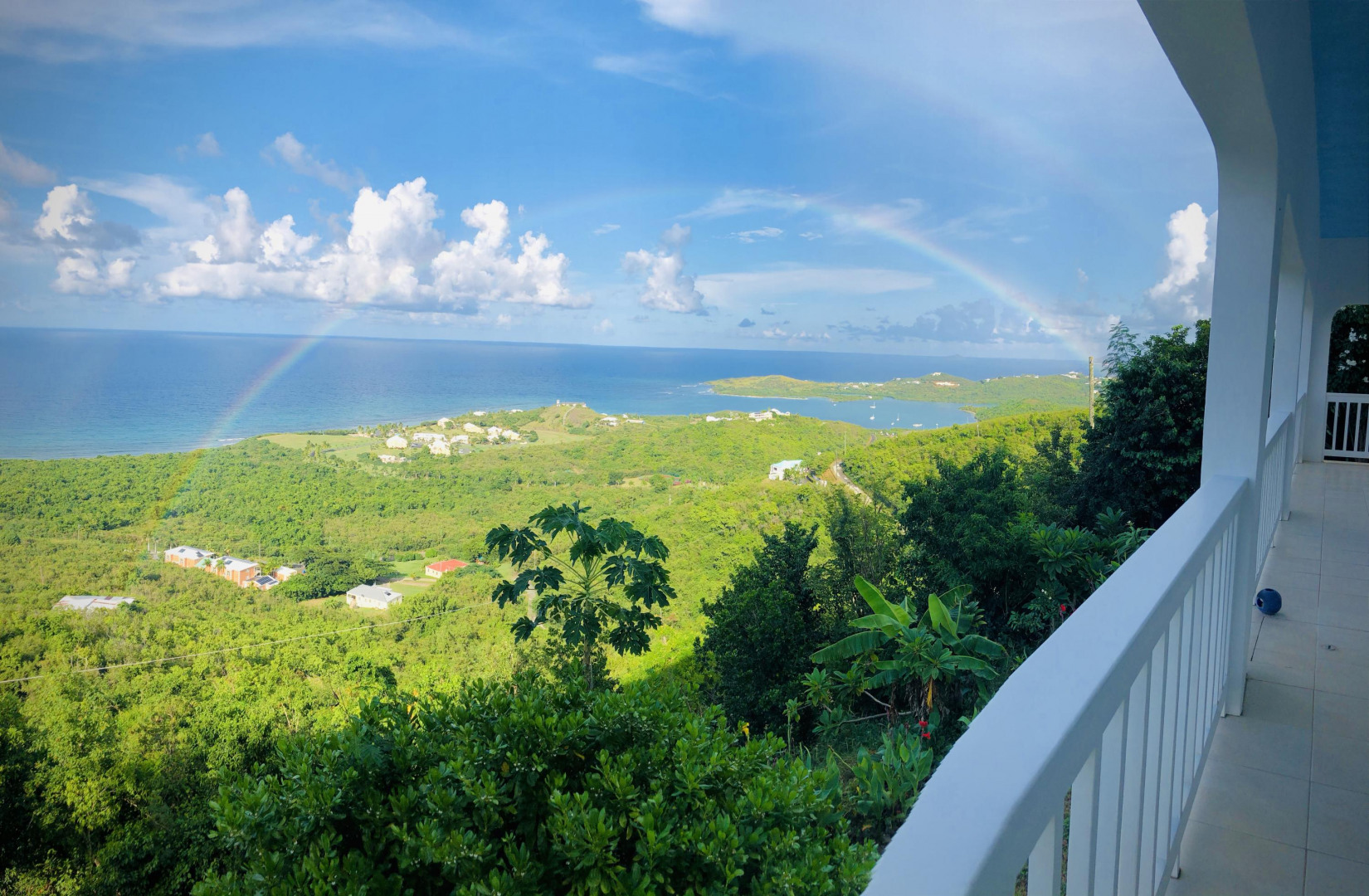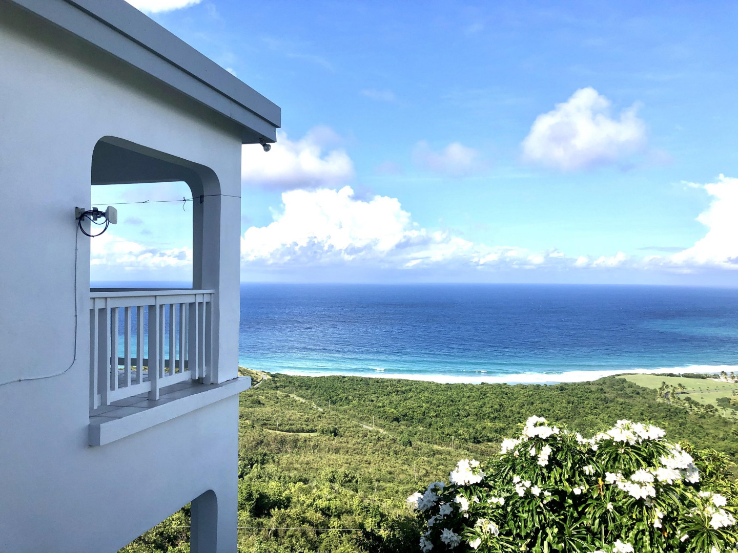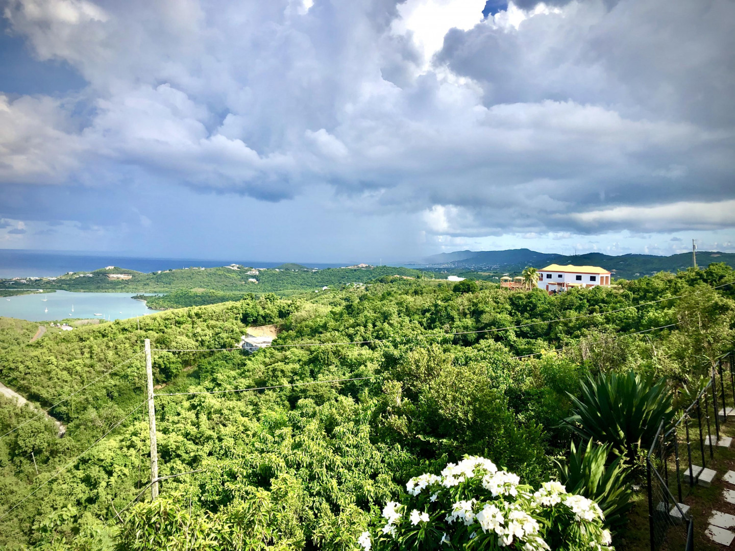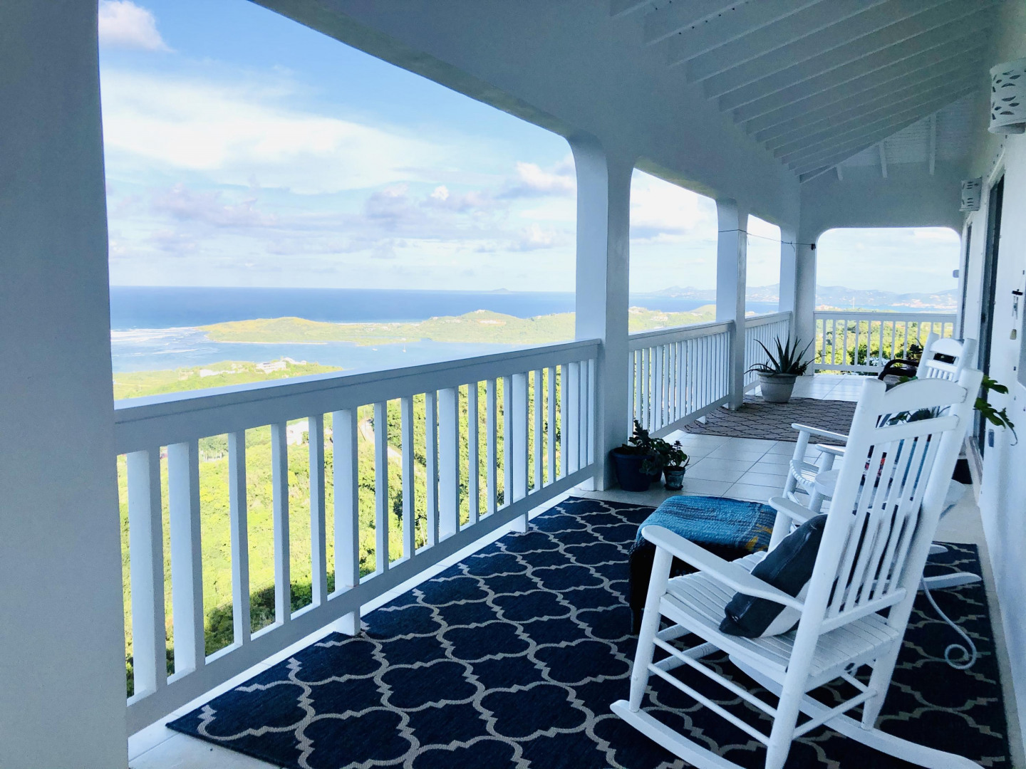 SPECTACULAR SEA VIEWS from every room of this pristine hillside home! Upper and lower covered galleries allow for easy indoor/outdoor living. Open, updated kitchen flows to dining and living areas --great for entertaining. Four generously sized bedrooms with three en suite baths are perfect for a family or vacation rental. Large multipurpose area can be used for entertaining, exercise, game room, or studio. Rare two car garage can double as storage area if preferred. Convenient dog run for pet owners is easily removed if not desired. This property is beautifully maintained and landscaped. Lots of updates to the exterior and interior (see supplement). Neutral and move in ready. Private and peaceful. Conveniently located with newly paved roads. A hidden gem on St. Croix!Updates and repairs include a new solar water heater with 80 gallon tank, new water pump, freshly painted exterior and interior (including retaining walls), new steel hurricane roof clips, two cisterns repaired and resealed this year, AC installed in all bedrooms, new refrigerator, dishwasher, kitchen backsplash and corian countertops. Roof just power washed and septic pumped.