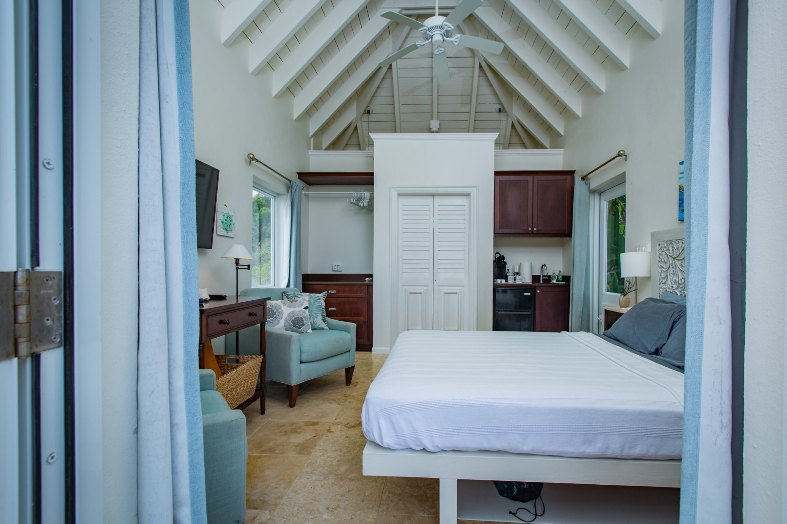 The Morning Star Cottage features panoramic 180 views of Salt River Bay, STT, and Columbus Landing and upscale finishes. Perfectly situated for privacy this studio cottage feels like boutique resort retreat. Imagine coming home each day and being welcomed via a lit, tropical tree-lined walkway leading to a tranquil setting featuring a goldfish pond with a fountain, private outdoor dining and lounging areas, and a spa-style bathroom with an outdoor shower window facing the Morning Star enclave. The cottage has keyless entry, a kitchenette, travertine floors, custom built-ins, upscale island-inspired furnishings, and private parking. Zoned R-1. It is a perfect vacation rental investment property. Schedule a showing today.