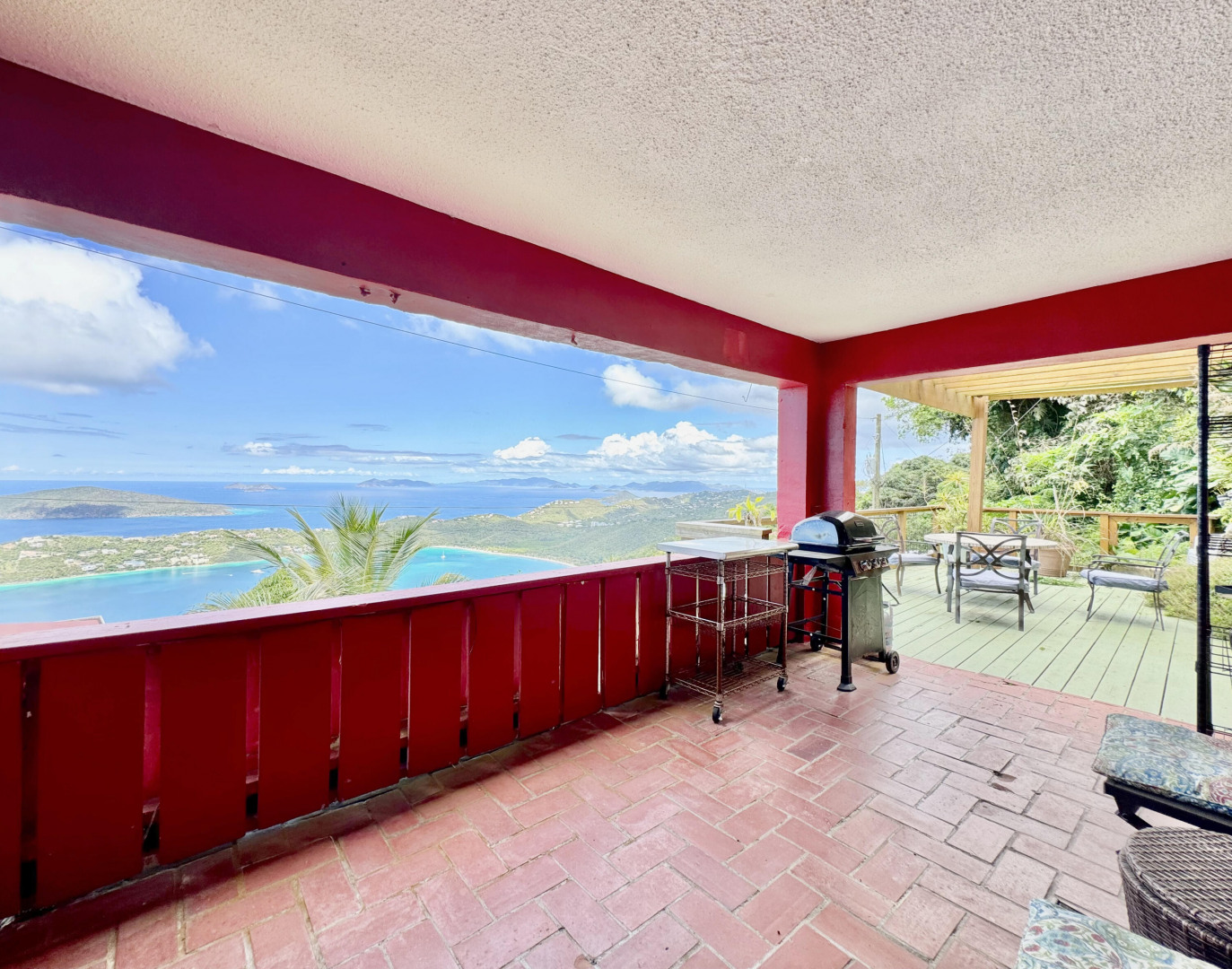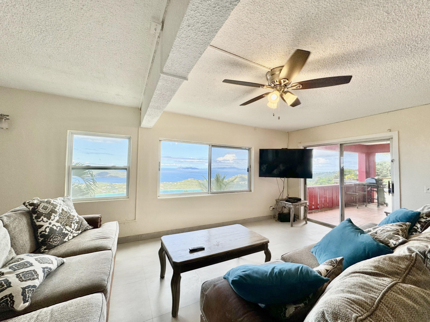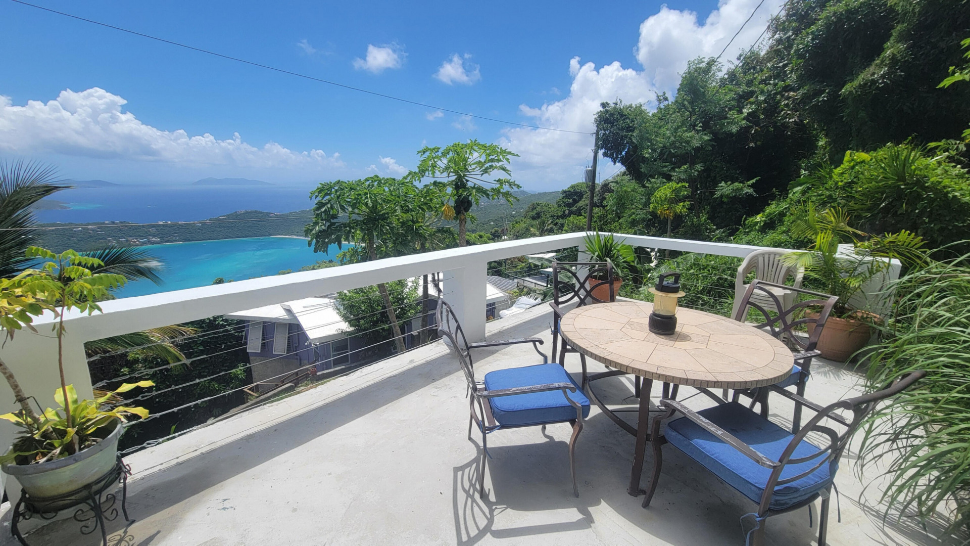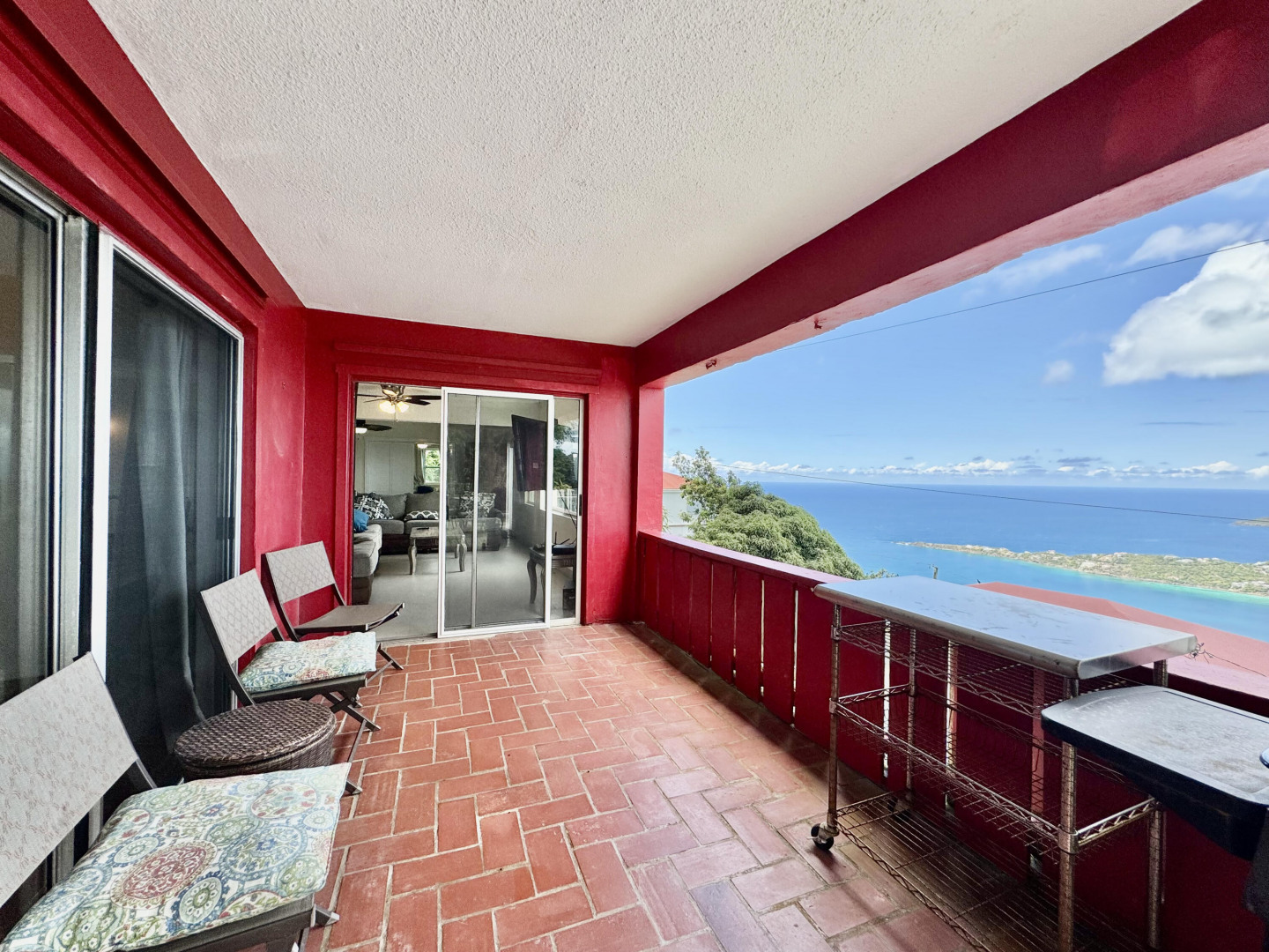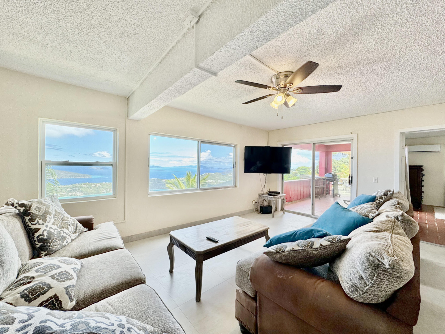 Enjoy breathtaking panoramic views of the Atlantic Ocean and Magen's Bay Beach from this spacious concrete home, featuring a 3-bedroom main residence and a matching 3-bedroom apartment below--ideal for extended family or rental income. The upper level boasts vaulted ceilings and a bright, open-concept living and dining area, while the lower apartment offers the same spacious layout with a newly remodeled kitchen, modern appliances, and a brand-new porch perfect for enjoying the Caribbean breeze. Thoughtfully updated with impact-resistant windows throughout, a freshly sealed cistern and roof, and new appliances on both levels. Set on beautifully landscaped grounds, the property also features a lush garden with tropical fruit trees, including sugar apples, bananas, mangos, and papayas