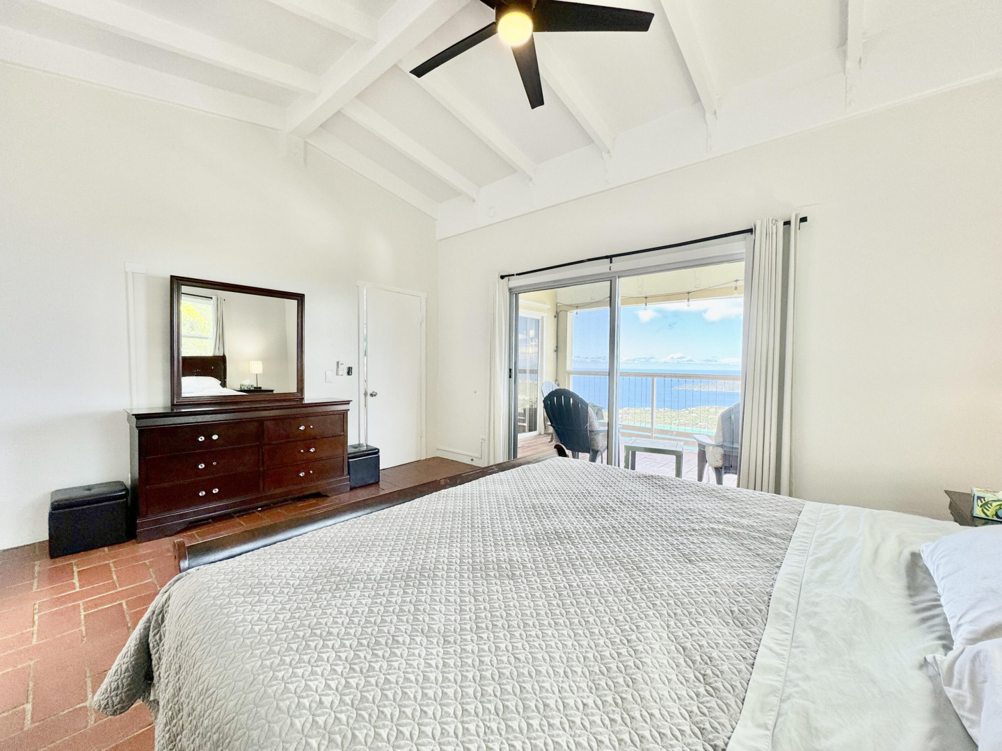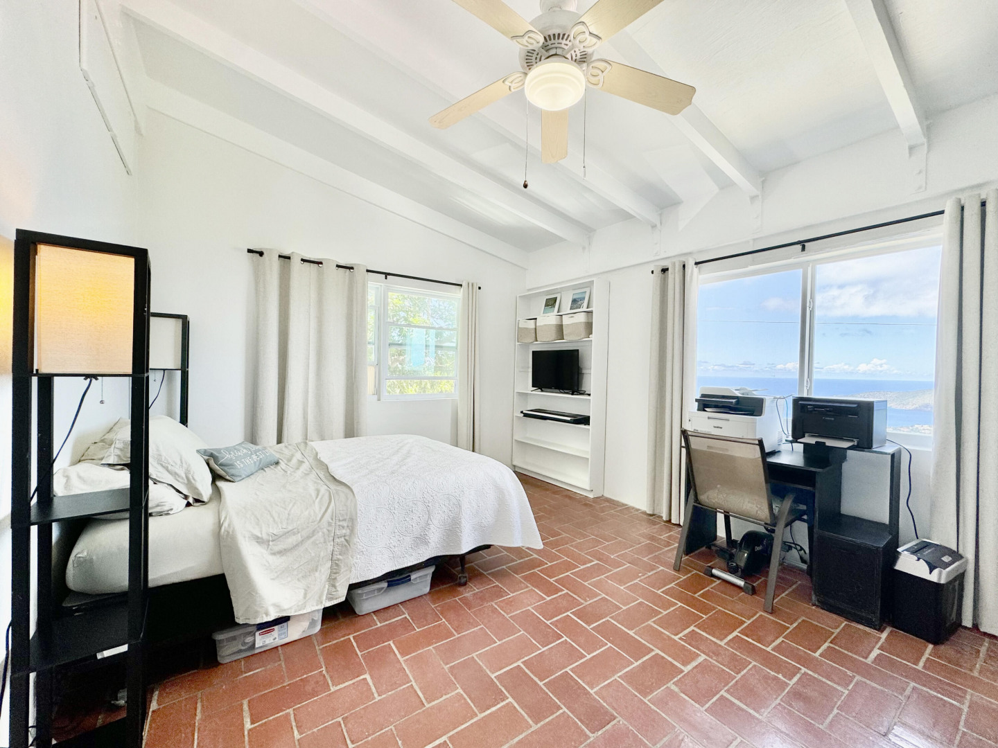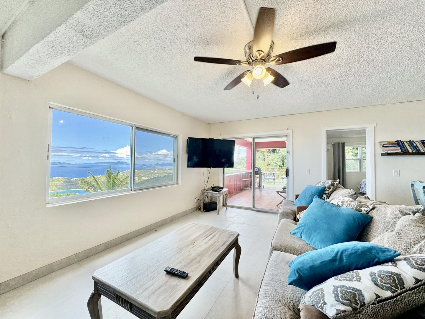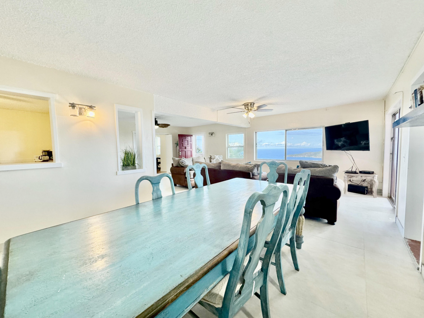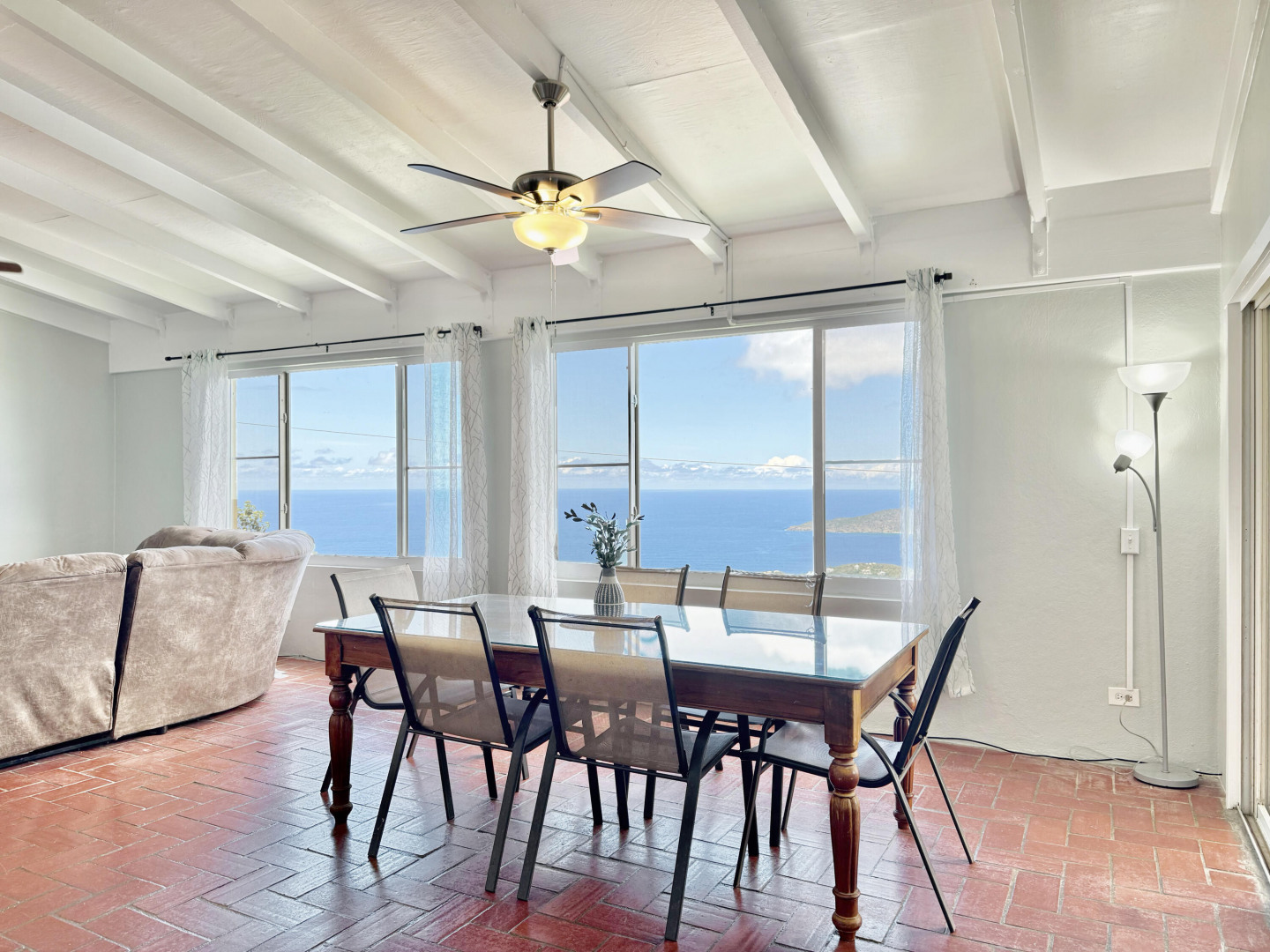 Enjoy breathtaking panoramic views of the Atlantic Ocean and Magen's Bay Beach from this spacious concrete home, featuring a 3-bedroom main residence and a matching 3-bedroom apartment below--ideal for extended family or rental income. The upper level boasts vaulted ceilings and a bright, open-concept living and dining area, while the lower apartment offers the same spacious layout with a newly remodeled kitchen, modern appliances, and a brand-new porch perfect for enjoying the Caribbean breeze. Thoughtfully updated with impact-resistant windows throughout, a freshly sealed cistern and roof, and new appliances on both levels. Set on beautifully landscaped grounds, the property also features a lush garden with tropical fruit trees, including sugar apples, bananas, mangos, and papayas