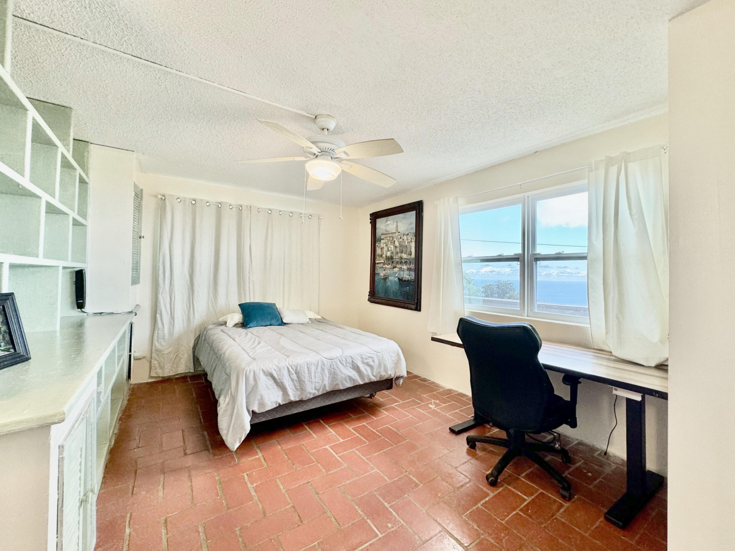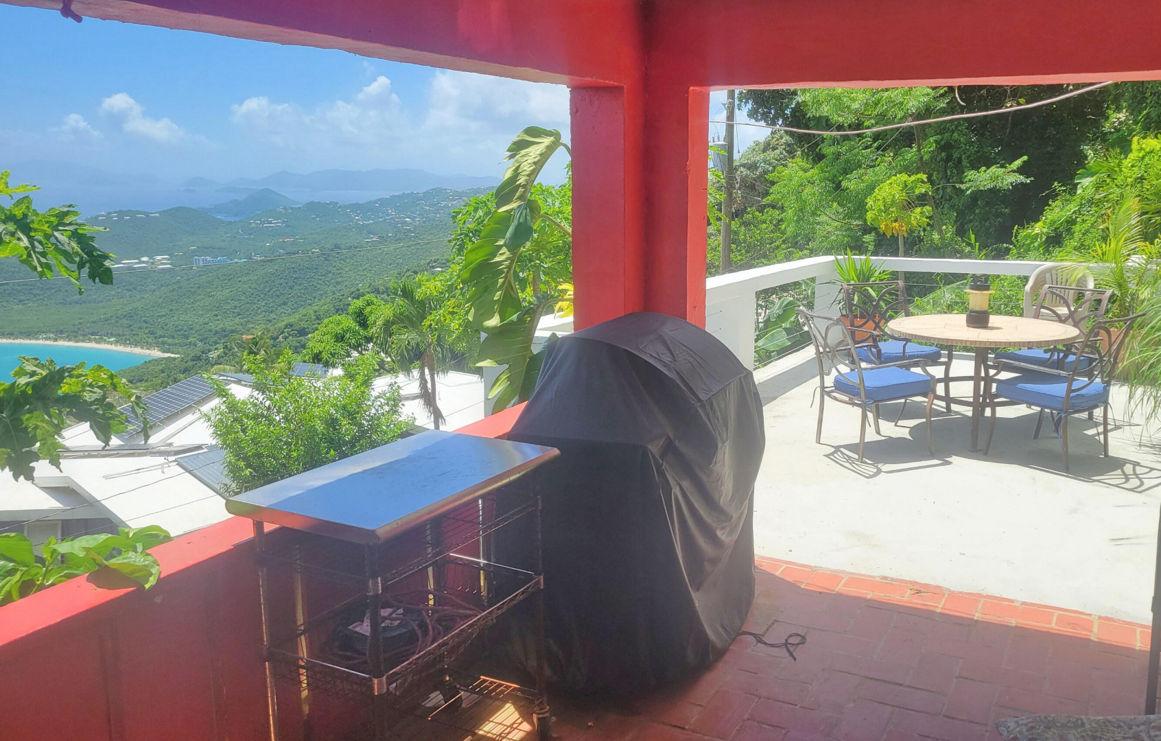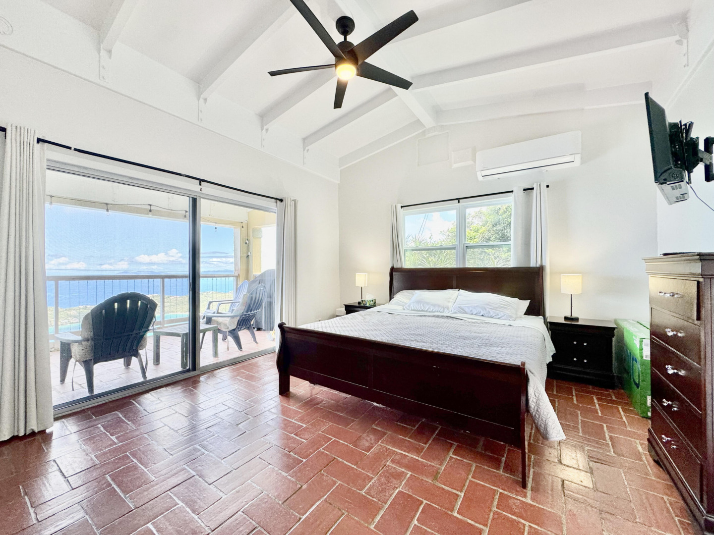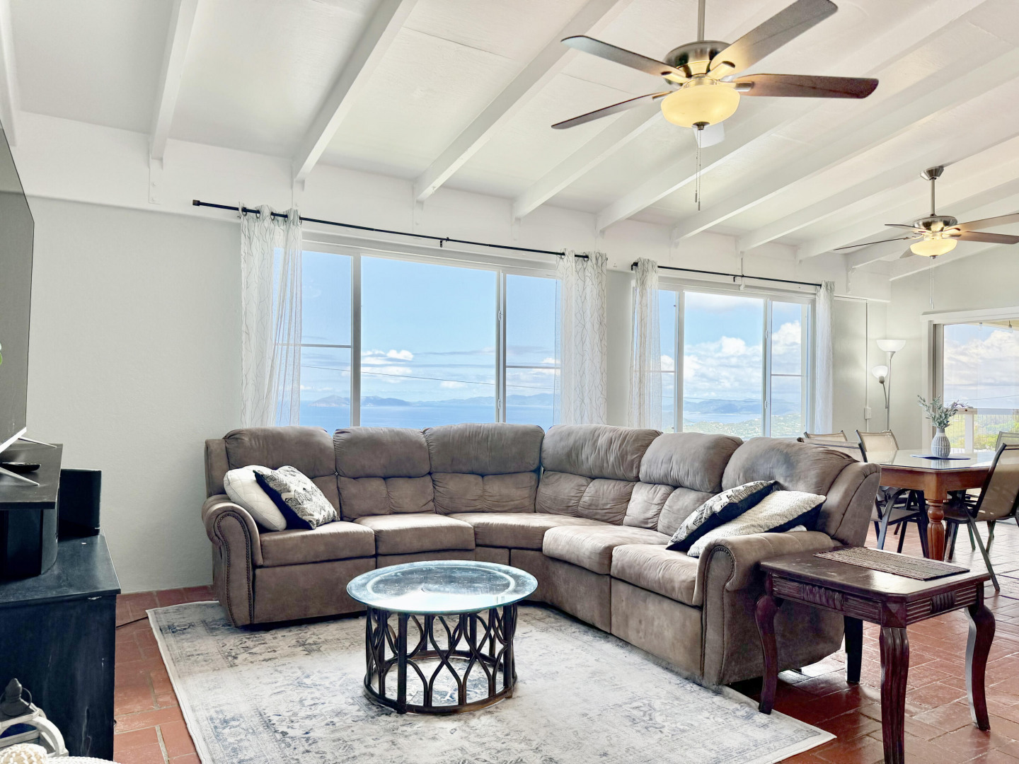 Enjoy breathtaking panoramic views of the Atlantic Ocean and Magen's Bay Beach from this spacious concrete home, featuring a 3-bedroom main residence and a matching 3-bedroom apartment below--ideal for extended family or rental income. The upper level boasts vaulted ceilings and a bright, open-concept living and dining area, while the lower apartment offers the same spacious layout with a newly remodeled kitchen, modern appliances, and a brand-new porch perfect for enjoying the Caribbean breeze. Thoughtfully updated with impact-resistant windows throughout, a freshly sealed cistern and roof, and new appliances on both levels. Set on beautifully landscaped grounds, the property also features a lush garden with tropical fruit trees, including sugar apples, bananas, mangos, and papayas