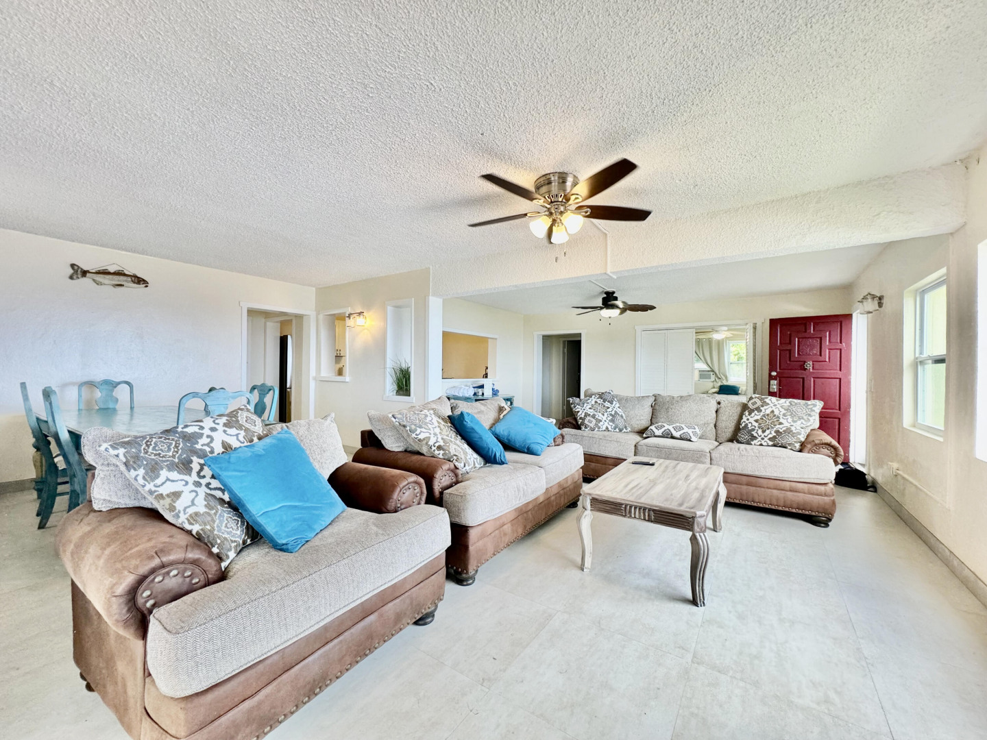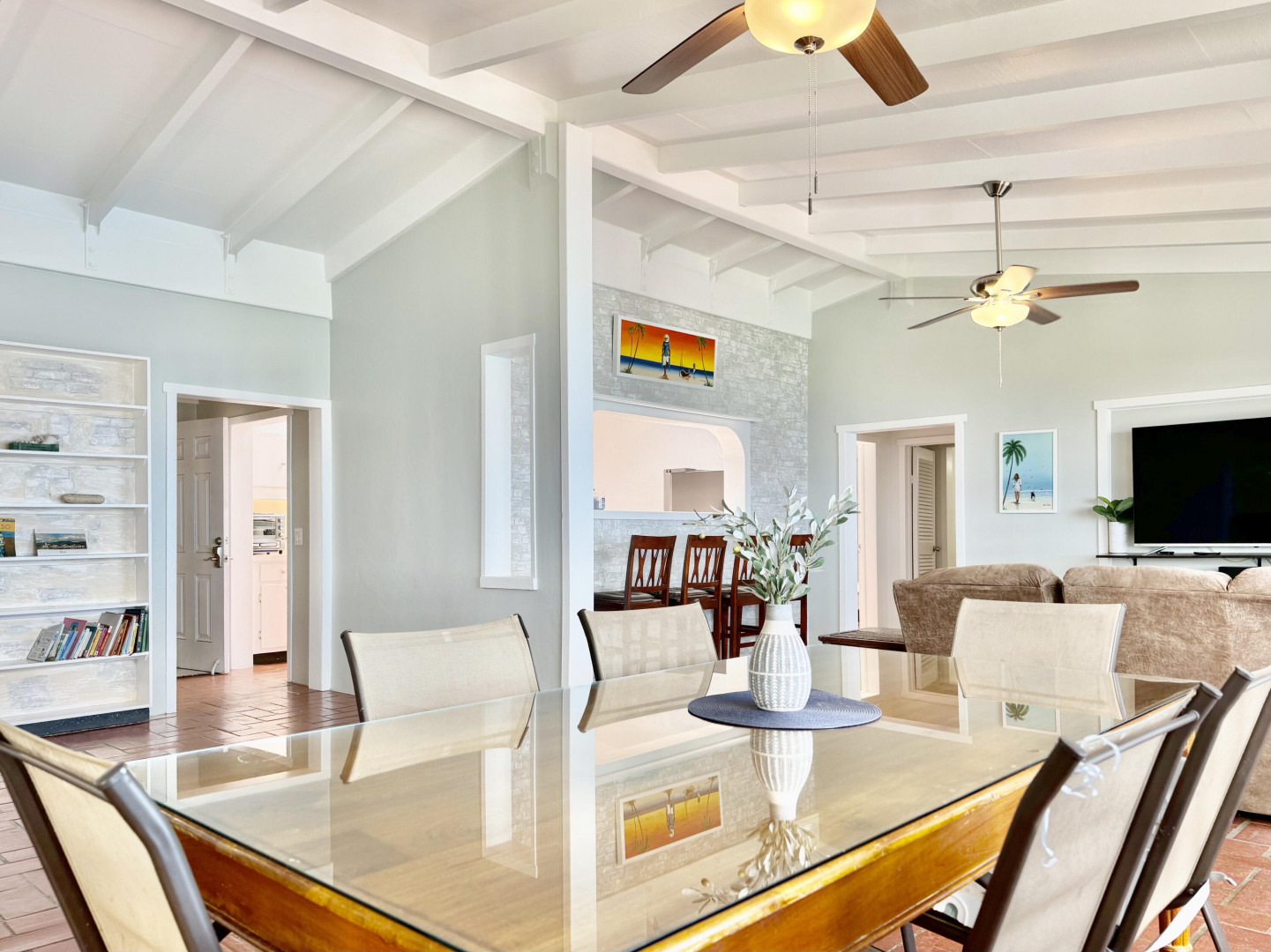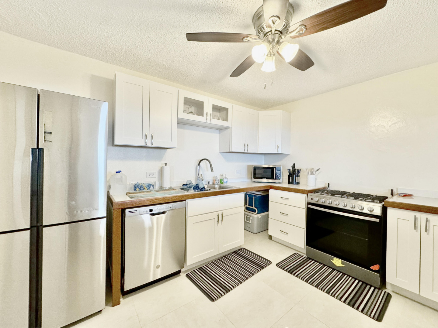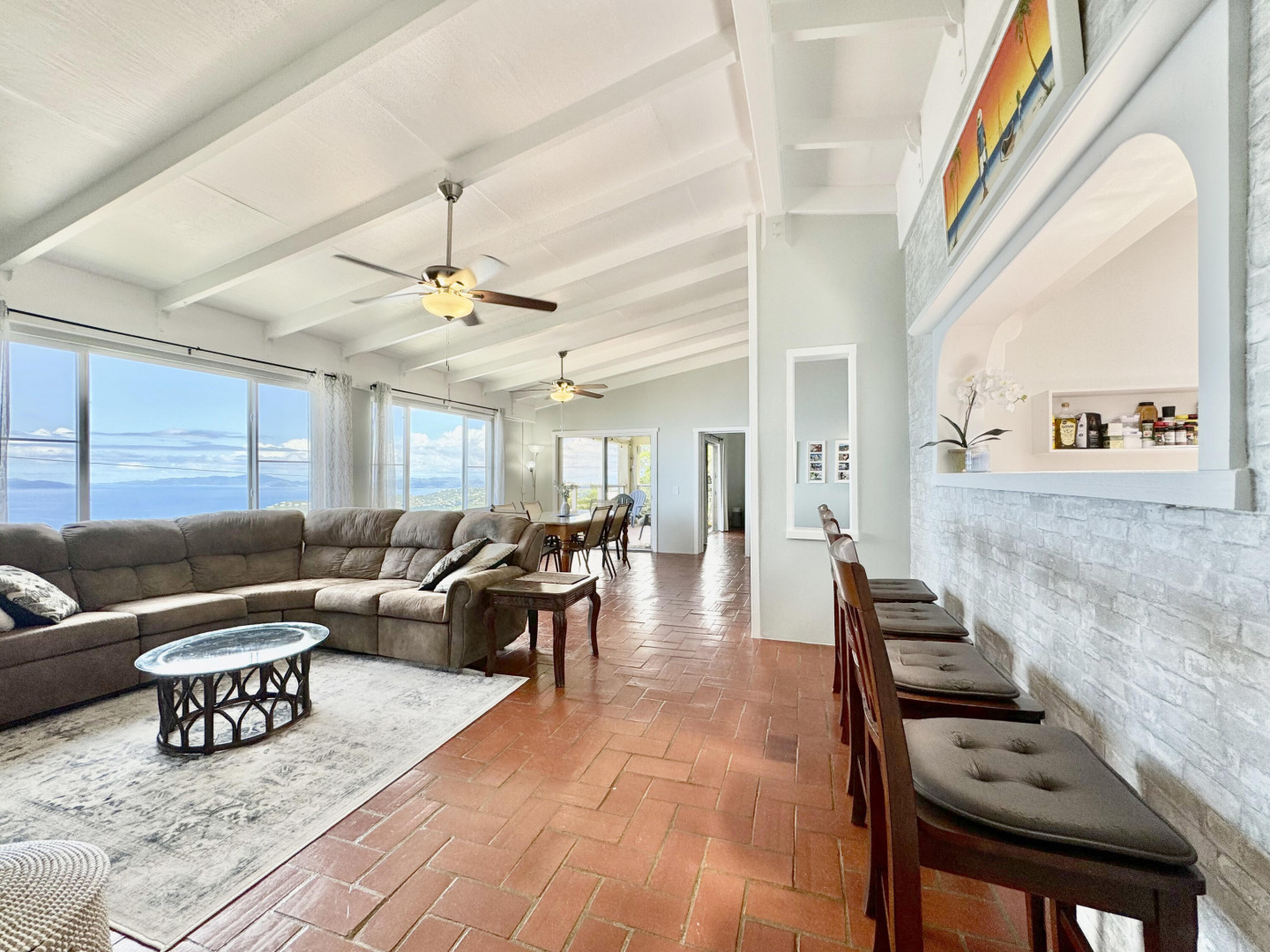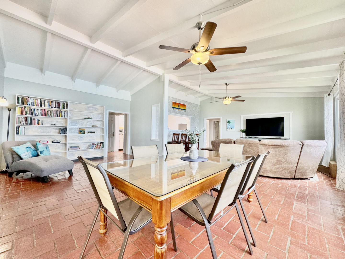 Enjoy breathtaking panoramic views of the Atlantic Ocean and Magen's Bay Beach from this spacious concrete home, featuring a 3-bedroom main residence and a matching 3-bedroom apartment below--ideal for extended family or rental income. The upper level boasts vaulted ceilings and a bright, open-concept living and dining area, while the lower apartment offers the same spacious layout with a newly remodeled kitchen, modern appliances, and a brand-new porch perfect for enjoying the Caribbean breeze. Thoughtfully updated with impact-resistant windows throughout, a freshly sealed cistern and roof, and new appliances on both levels. Set on beautifully landscaped grounds, the property also features a lush garden with tropical fruit trees, including sugar apples, bananas, mangos, and papayas