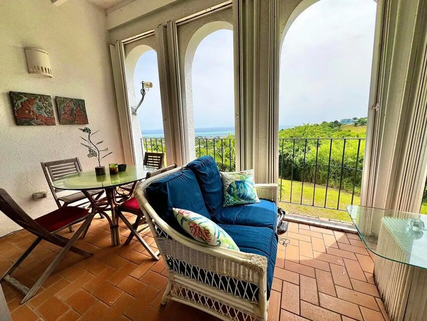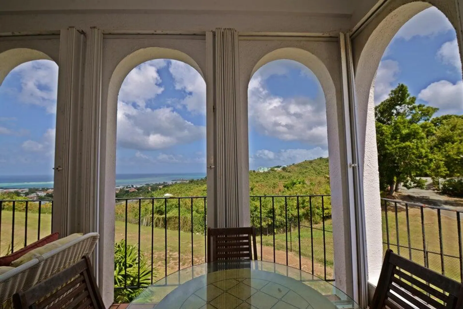 Prime end-unit villa in Questa Verde with unobstructed Caribbean Sea views and private access to the manicured lawn! This two-story, 2-bedroom, 2.5-bath villa features upper and lower galleries offering 180-degree sea and garden views including Christiansted Harbor. The complex is fully fenced, with a security gate, and welcomes your four-legged friends (ask about the criteria). Get the space and privacy of a two-story home with a ''backyard'' while enjoying the ease of condo living. The complex includes a resort style swimming pool with ample sunny deck space, an automatic generator so there is no interruption in service, trach pick up, secure entry, mail delivery, on-site management and professionally landscaped grounds. Located in Hermon Hill only minutes to Christiansted and beaches,Sunny Isle shopping center, the highway to fast track to the airport and so much more.