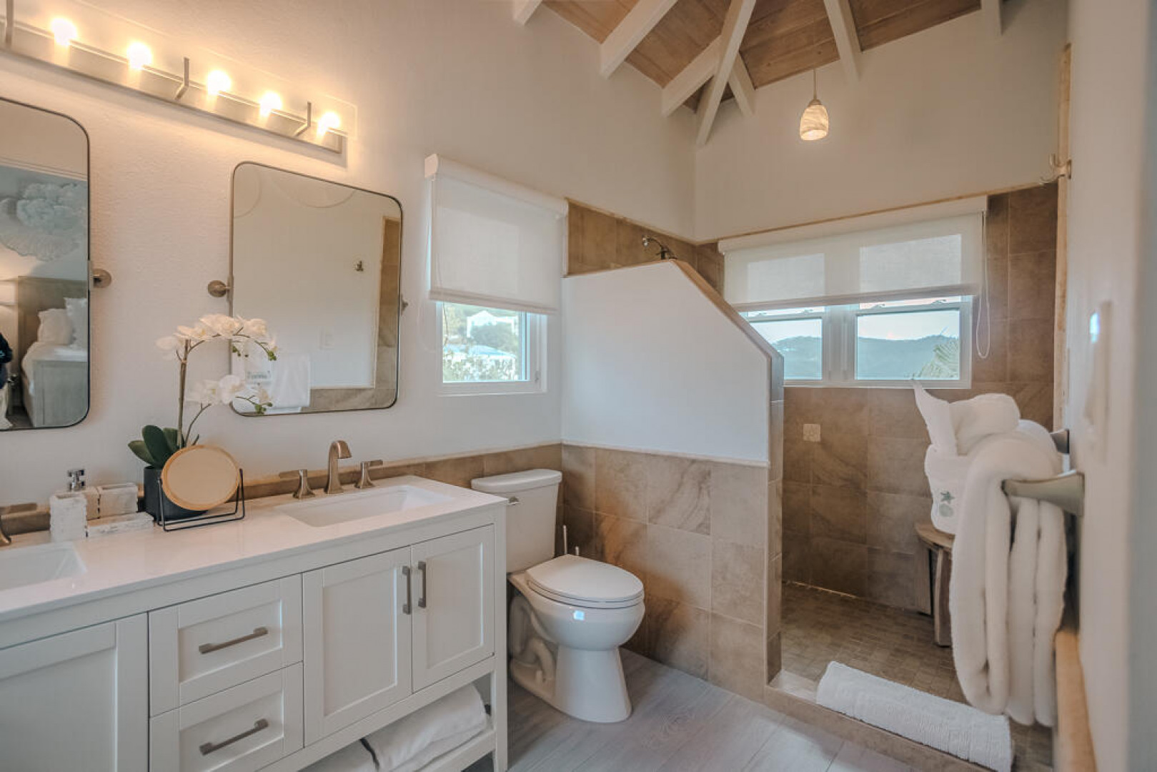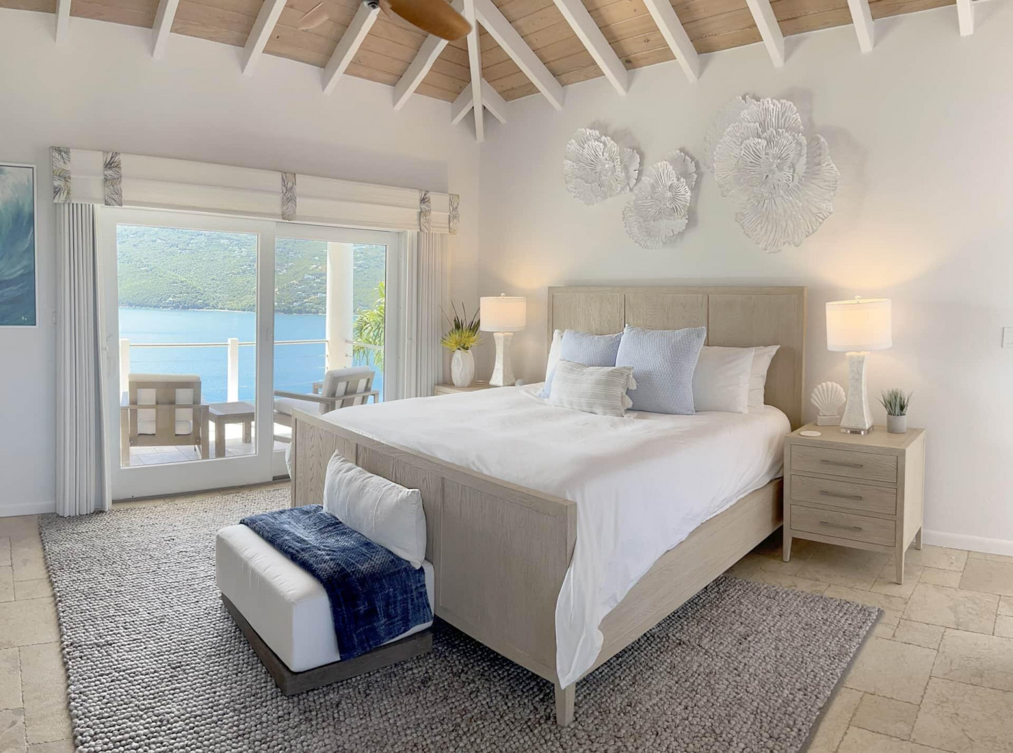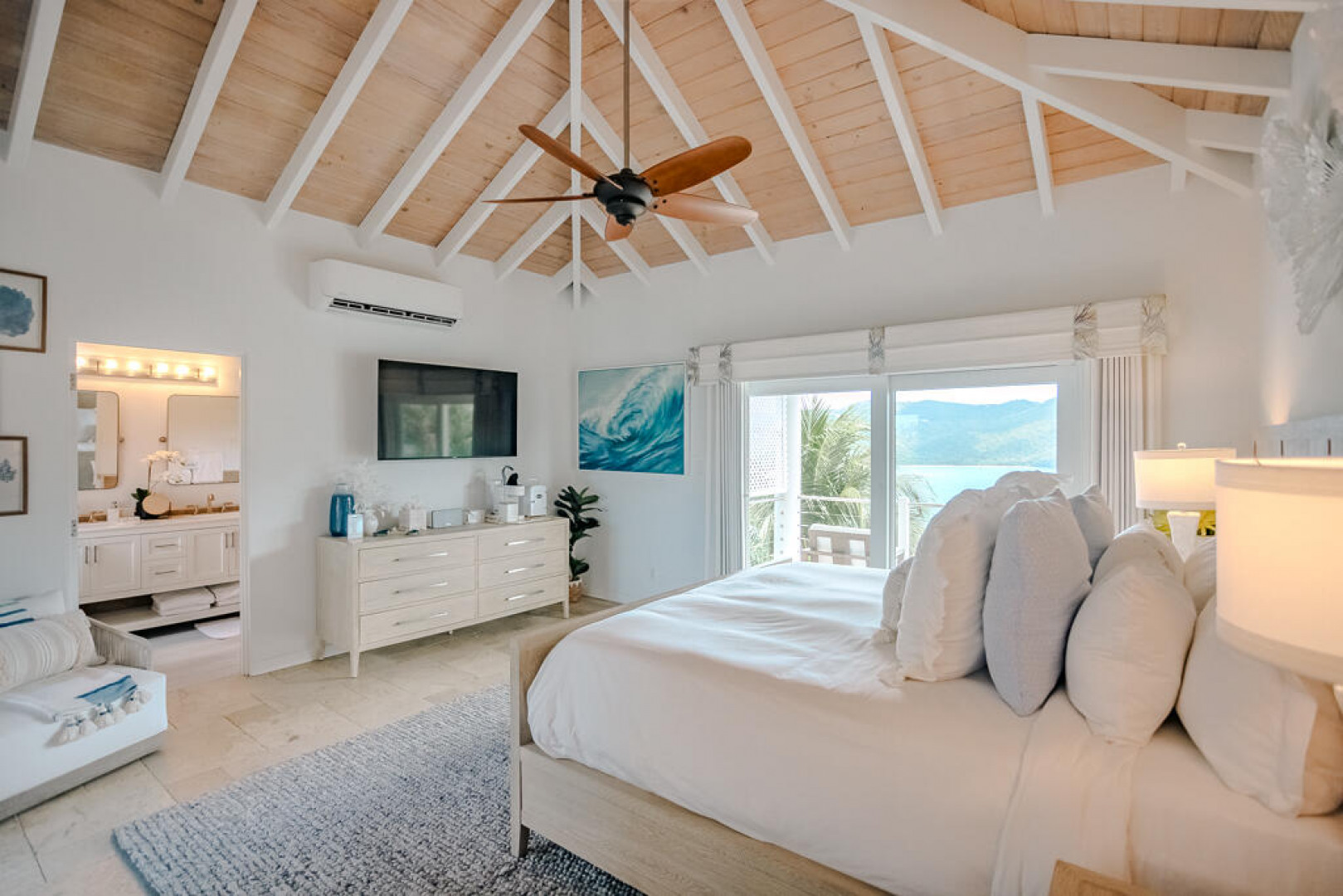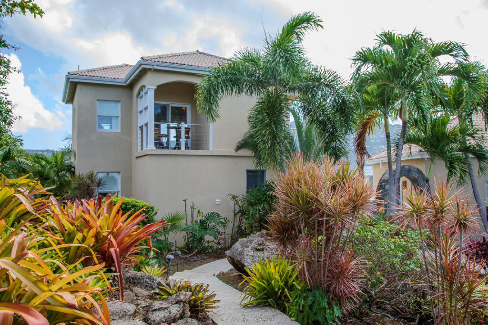 Immaculate and meticulously maintained, ISLAND TIME is an elegantly furnished luxury villa located on Peterborg peninsula. Built on a crest lot, this perch provides magnificent views of world-famous Magens Bay on one side and the serene Atlantic Ocean on the other. The property is comprised of two separate buildings. The Main Pavillion with cathedral ceiling accommodates a large modern kitchen with stainless steel appliances and custom cabinetry. Also in this building are the tastefully appointed living and dining room areas as well as half-bath. The building opens to the covered veranda and pool area through impact glass sliding doors. The second building is two stories, each hosting an identical King Suite with private bath and entrance. See More...Both Suites offer spectacular views of Magens Bay from private covered porches. The first floor suite opens to the poolside lawn and the second floor suite has an additional covered porch facing the Atlantic. The separate buildings allow for versatility, as activity in the Main Pavillion will not interfere with rest and relaxation in the King Suites. Watch the dayboats and mega yachts come in and out of Magens Bay from the sparkling saltwater infinity pool, or try your luck whale-watching from the outdoor Atlantic-view lounge on the northern side of the property. There's no hurry if you're on Island Time...
