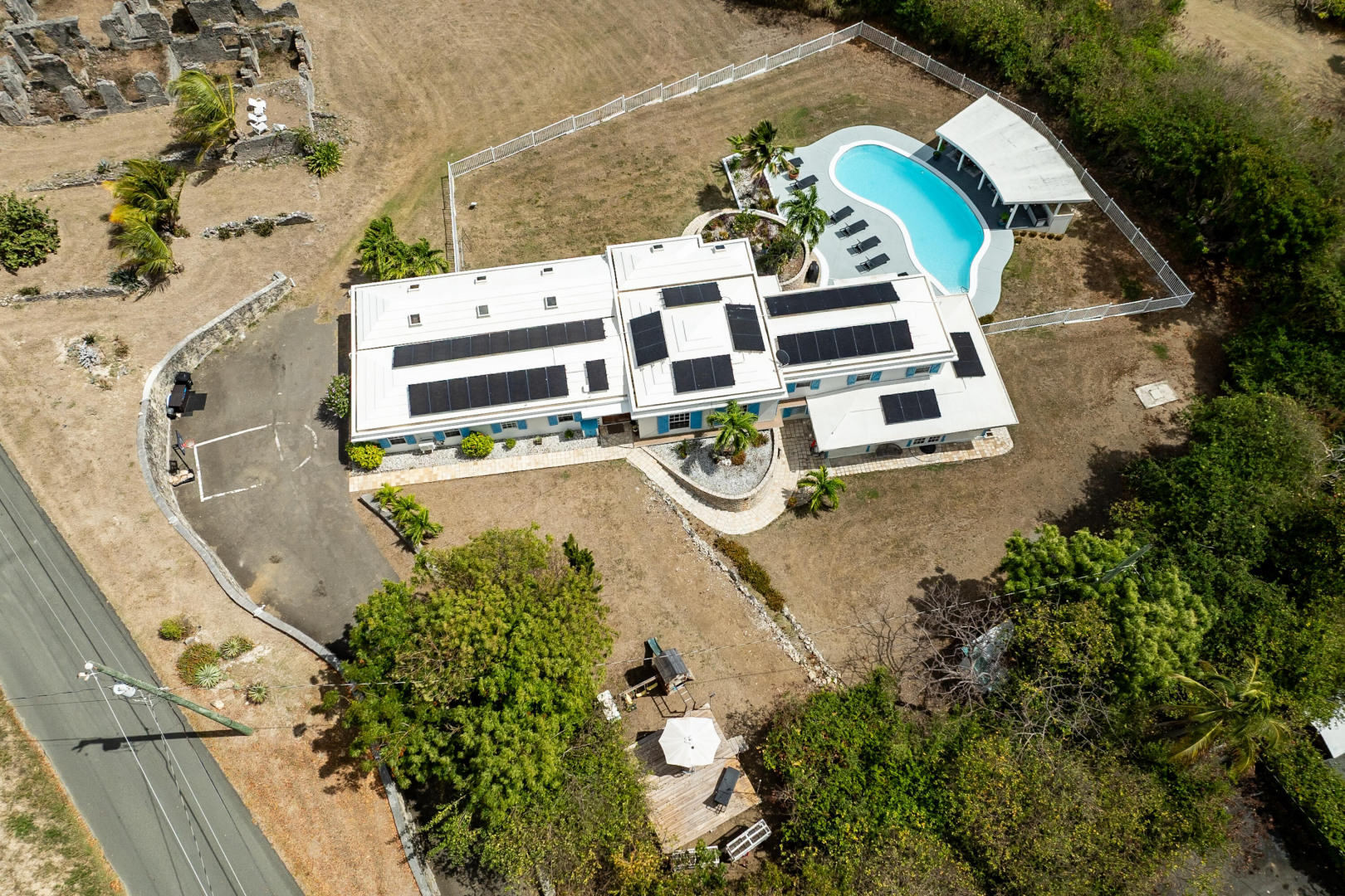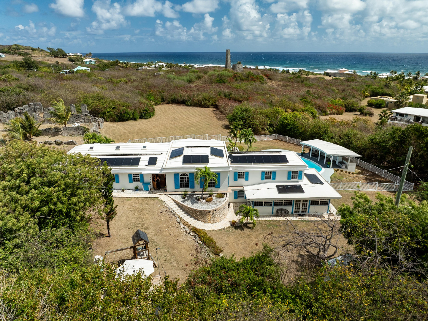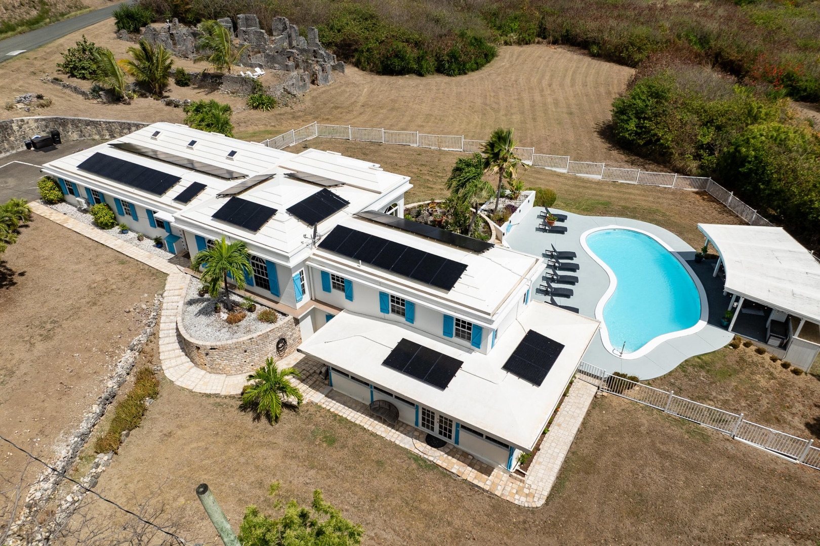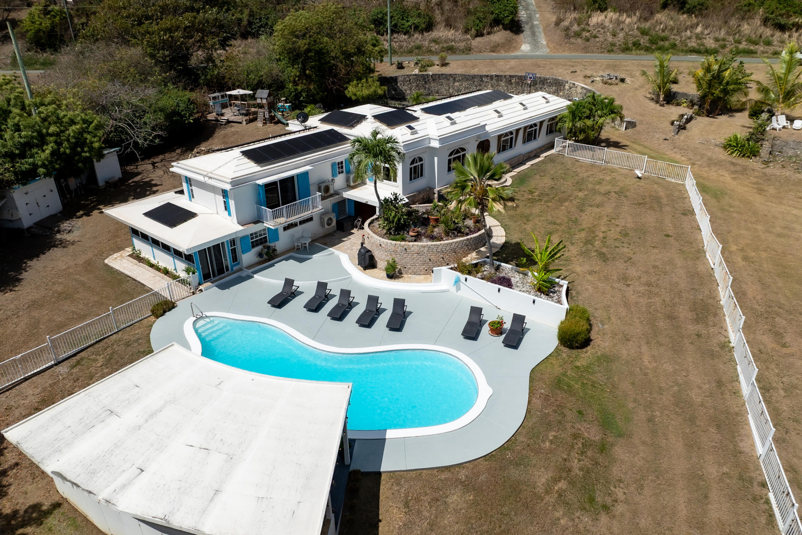Located in the gated enclave of Judith's Fancy, this elegant estate sits on nearly an acre of lush grounds. The main home features 3 bedrooms/2 baths as well as a versatile bonus office space which provides the perfect setting for remote work, creative pursuits, or a private study, bringing function and flexibility to the home's thoughtful layout. On the lower level you will find a 1-bed, 1-bath poolside apartment--ideal for guests or rental income. Powered by 53 solar panels with 4 Tesla batteries, the home offers sustainable luxury. Outdoor living shines with a pool, sun deck, cabana, and playground. The primary suite is a true retreat, complete with a private balcony overlooking the grounds, ideal for morning coffee or sunset cocktails.Best of all, you're just a short stroll to the turquoise waters of the Caribbean Sea. This is a rare opportunity to own a refined Caribbean sanctuary in one of St. Croix's most sought-after communities.