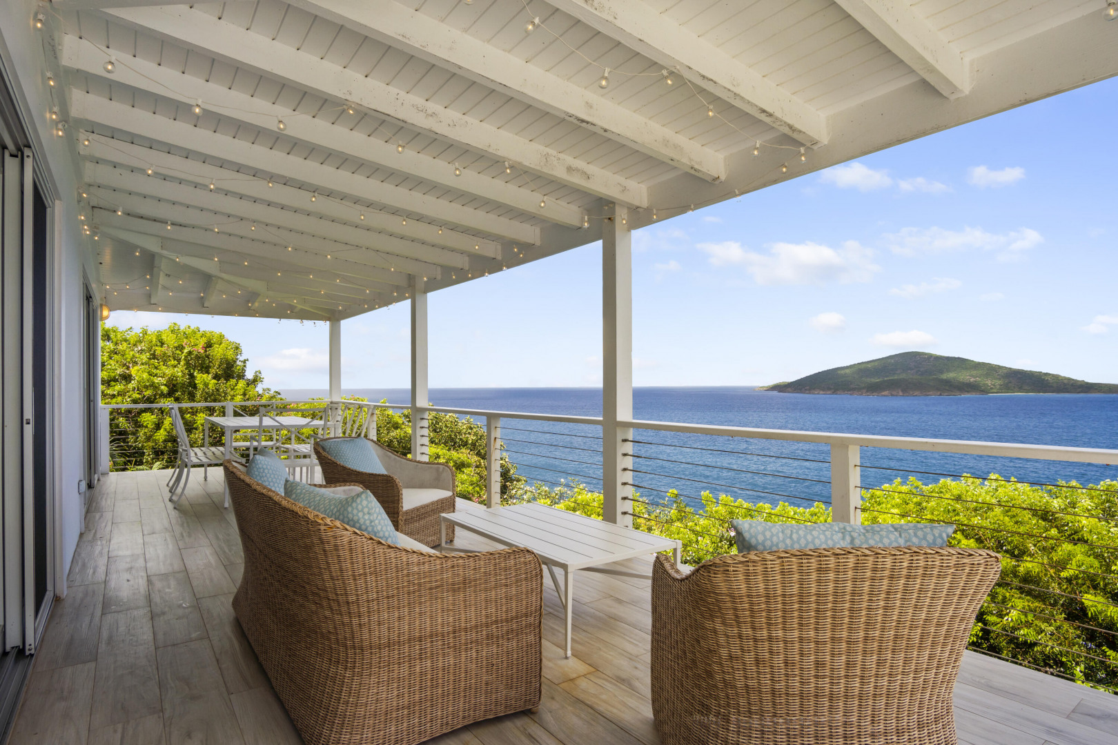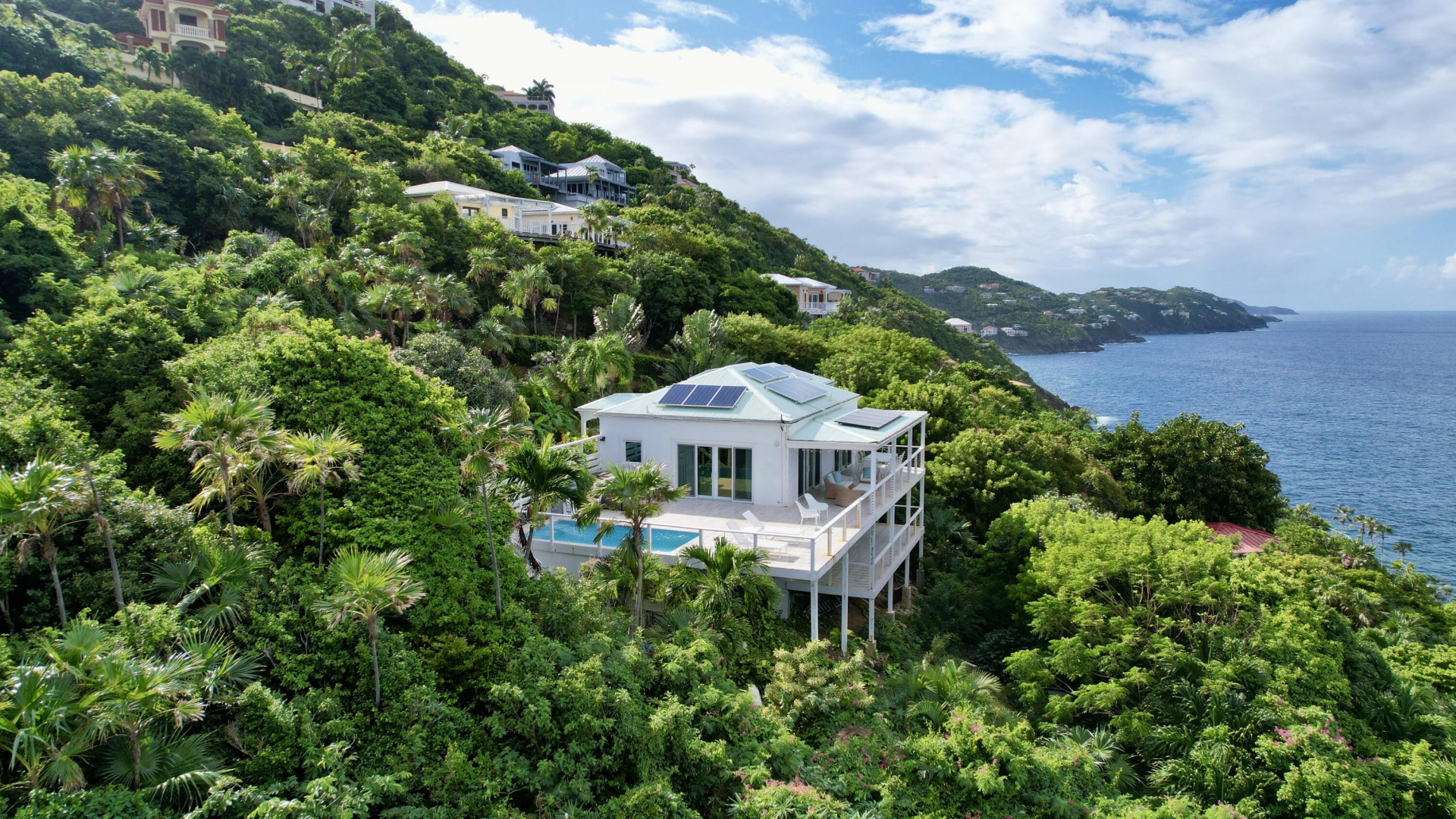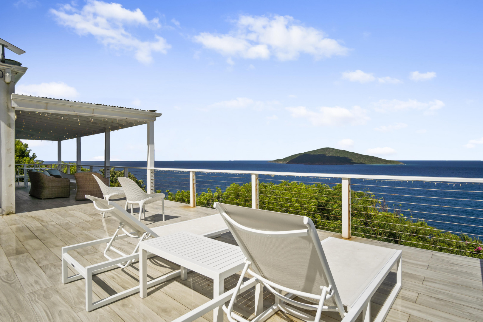 Located in the gated neighborhood of Mahogany Run, this beautifully updated 3-bedroom, 3.5-bath home offers breathtaking down-island views. Designed with energy efficiency in mind, the property features 31 solar panels, three Tesla power walls, and a solar hot water heater. The home boasts new impact windows, a remodeled kitchen and bathrooms, and professionally decorated interiors, creating a stylish and inviting living space- All conveniently situated under one roof. Step outside to enjoy expansive covered porches, a private pool, and a relaxing hot tub, perfect for taking in the stunning surroundings. Every detail has been carefully considered to enhance your living experience.