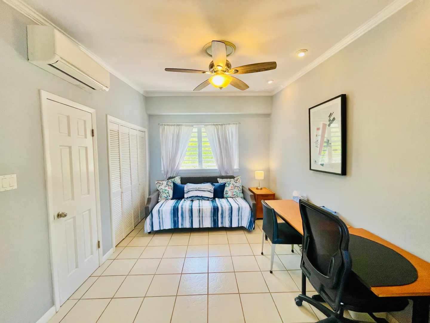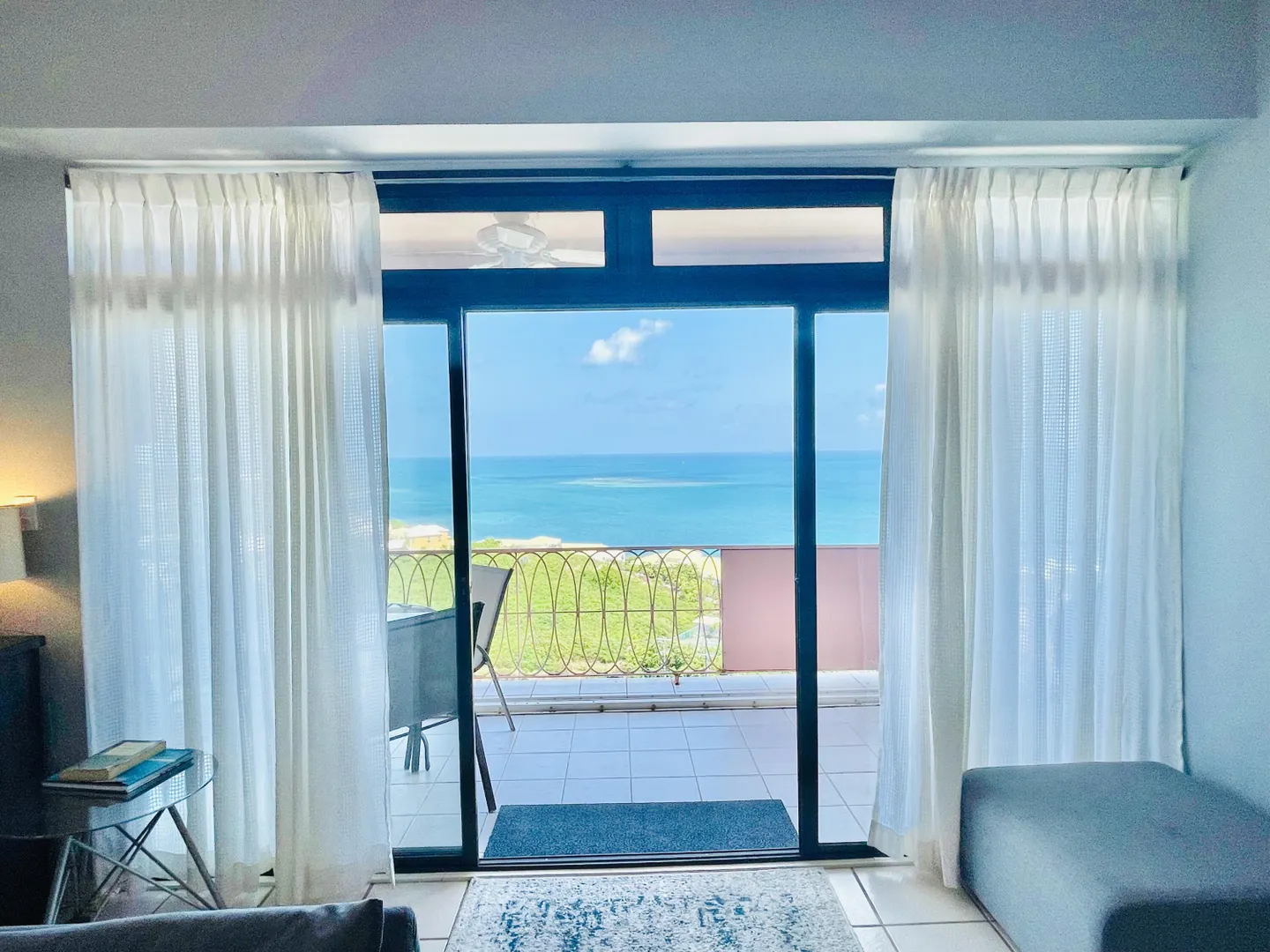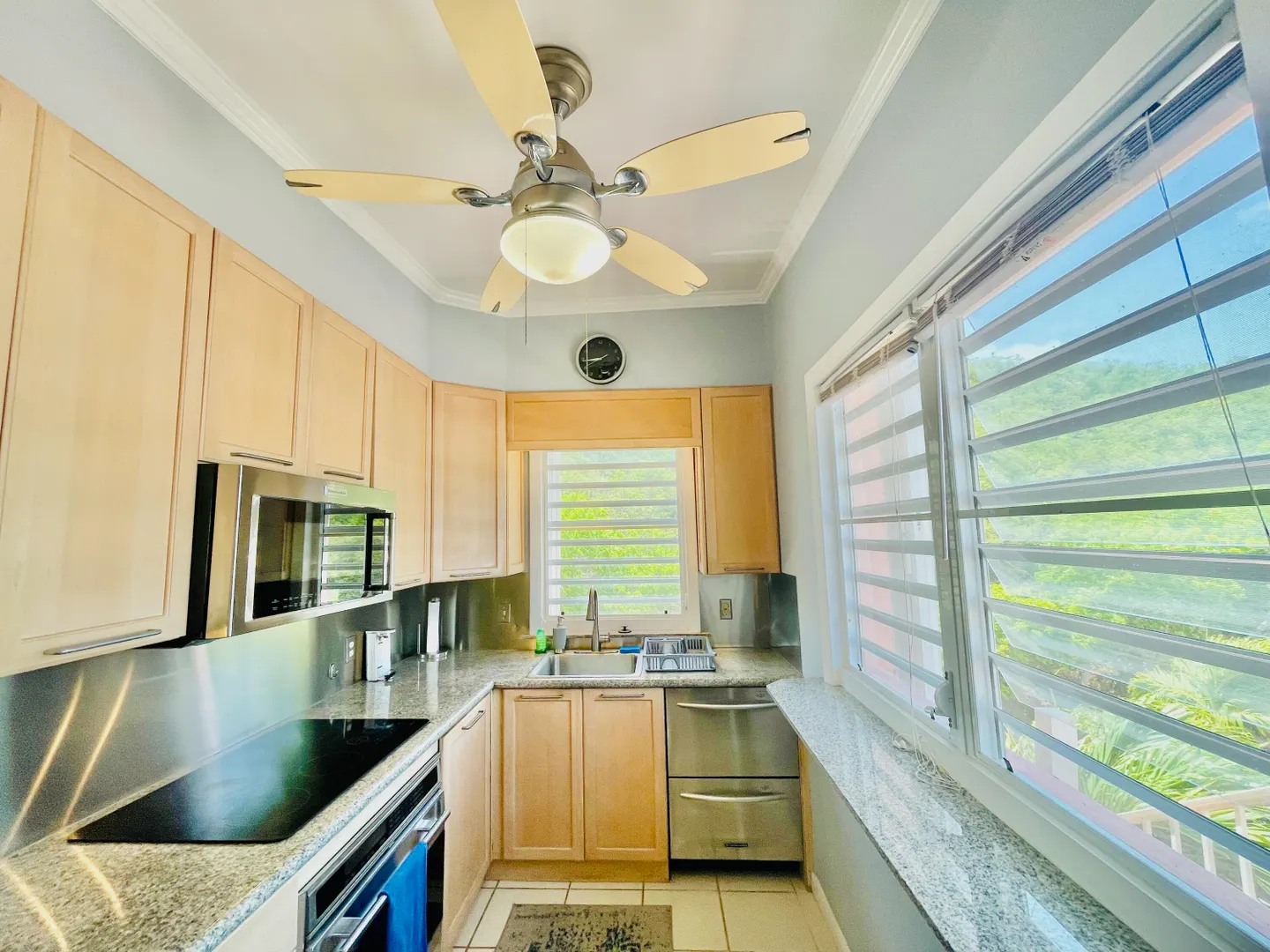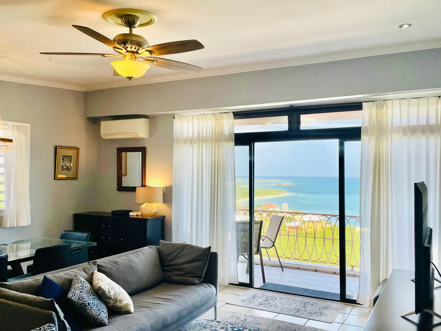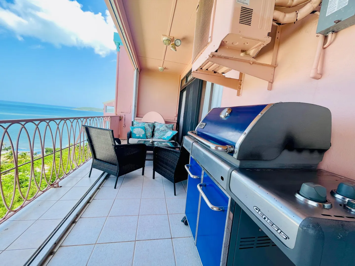 Feel like you are on top of the world in this renovated top floor corner unit. Sit on your large gallery enjoying BBQ watching sail boats pass by overlooking the ocean, Buck island and green valleys.This unit has A/Cs throughout and new interior ceiling fans operated via remote control. All tastefully selected furniture, a Weber grill, and top of the line appliances are conveyed with the sale. The kitchen features a water dispenser, a wine cooler, an additional freezer and a double dishwasher for high efficiency and water conservation.This beautiful Condo is move-in ready for you, your vacation or long-term renters.HOA fees include insurance, internet, water, monthly pest control, an auto generator powering all units in the complex, a storage locker, on-site mailboxes, a