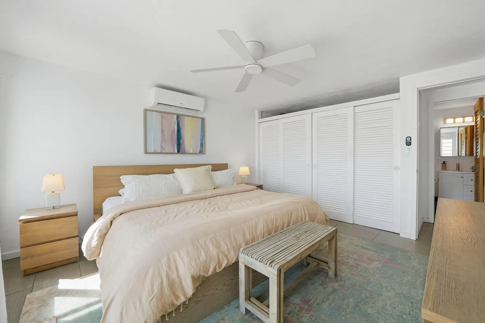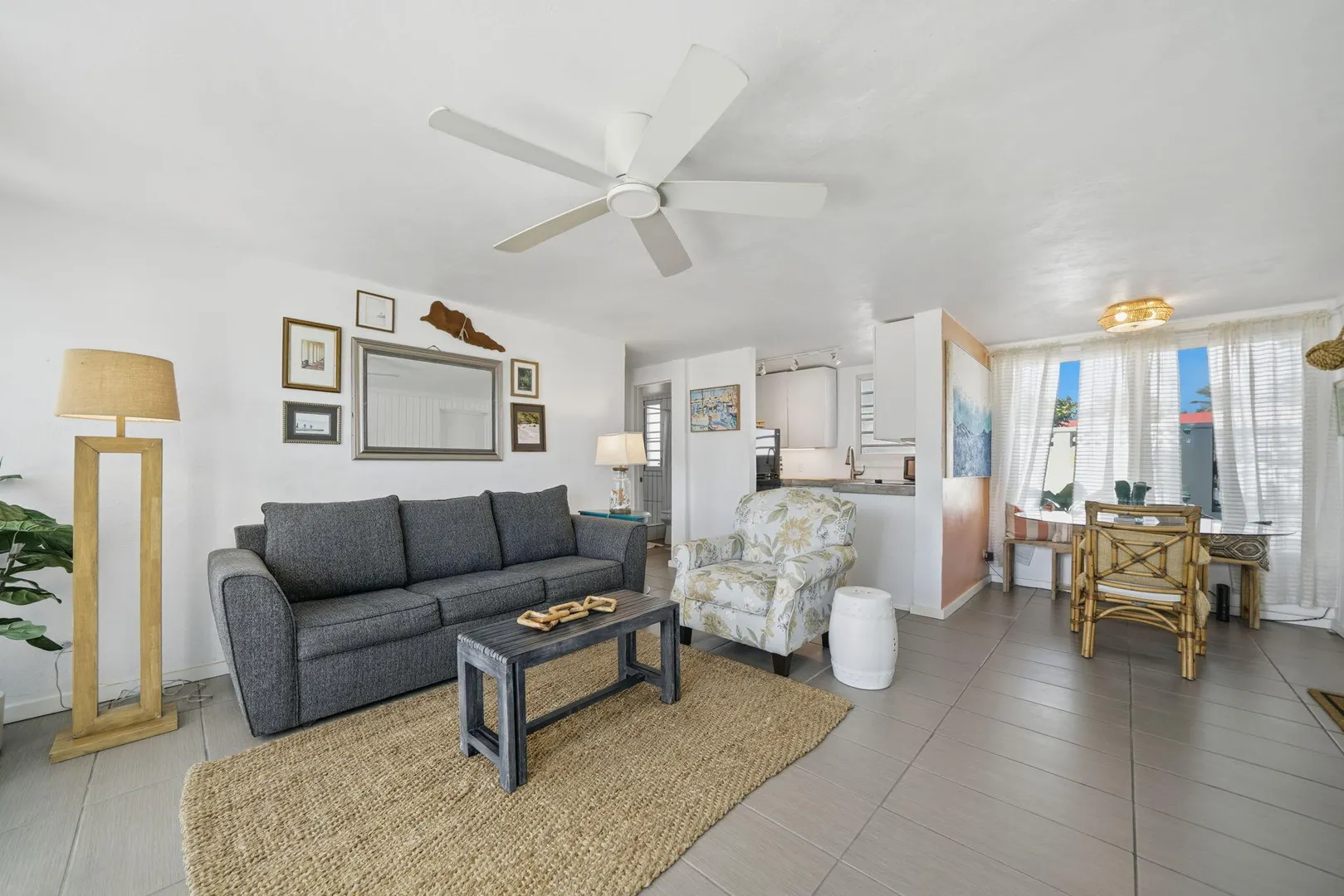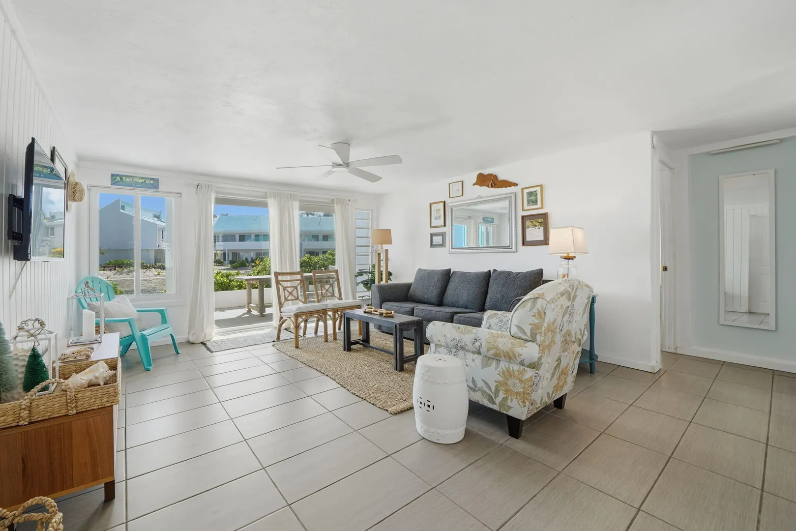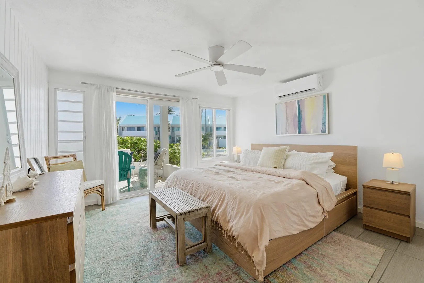 Ground-floor one-bedroom beachfront condo at Cruzan Princess with Buck Island and Caribbean Sea views from both the living room and bedroom. Steps from the pool and sandy beach, this fully furnished, turnkey unit is ideal as an immediate income-producing vacation rental or a move-in-ready personal retreat. Hurricane-rated sliding glass doors open to a spacious covered gallery, allowing seamless indoor-outdoor living with air conditioning or cooling trade winds. Northeast exposure provides steady breezes and beautiful sunrises. Tastefully furnished in a modern, understated coastal style, this condo offers effortless island living with proven rental success.Offered fully furnished, this unit is thoughtfully equipped for easy ownership and immediate vacation rental use, including backup linens and a well-stocked kitchen setup. Air conditioning, on-site laundry, and a compact, efficient kitchen with solid concrete countertops enhance comfort and functionality. Additional features include a tiled walk-in shower, tankless water heater, and a large walk-in closet with generous storage.