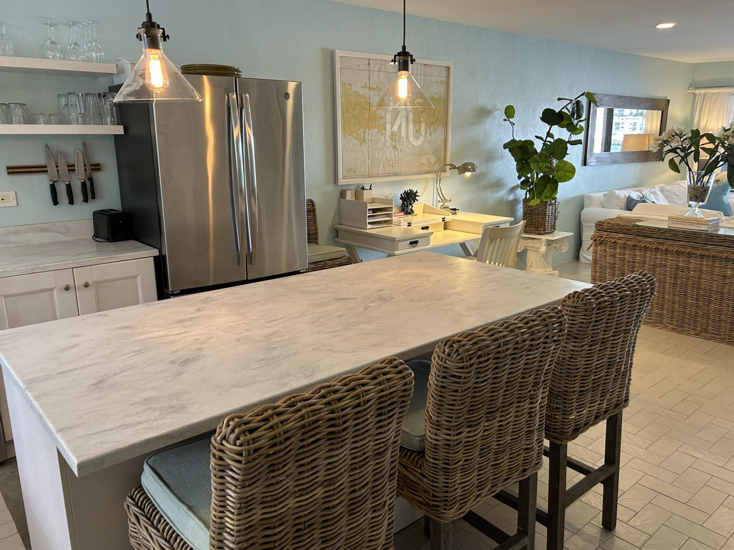 This crisp Caribbean decor blends beautifully with the white sand beach just steps from your porch. Nicely renovated with quartz counters and a large island that seats 4, this condo borders the St. Thomas Yacht Club - walk to lunch and dinner - and is minutes from the Red Hook shopping and restaurant district. Featuring central AC, a W/D and auto generator.