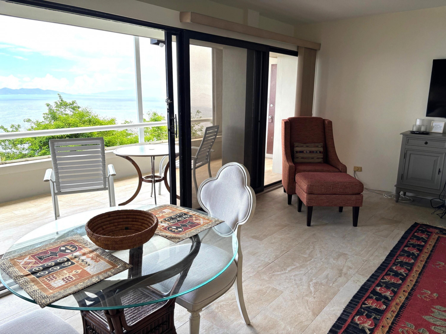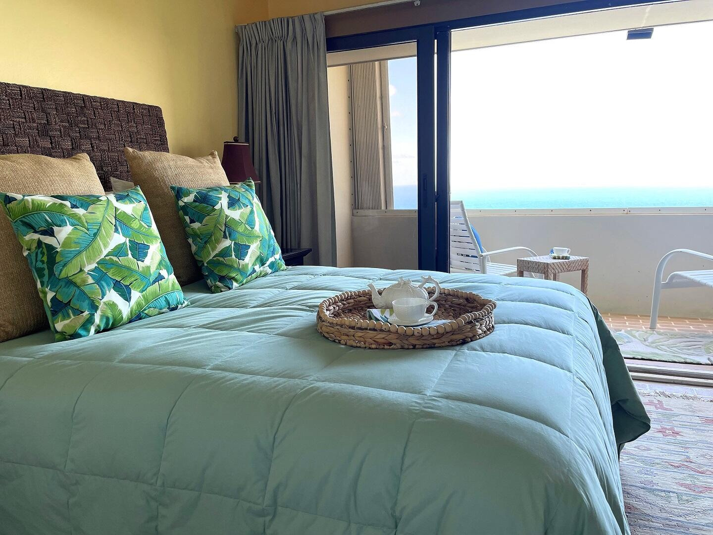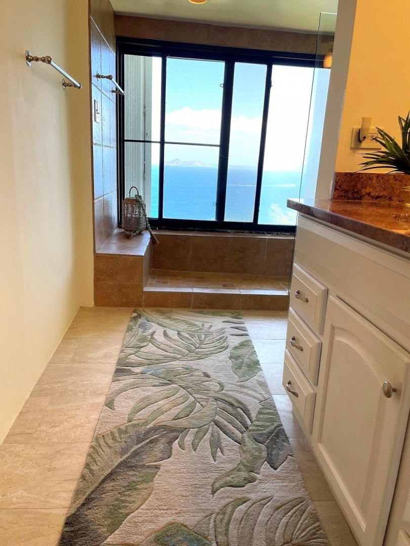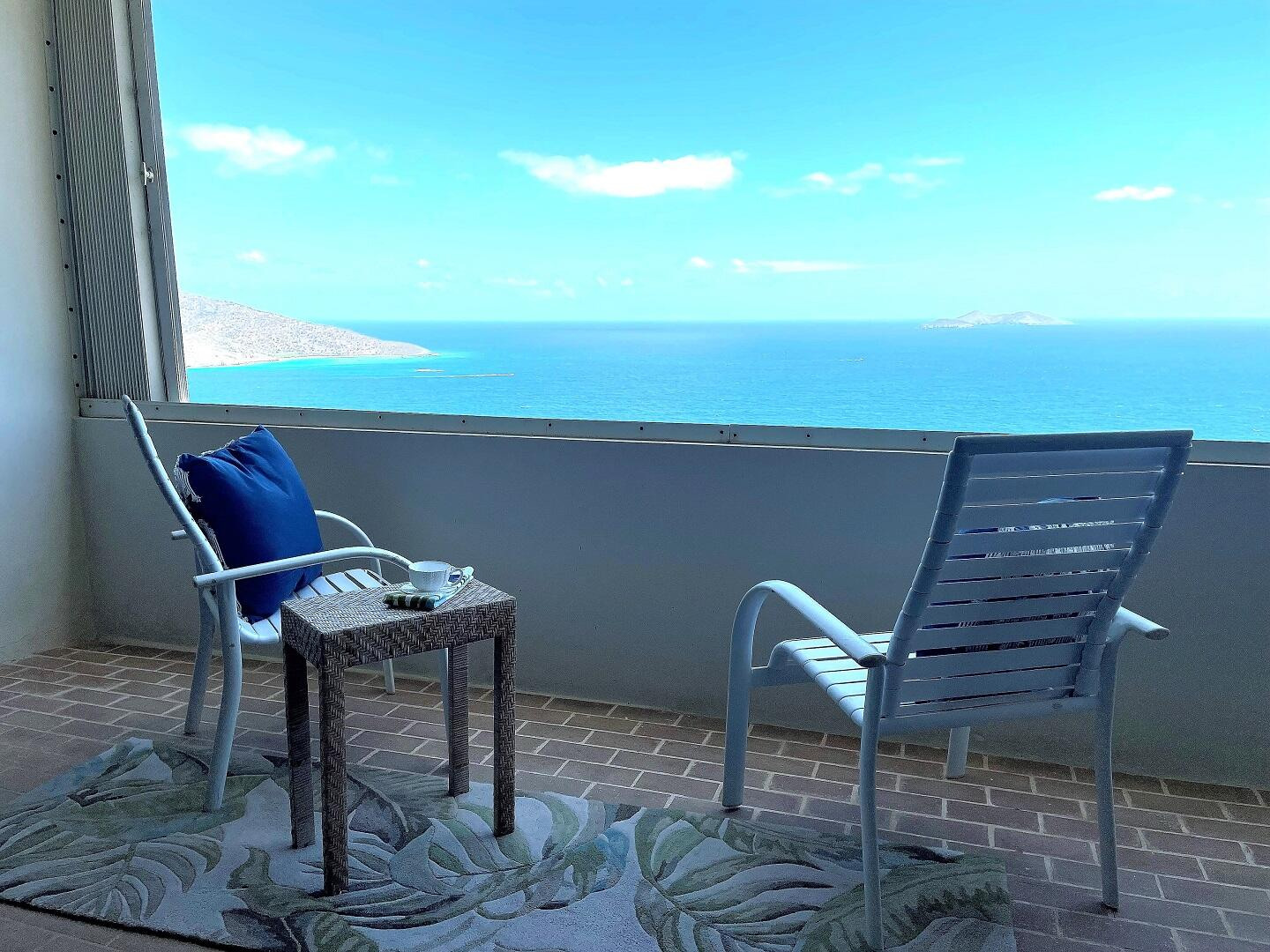AN OCEAN VIEW FROM EVERY ROOM. This quiet and very private one bedroom condominium offers stunning ocean and down island views. The remodeled kitchen features Cambria quartz counter tops, custom cherry cabinets and stainless steel appliances. The remodeled bath has a granite vanity top and large walk-in shower overlooking the ocean. This freshly painted condo also features Italian porcelain tile floors, 2 Hunter original ceiling fans, 2 Mitsubishi mini-split air-conditioners and heavy duty accordion hurricane shutters. A 40Kw diesel generator powers all 3 units in the building when the power goes out. Designer furnishings by Silk Greenery, Ballard and other fine furniture makers. A short walk takes you to the Sanderling Court swimming pool. Owner is a licensed VI Realtor.Some owners at Mahogany Run have opted, at their expense, to replace some or all of their sliding glass doors and windows. Call Marsha for more information on current pricing. Please note that reduced price reflects that cost.