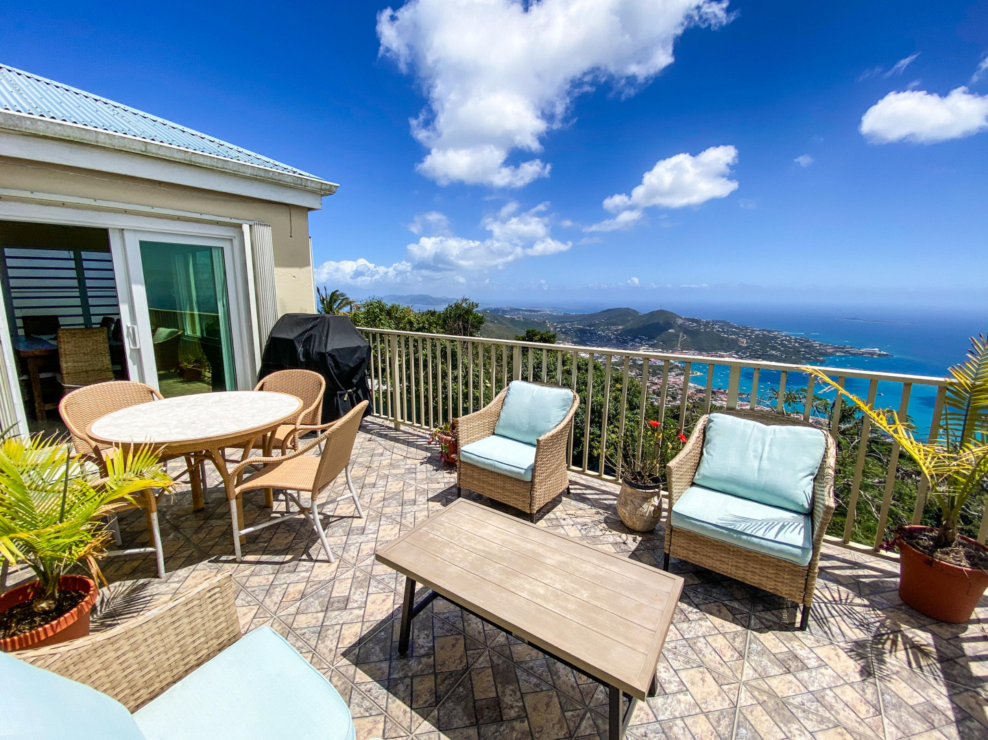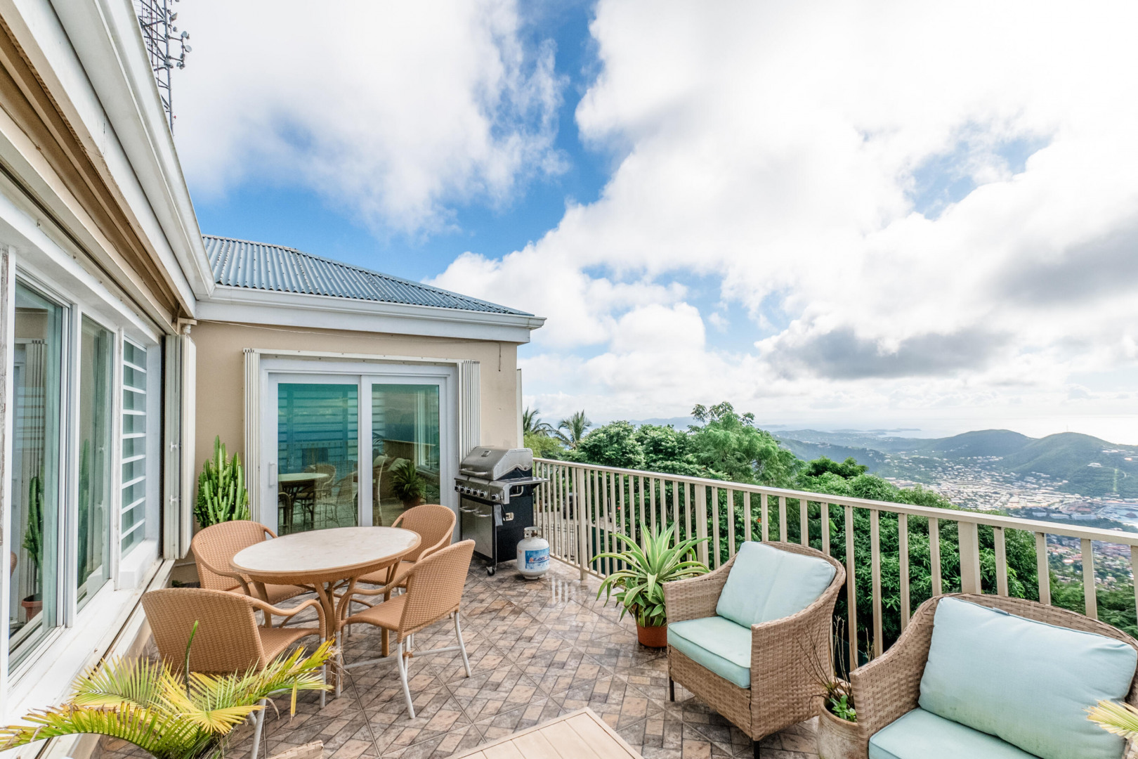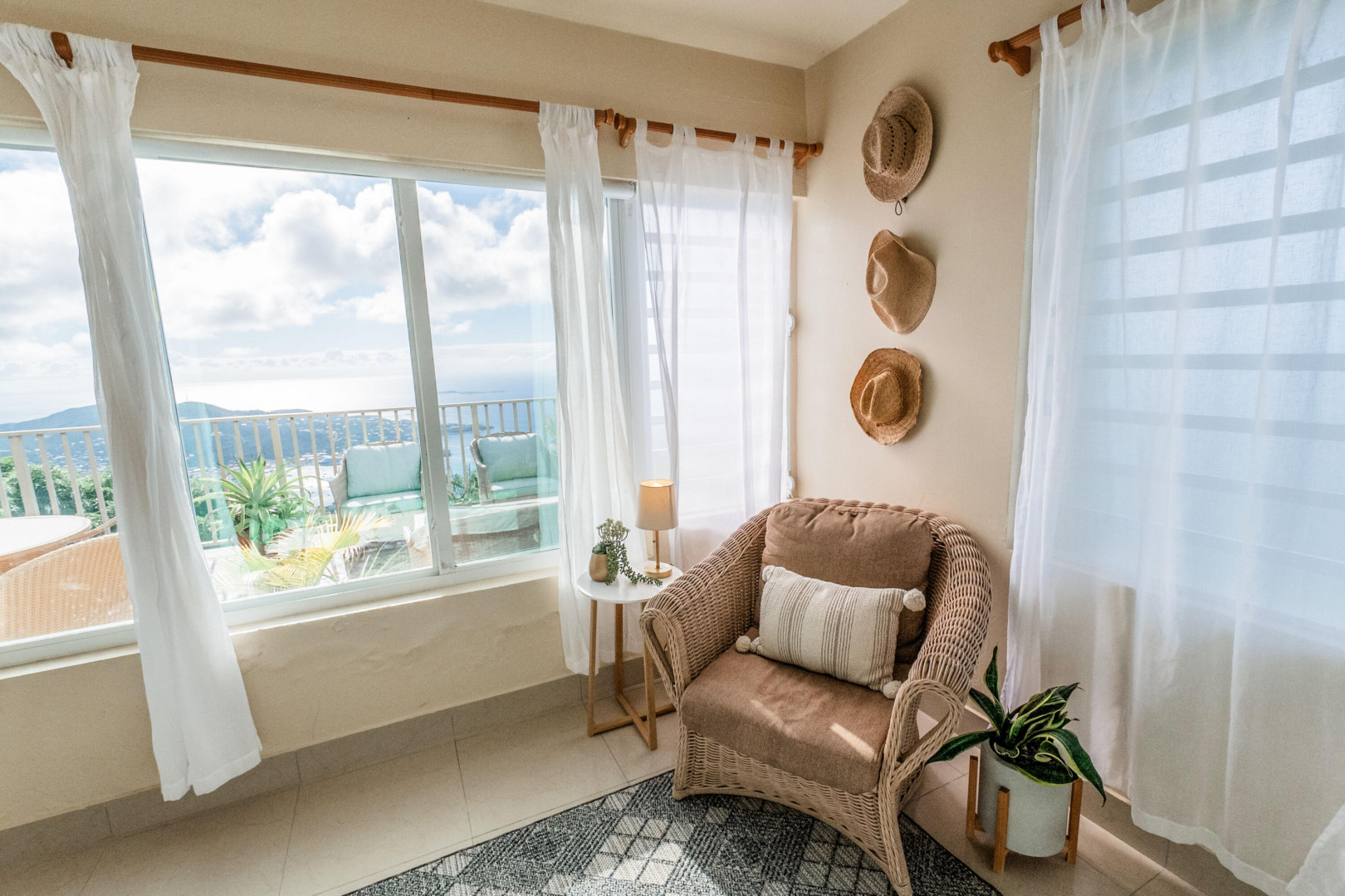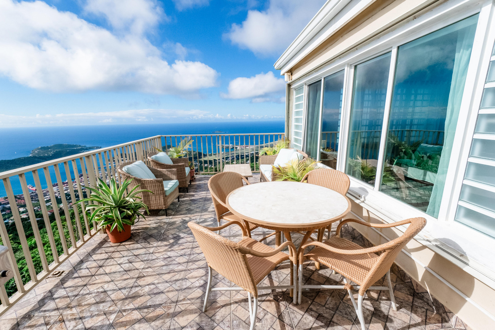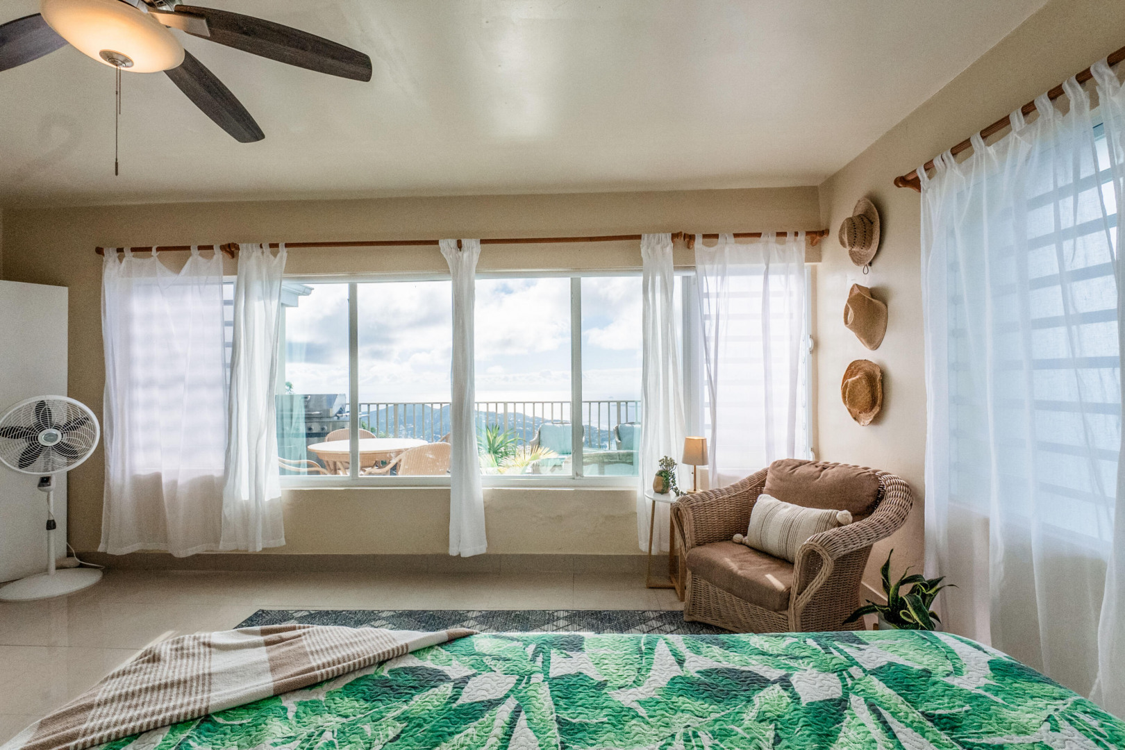 Nestled in an tropical oasis, this spacious 3-bedroom, 2-bathroom condo offers the perfect blend of comfort and convenience. Just steps away from the world-renowned Mountain Top, you'll enjoy panoramic views that stretch from the British Virgin Islands and St. John to Puerto Rico, St. Croix and Water Island. Inside, the open-concept living space is flooded with natural light, offering a welcoming atmosphere for both relaxation and entertaining. The interior of the condo is a boho dream! Offering a well-appointed kitchen, modern bathrooms, and perfectly imagined bedrooms ensure that every inch of this home is designed for comfort, style and storage. Additionally there is a generously sized attic space with full stair case, awaiting your finishing touches. Welcome home!