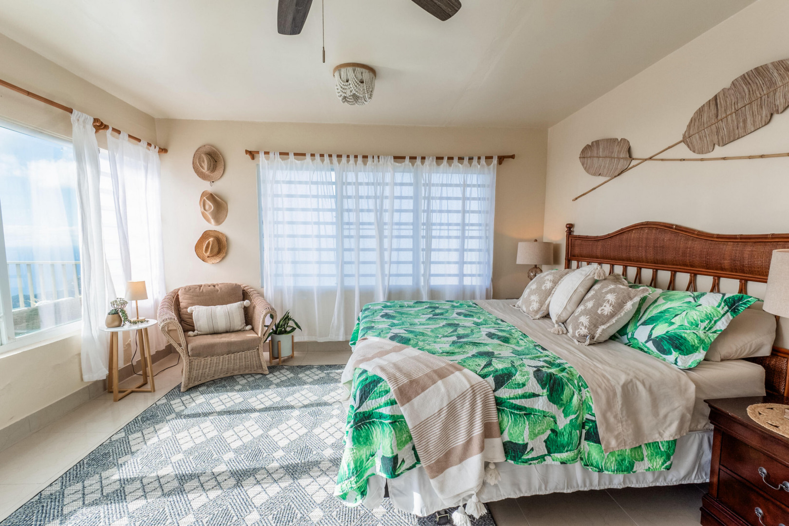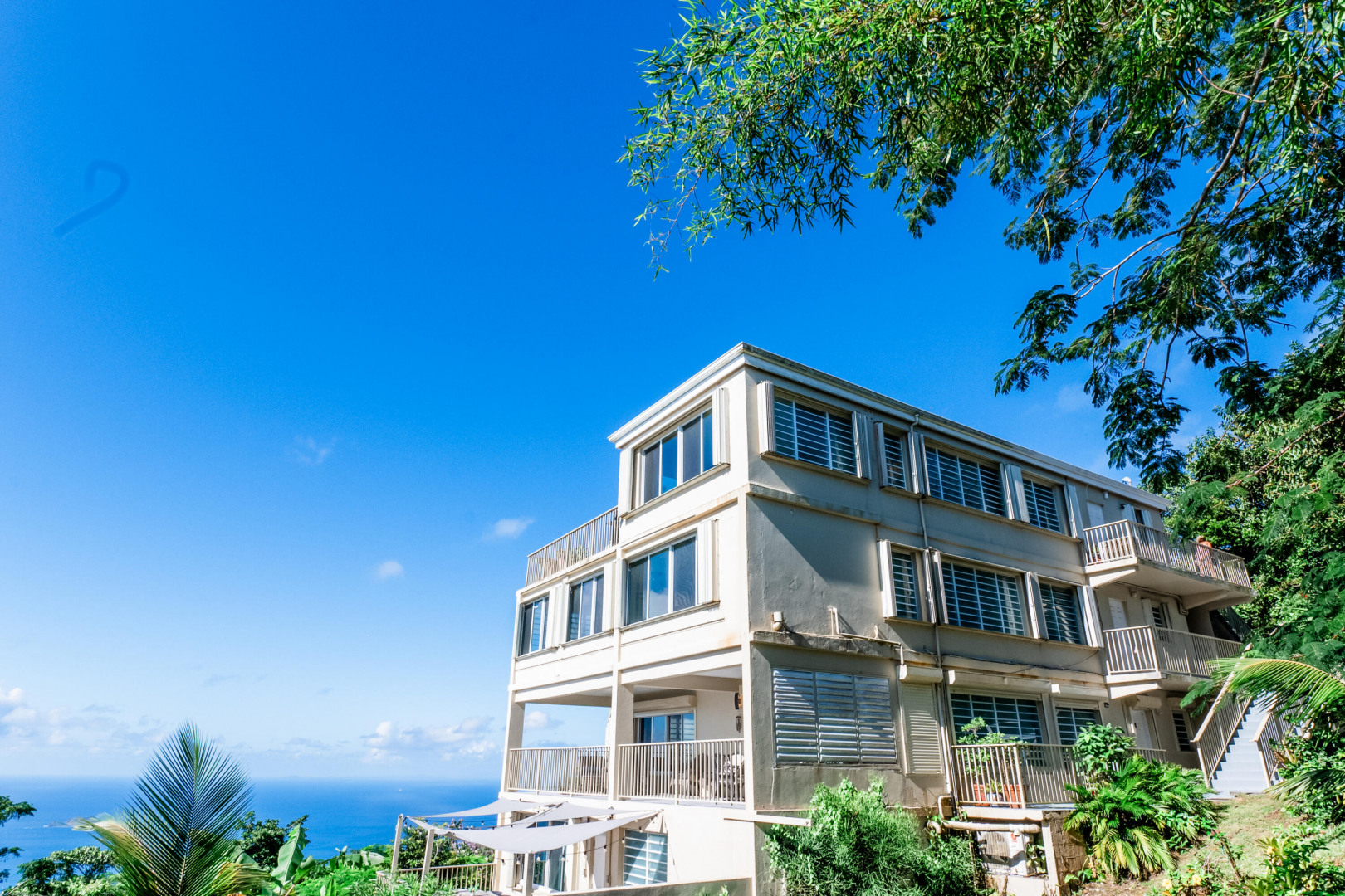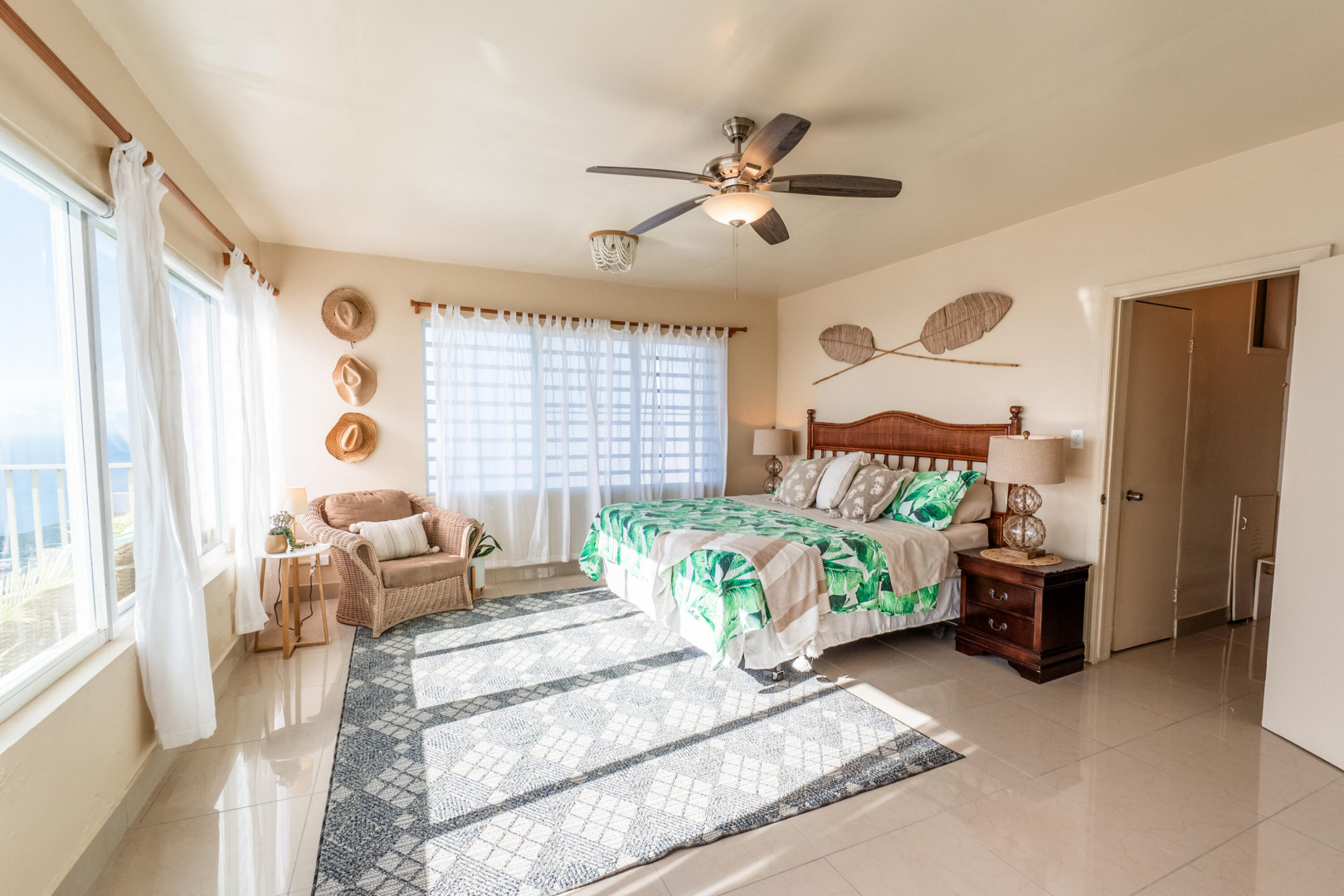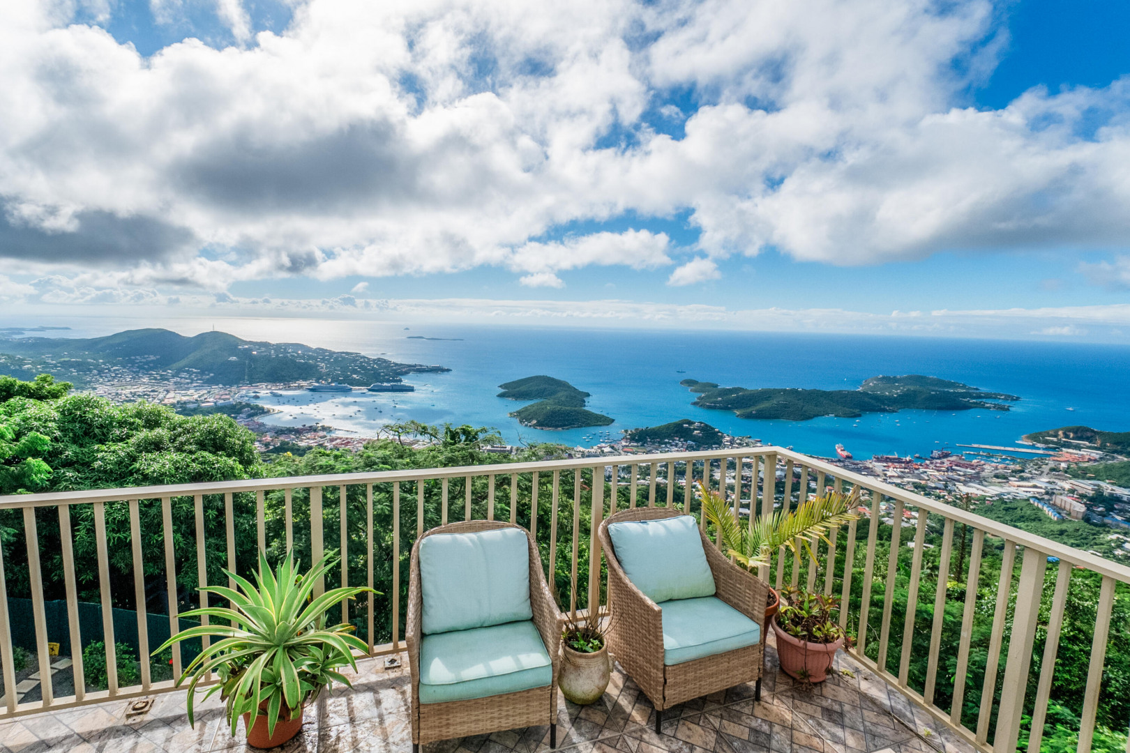 Nestled in an tropical oasis, this spacious 3-bedroom, 2-bathroom condo offers the perfect blend of comfort and convenience. Just steps away from the world-renowned Mountain Top, you'll enjoy panoramic views that stretch from the British Virgin Islands and St. John to Puerto Rico, St. Croix and Water Island. Inside, the open-concept living space is flooded with natural light, offering a welcoming atmosphere for both relaxation and entertaining. The interior of the condo is a boho dream! Offering a well-appointed kitchen, modern bathrooms, and perfectly imagined bedrooms ensure that every inch of this home is designed for comfort, style and storage. Additionally there is a generously sized attic space with full stair case, awaiting your finishing touches. Welcome home!