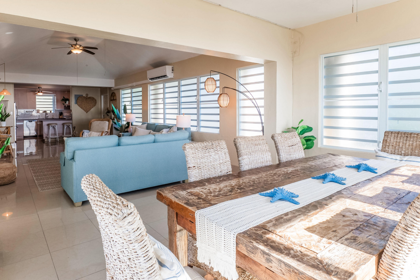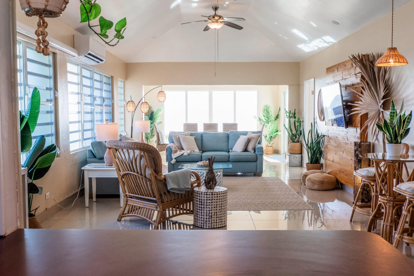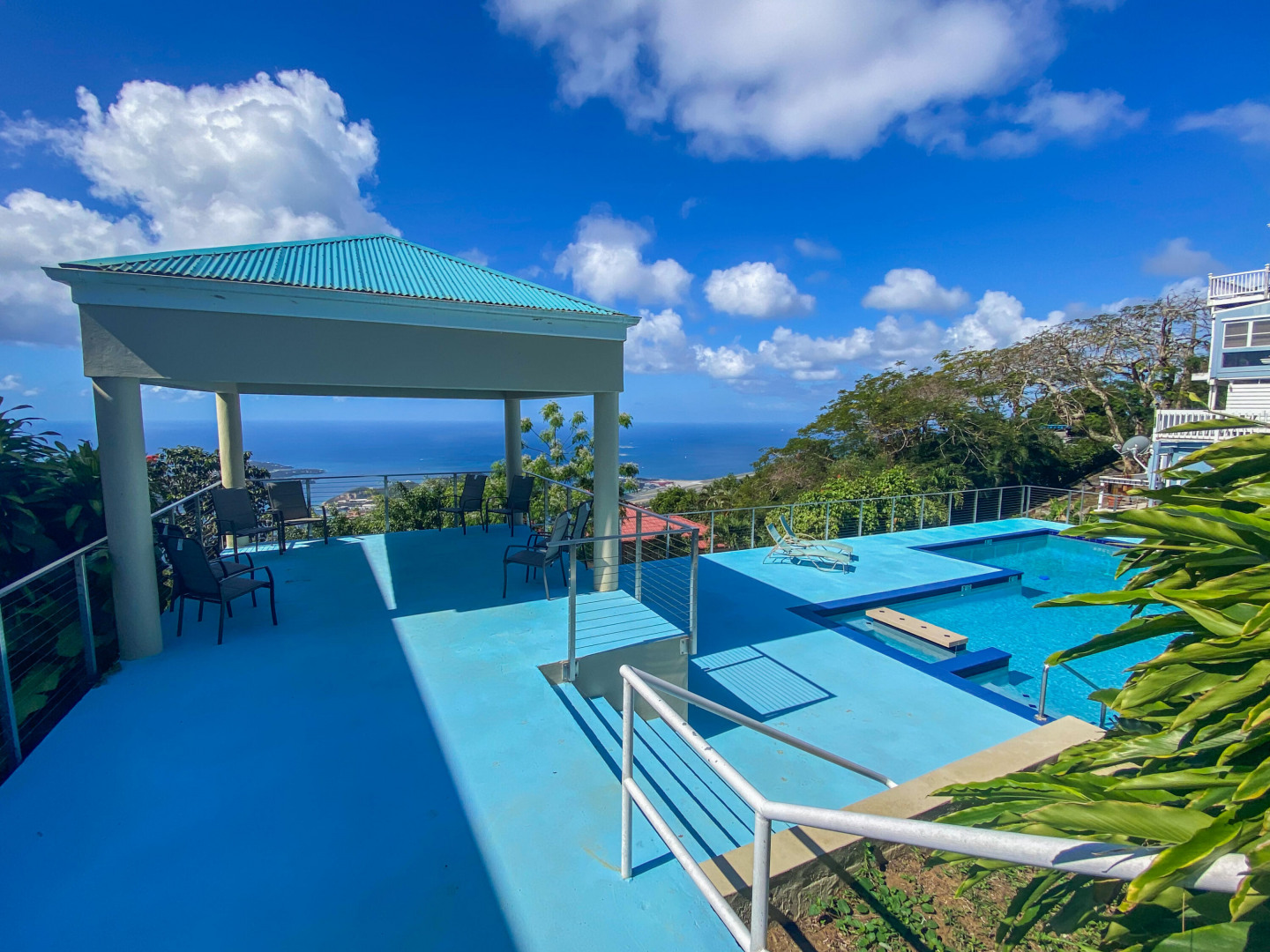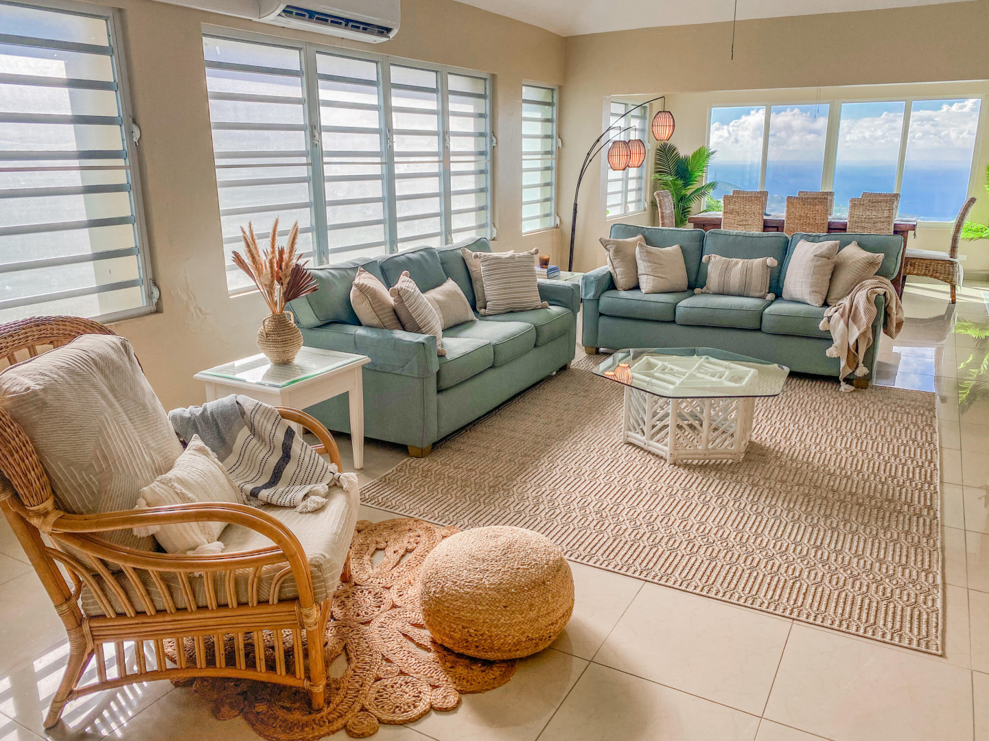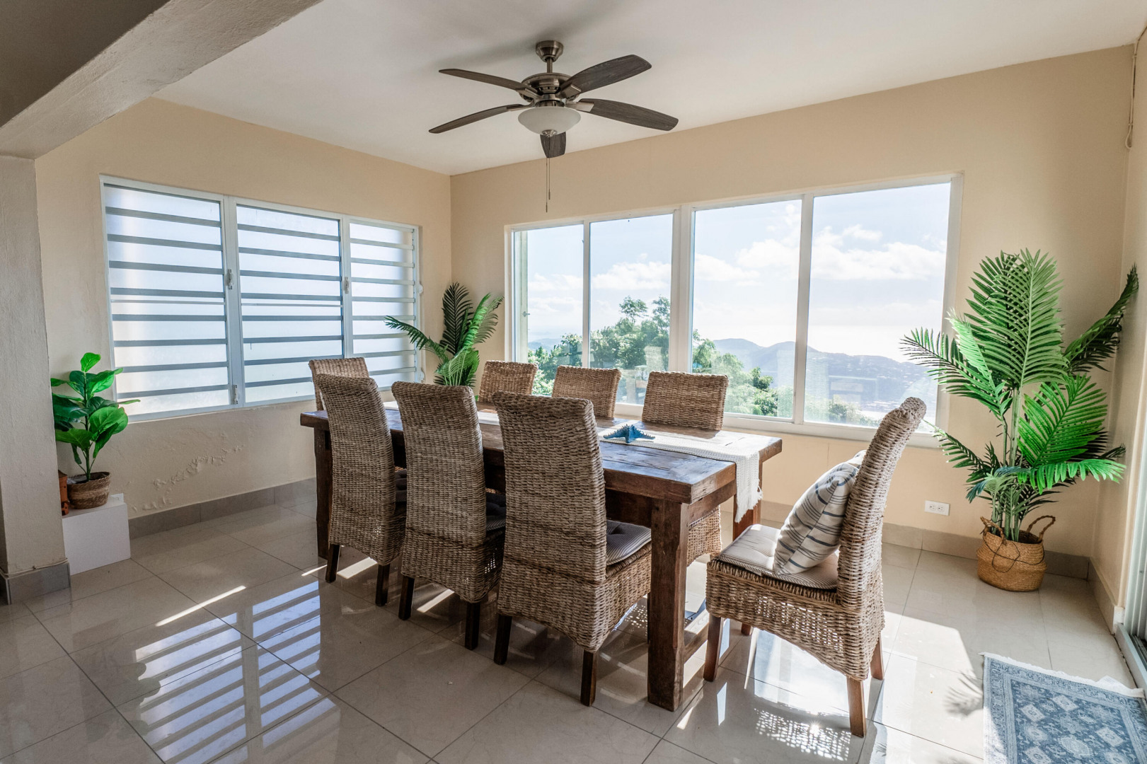 Nestled in an tropical oasis, this spacious 3-bedroom, 2-bathroom condo offers the perfect blend of comfort and convenience. Just steps away from the world-renowned Mountain Top, you'll enjoy panoramic views that stretch from the British Virgin Islands and St. John to Puerto Rico, St. Croix and Water Island. Inside, the open-concept living space is flooded with natural light, offering a welcoming atmosphere for both relaxation and entertaining. The interior of the condo is a boho dream! Offering a well-appointed kitchen, modern bathrooms, and perfectly imagined bedrooms ensure that every inch of this home is designed for comfort, style and storage. Additionally there is a generously sized attic space with full stair case, awaiting your finishing touches. Welcome home!
