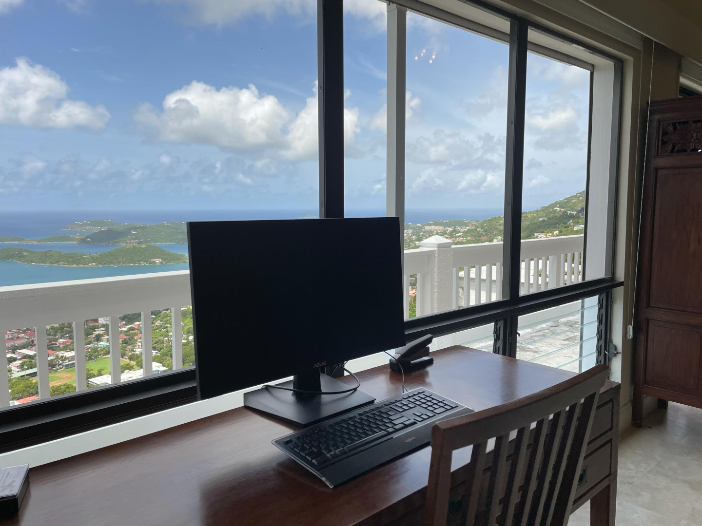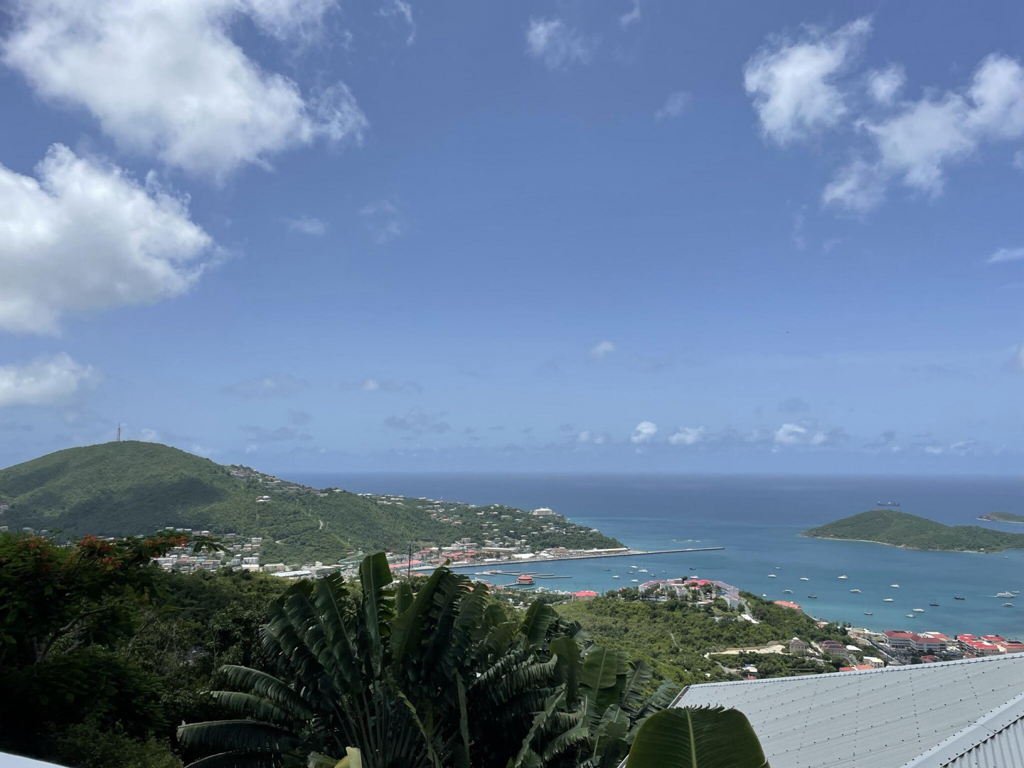 Work from home from your perch in the clouds. A rare find in Harborview Villas, an exclusive gated complex with pool on Skyline Drive. Enjoy stunning panoramic views of picturesque Charlotte Amalie harbor and beyond and is centrally located and convenient for town, airport, world-renowned Magens Bay, or bustling East End. The condo comes fully furnished and equipped with central air, and gourmet kitchen with granite surfaces. Enjoy amazing sunsets from the long balcony and covered lanai. Move-in ready, has not been used as a rental! Buyer to confirm all spaces as existing. No guarantee on specs, buyer to confirm all spaces and build.