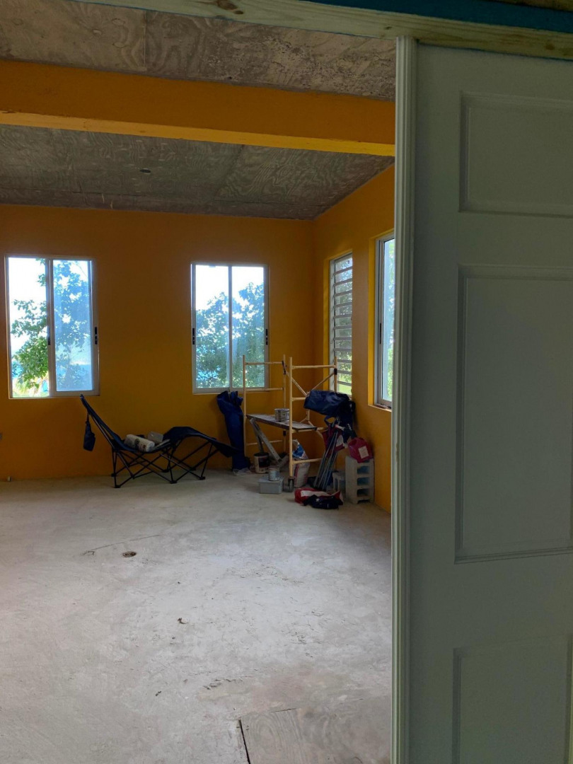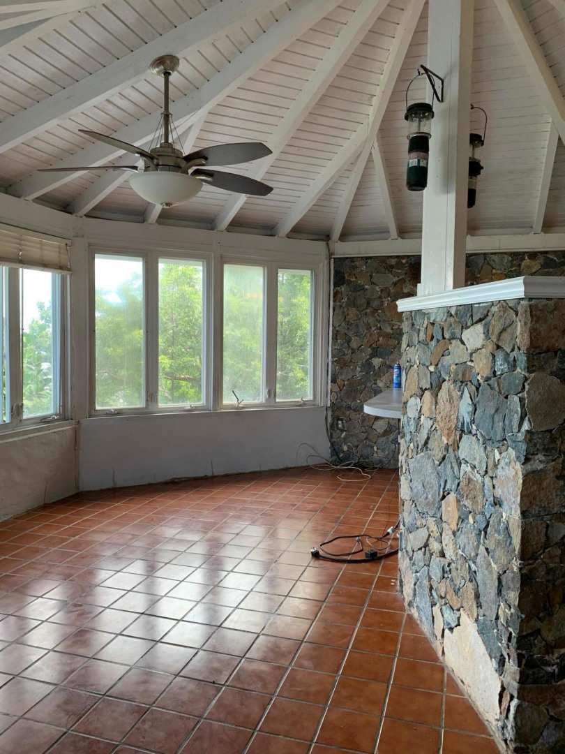 Masonry and stone fixer upper consisting of two hexagons to which the seller has added a spacious wood frame master bedroom. Attractive blue bit sone work inside and out.The home is set among tropical trees, shrubs and boulders. There is an additional space below that may possibly be converted into a bedroom or office.View of Hans Lollick and St. John.Sold As Is.