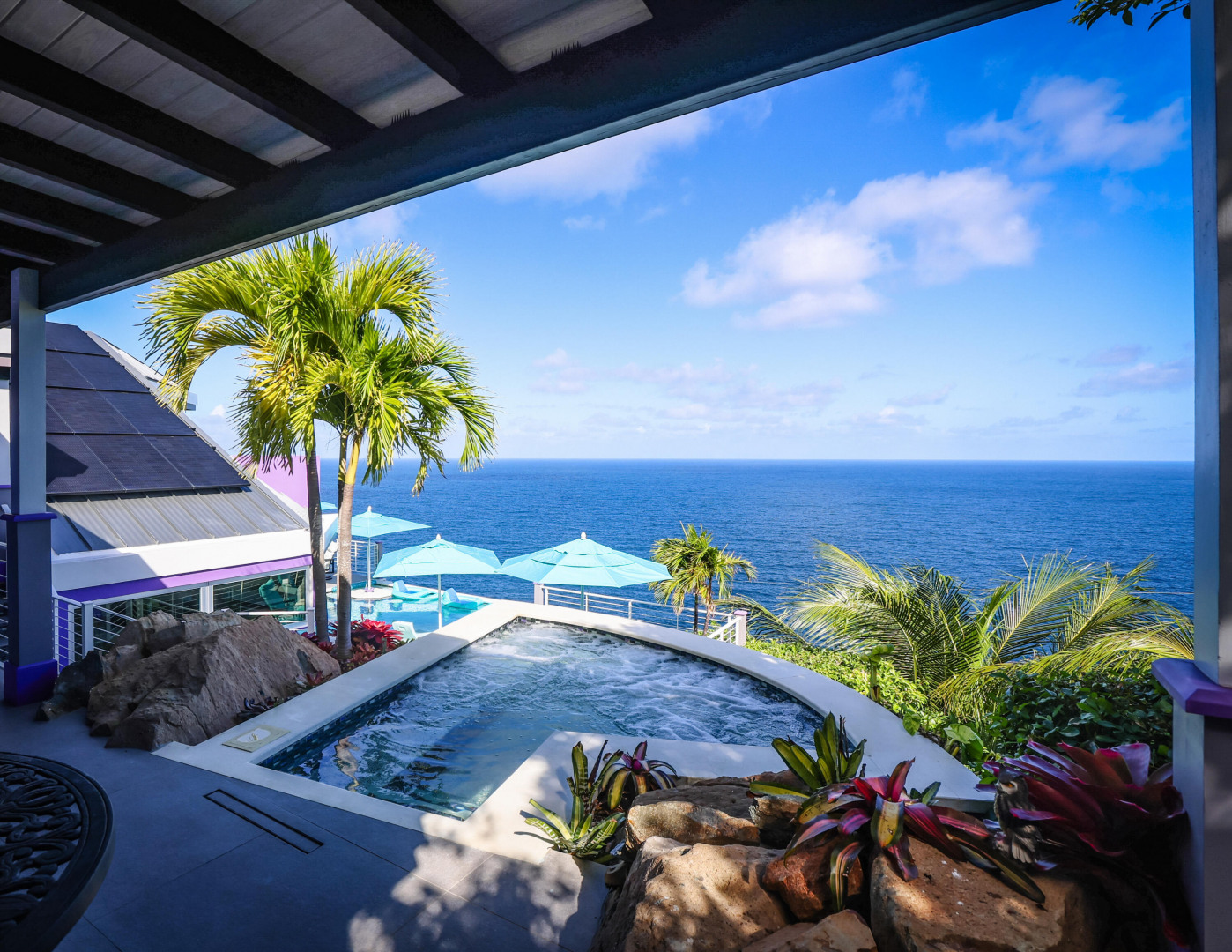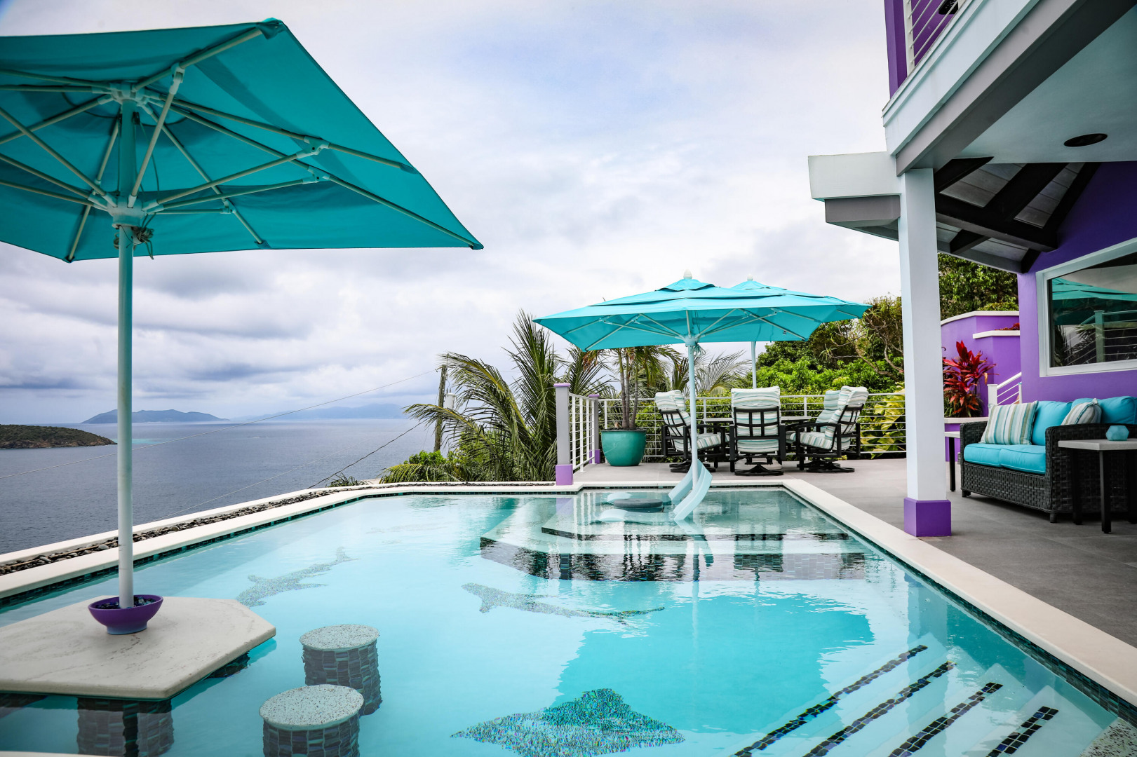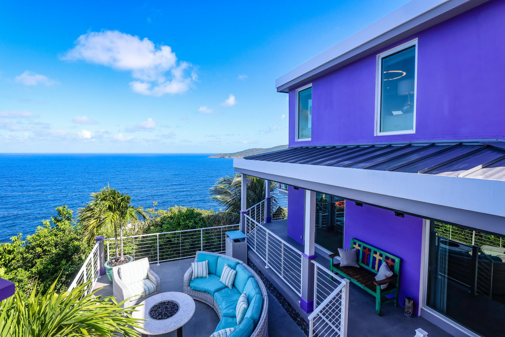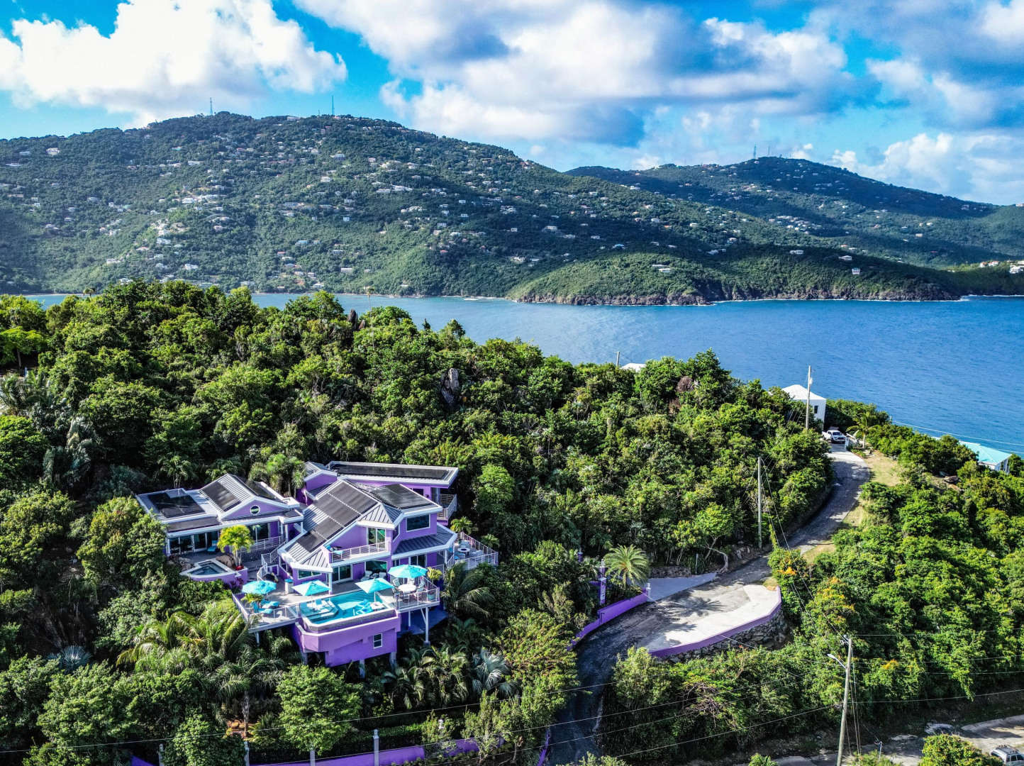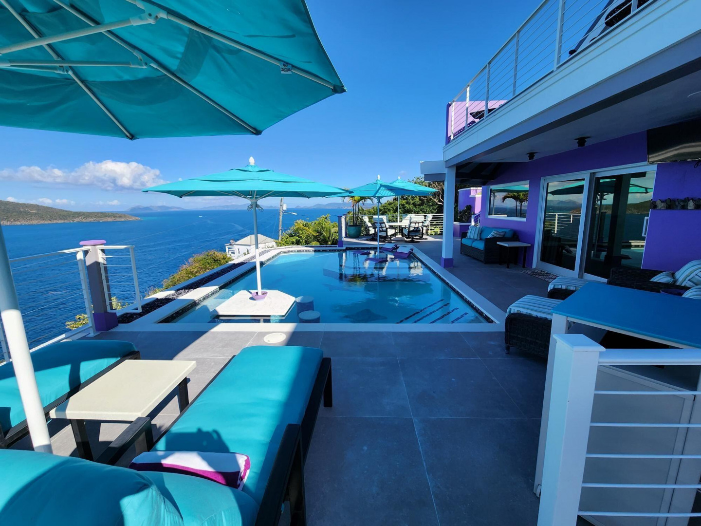 EXQUISITE! Purple Paradise is luxury living at its finest in prestigious Peterborg, St Thomas. Featuring 4 bedrooms, 4.5 bathrooms, 3 custom kitchens, 2 living rooms, and sweeping views of the beautiful ocean view pool and Atlantic Ocean, this custom home is designed with high-end premium amenities, fixtures and landscaping, with a gated/fenced driveway, 2 car garage, 94 solar panels, 6 Tesla batteries, 40KW diesel generator, impact windows, hot tub and heated pool with built-in table and bar stools. Two of the bedrooms are master suites, and the fully equipped gym (4th Bedroom) has a pool table, sauna, shower/bath and kitchen. The modern amenities, along with the professional lighting and tropical landscaping, showcase this property above others. See list of Special Features attached