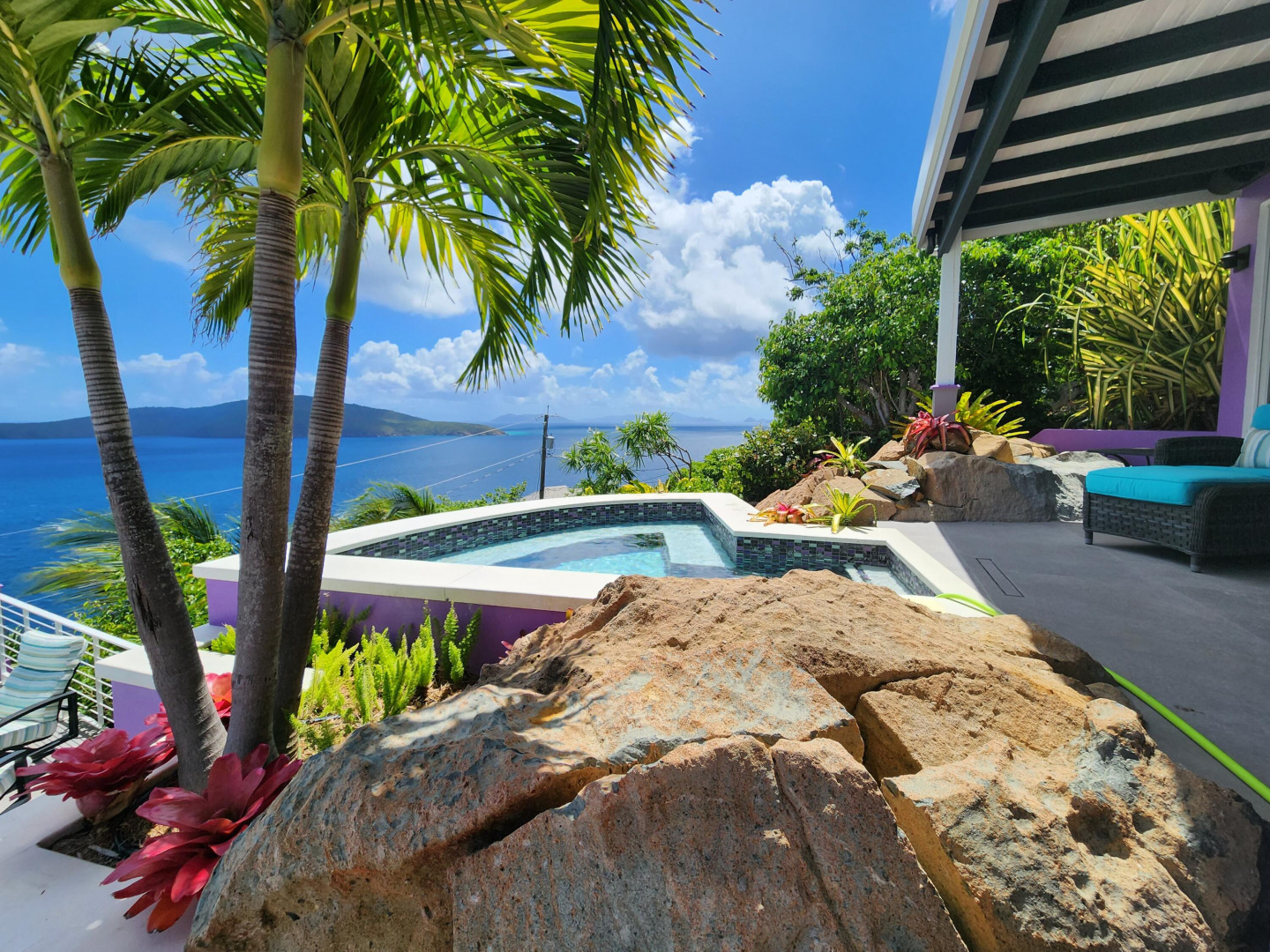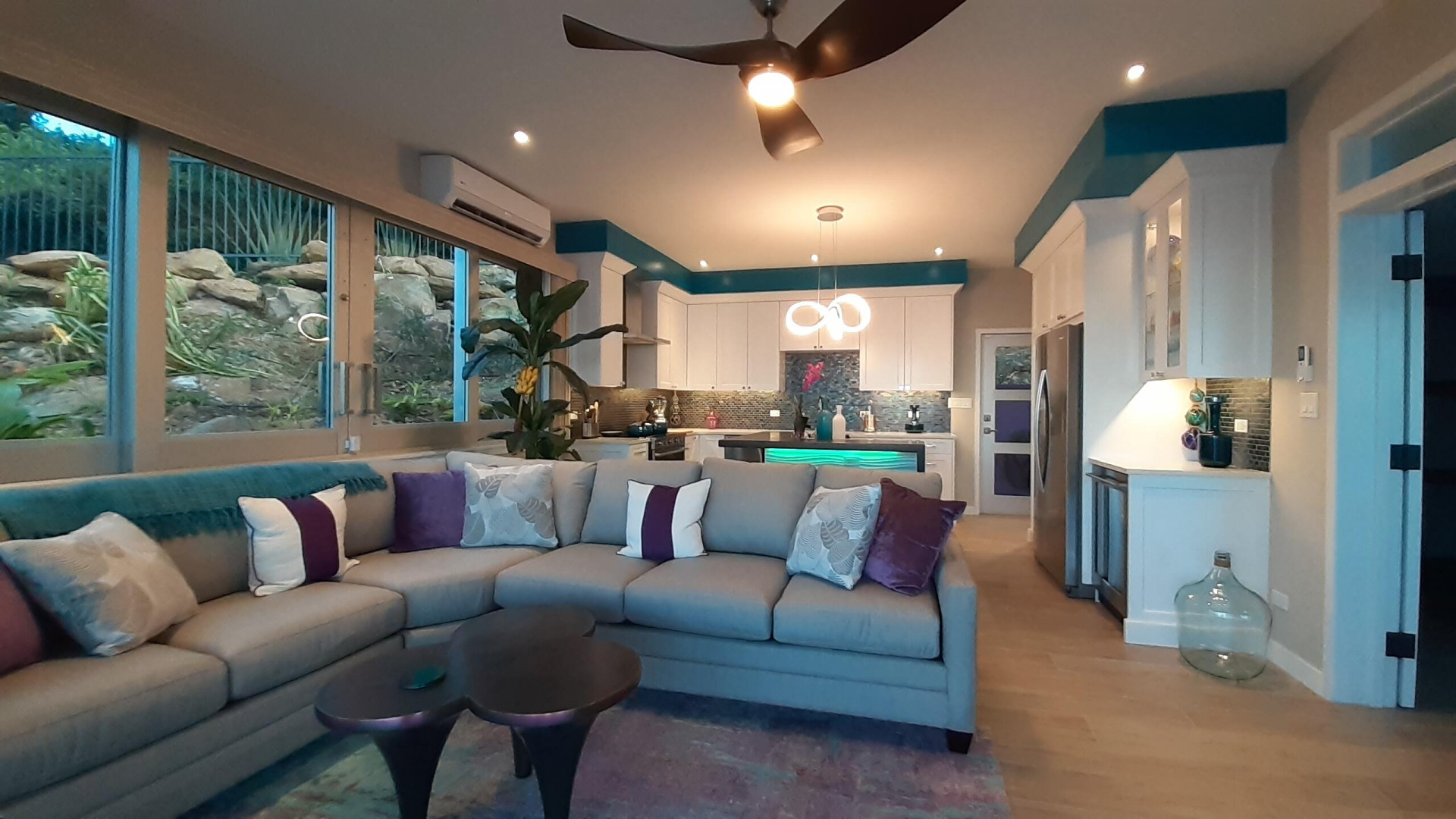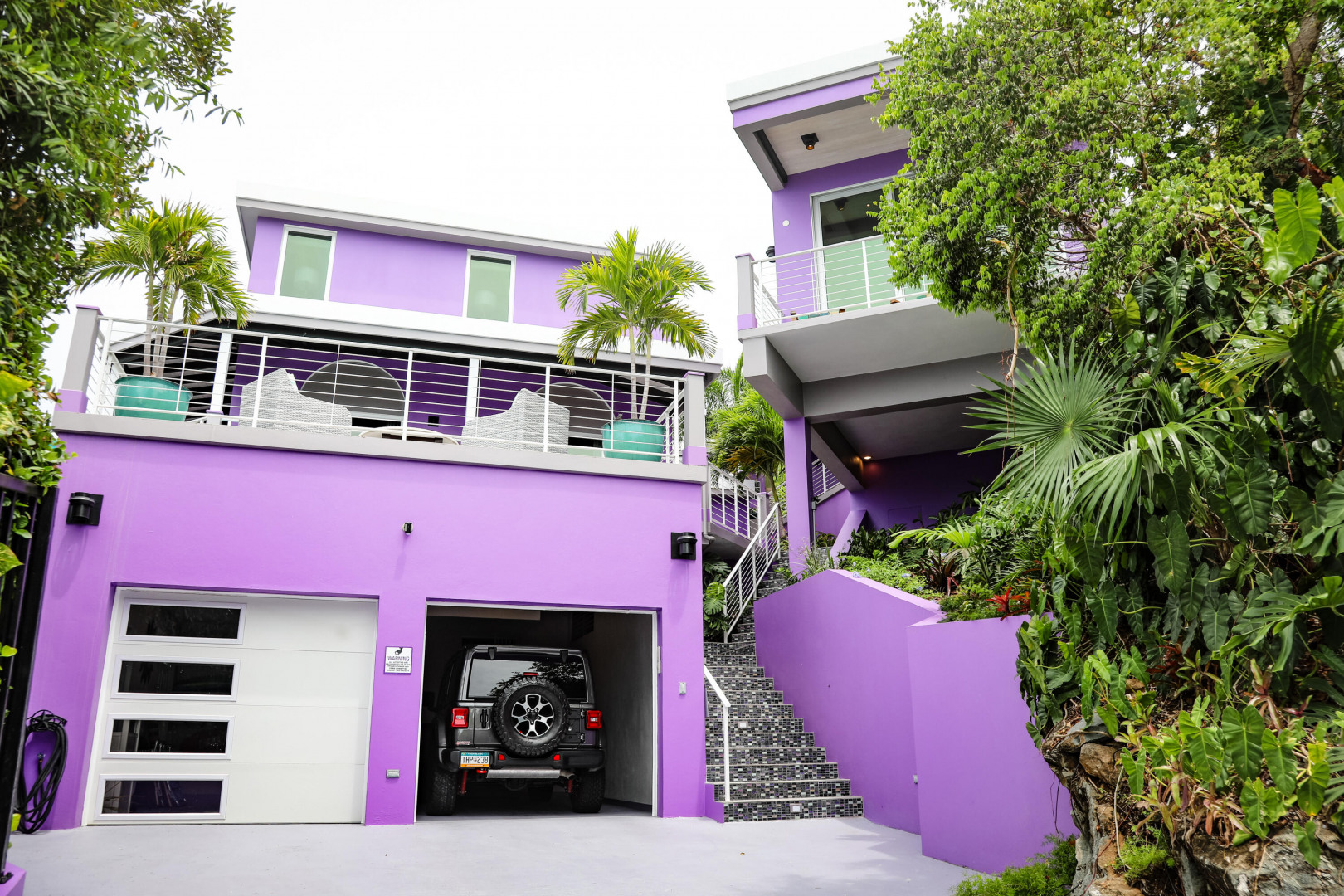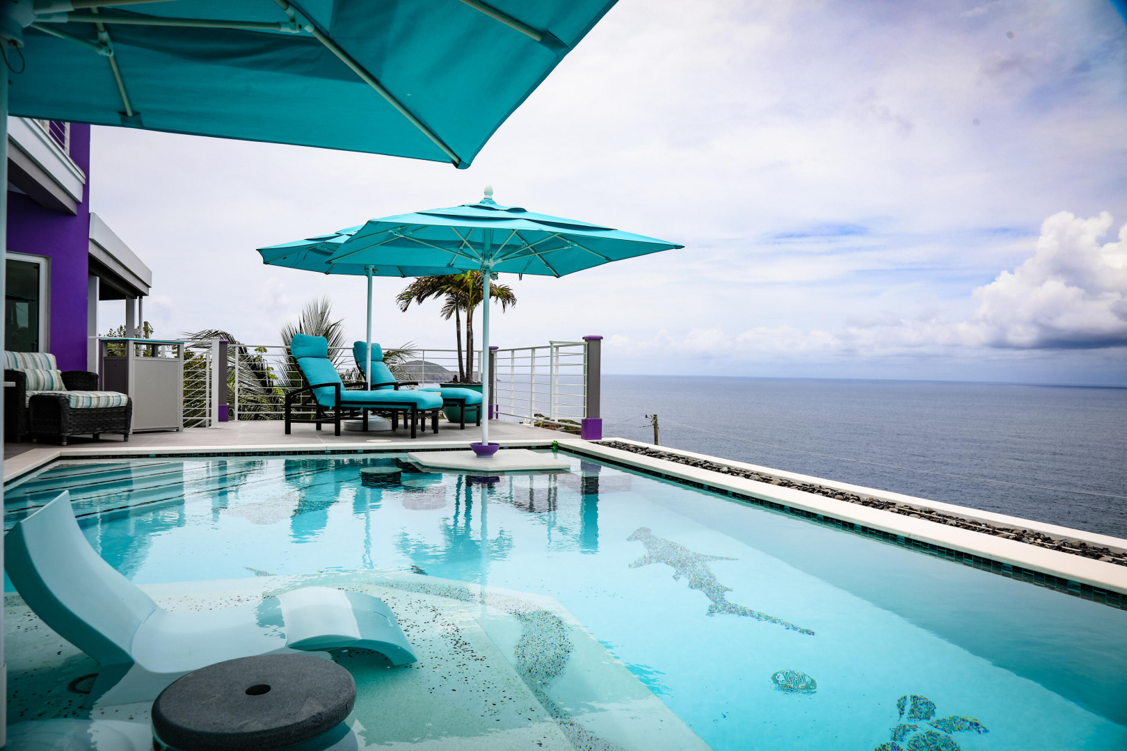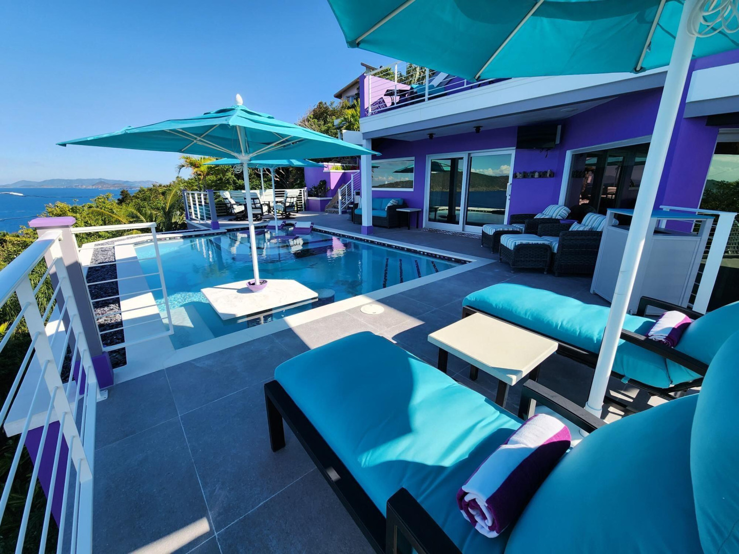 EXQUISITE! Purple Paradise is luxury living at its finest in prestigious Peterborg, St Thomas. Featuring 4 bedrooms, 4.5 bathrooms, 3 custom kitchens, 2 living rooms, and sweeping views of the beautiful ocean view pool and Atlantic Ocean, this custom home is designed with high-end premium amenities, fixtures and landscaping, with a gated/fenced driveway, 2 car garage, 94 solar panels, 6 Tesla batteries, 40KW diesel generator, impact windows, hot tub and heated pool with built-in table and bar stools. Two of the bedrooms are master suites, and the fully equipped gym (4th Bedroom) has a pool table, sauna, shower/bath and kitchen. The modern amenities, along with the professional lighting and tropical landscaping, showcase this property above others. See list of Special Features attached