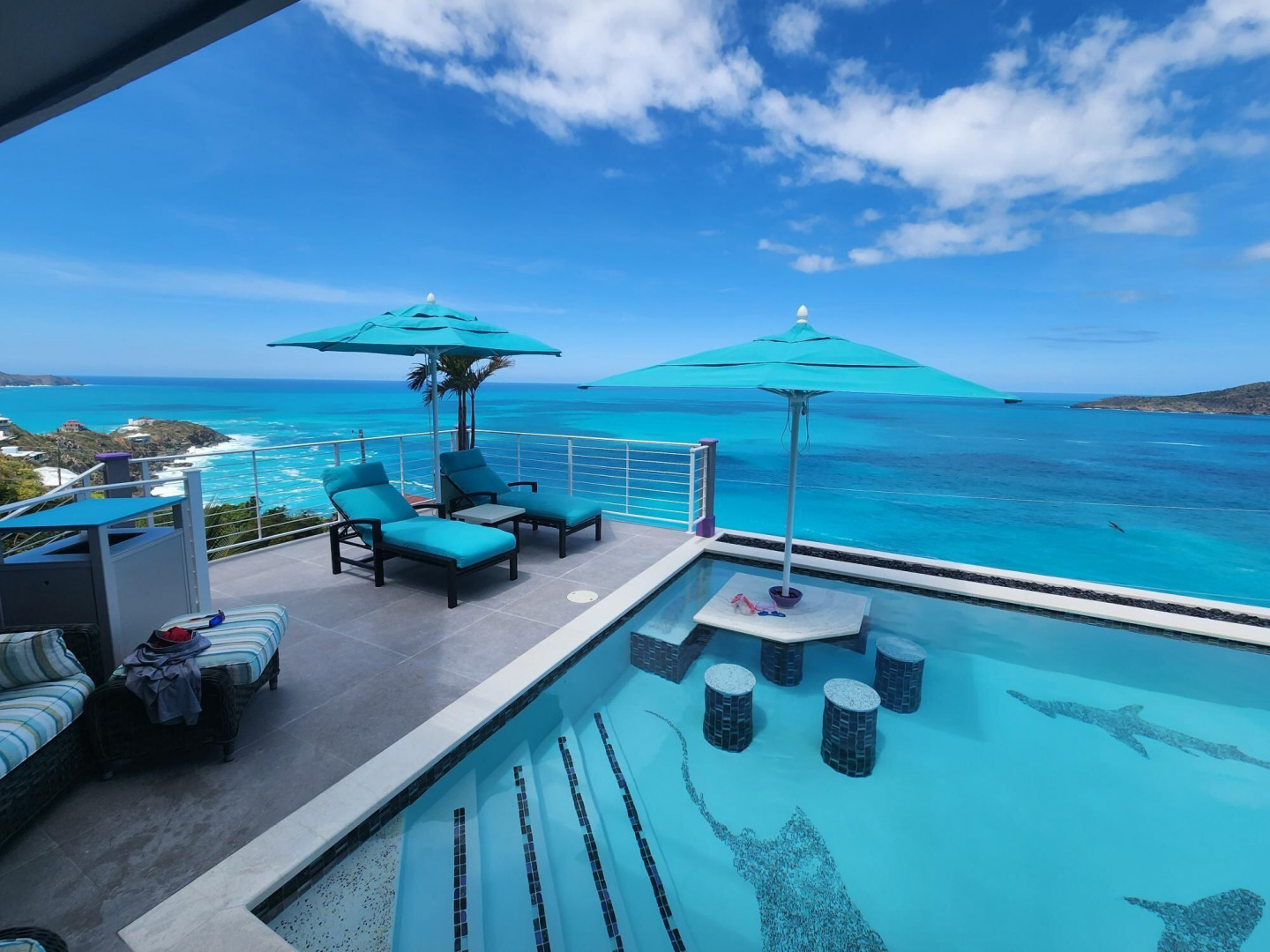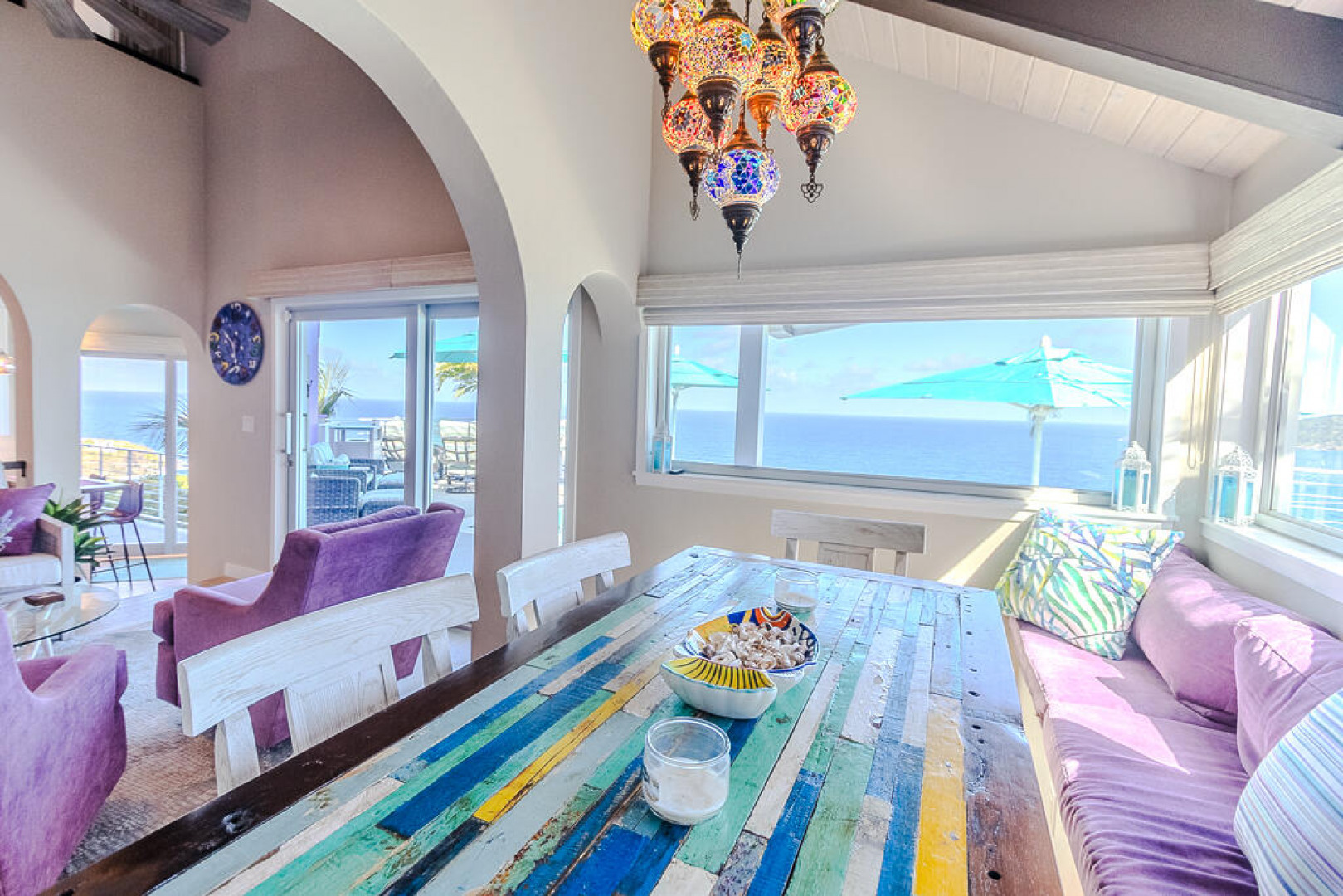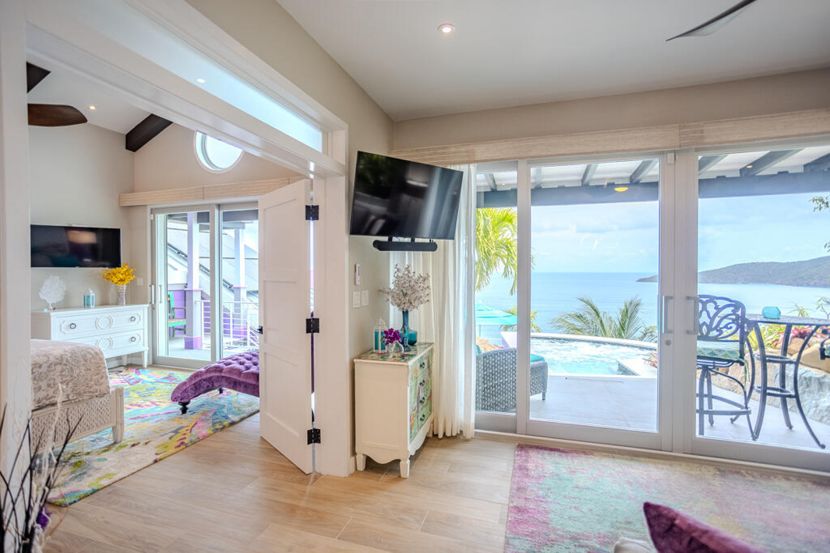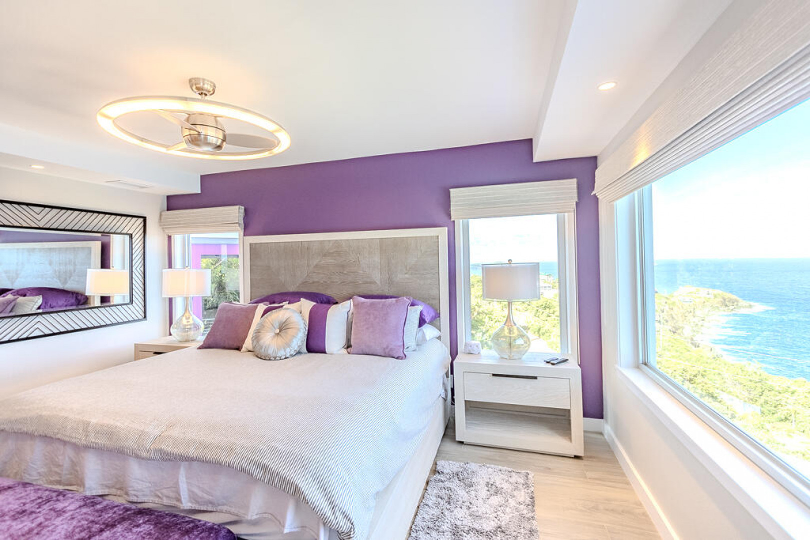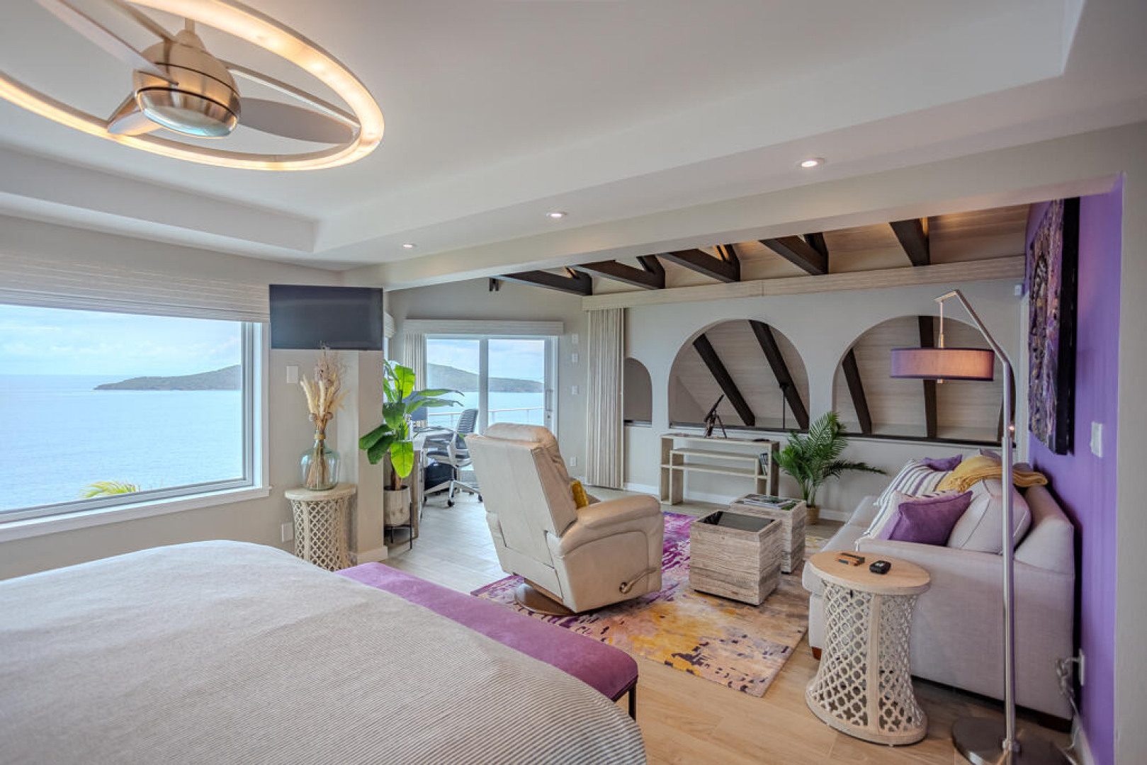 EXQUISITE! Purple Paradise is luxury living at its finest in prestigious Peterborg, St Thomas. Featuring 4 bedrooms, 4.5 bathrooms, 3 custom kitchens, 2 living rooms, and sweeping views of the beautiful ocean view pool and Atlantic Ocean, this custom home is designed with high-end premium amenities, fixtures and landscaping, with a gated/fenced driveway, 2 car garage, 94 solar panels, 6 Tesla batteries, 40KW diesel generator, impact windows, hot tub and heated pool with built-in table and bar stools. Two of the bedrooms are master suites, and the fully equipped gym (4th Bedroom) has a pool table, sauna, shower/bath and kitchen. The modern amenities, along with the professional lighting and tropical landscaping, showcase this property above others. See list of Special Features attached