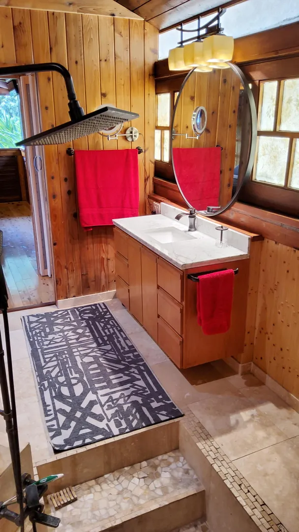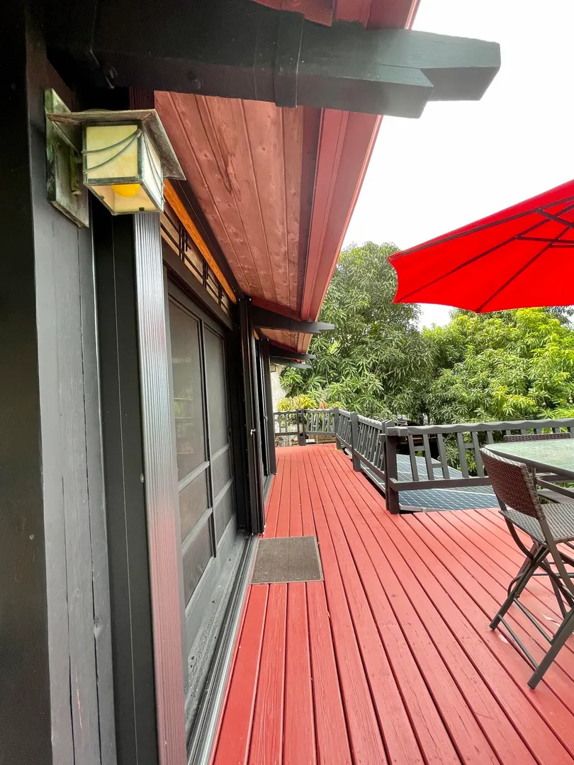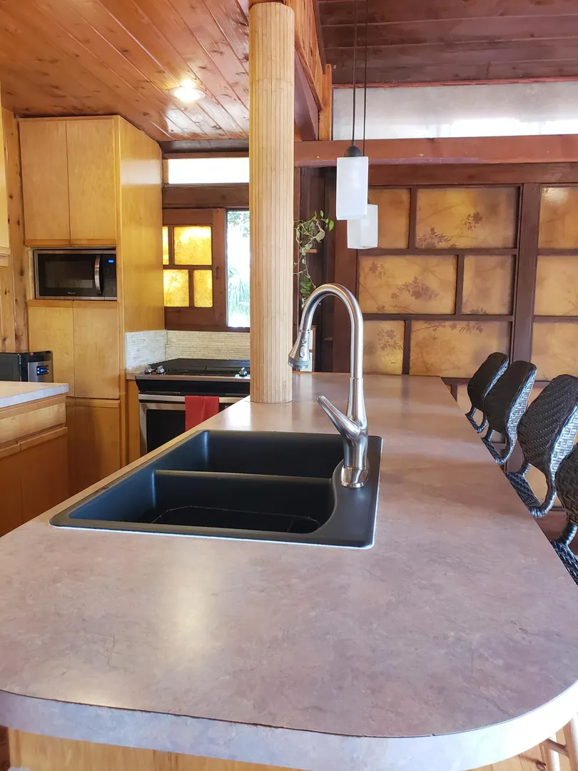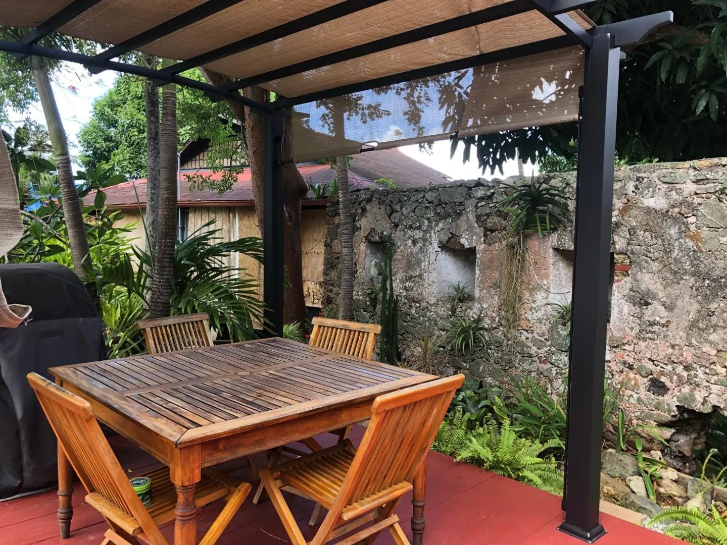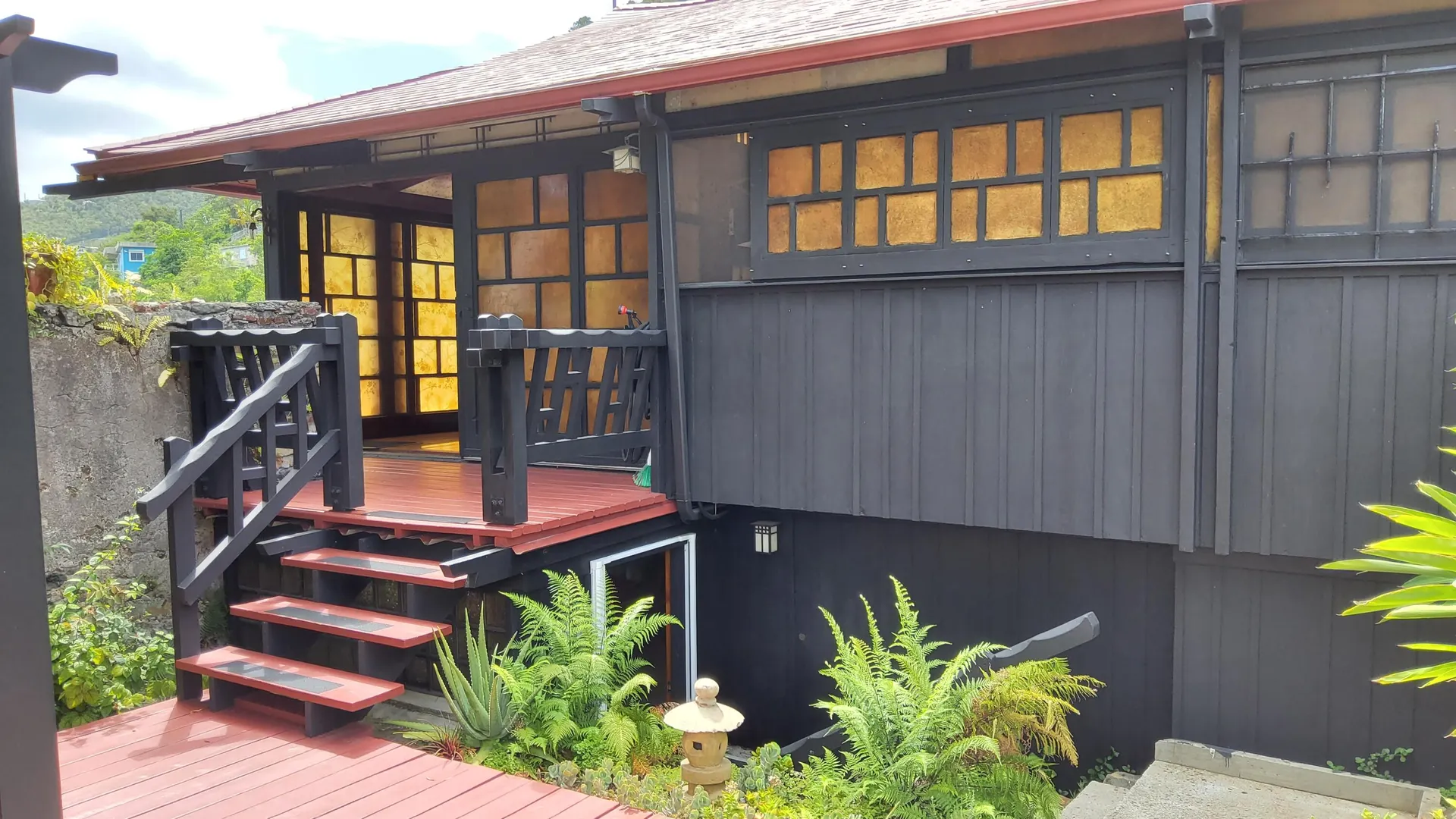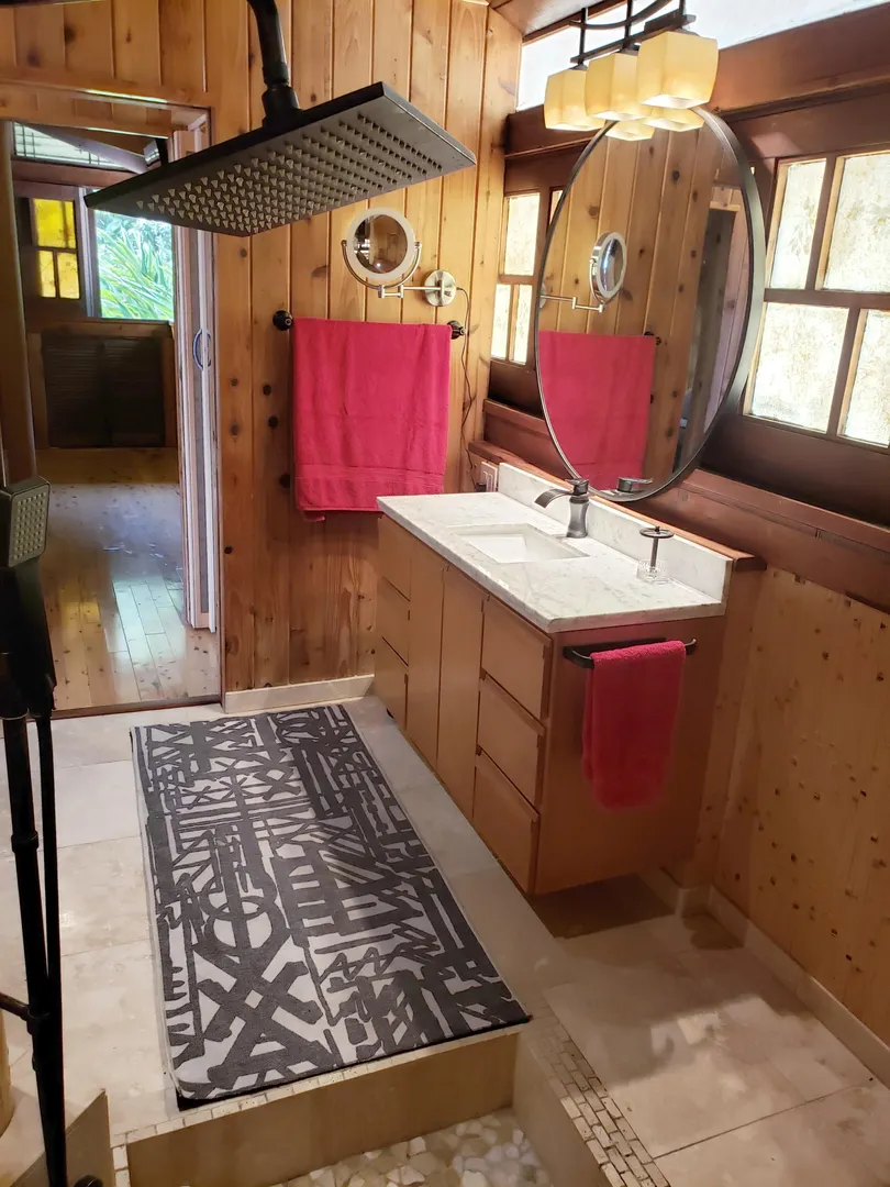 Unique, small complex. The decks boast stunning views. You are surrounded by the lush tropical landscaping in this gated community. Saltwater pool with large deck, on-site mail delivery. Dogs & cats allowed with board approval. For your renters, there is a coin-operated laundry facility on site. The Upper Unit is the central unit, gas stove, the primary's bath has the on-suite laundry and includes a separate shower. The lower unit has one bedroom, full kitchen w/electric stove, living room, and bathroom--separate water meters for each unit--small Veranda with views of a historical wall, drop-down shade from the sun. Take your shoes off at this unit and walk on some green grass, making the Veranda so unique--an extraordinary place. Gas Grill. Solar Panels for interior fans. Cedar closets.