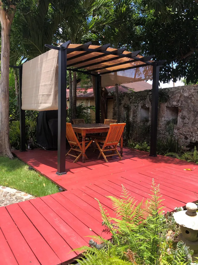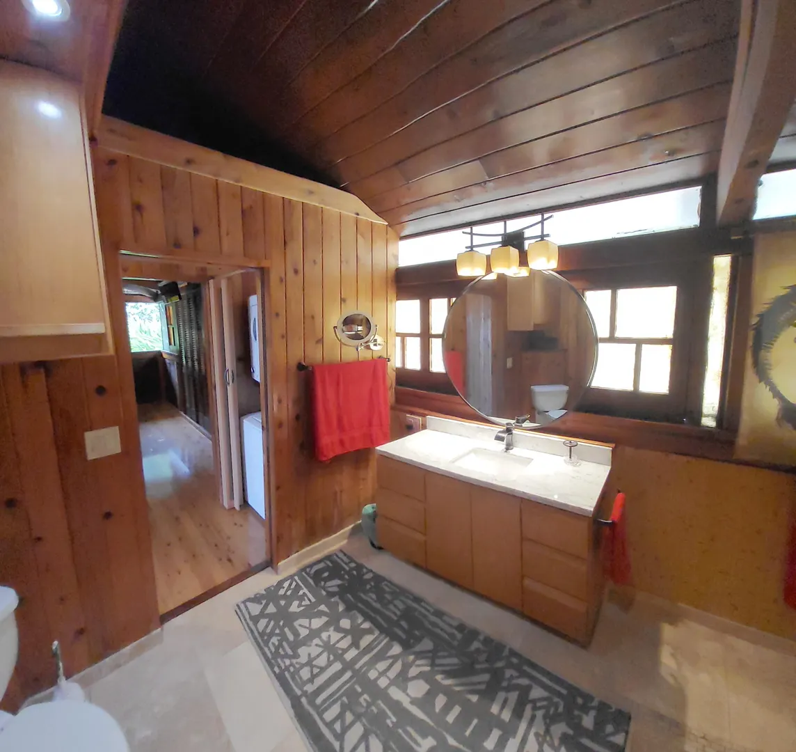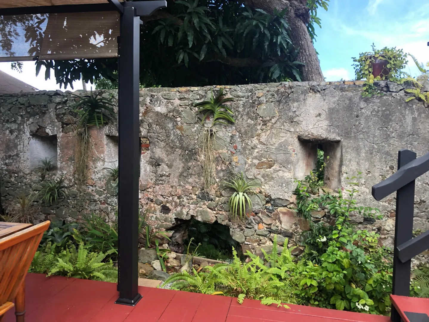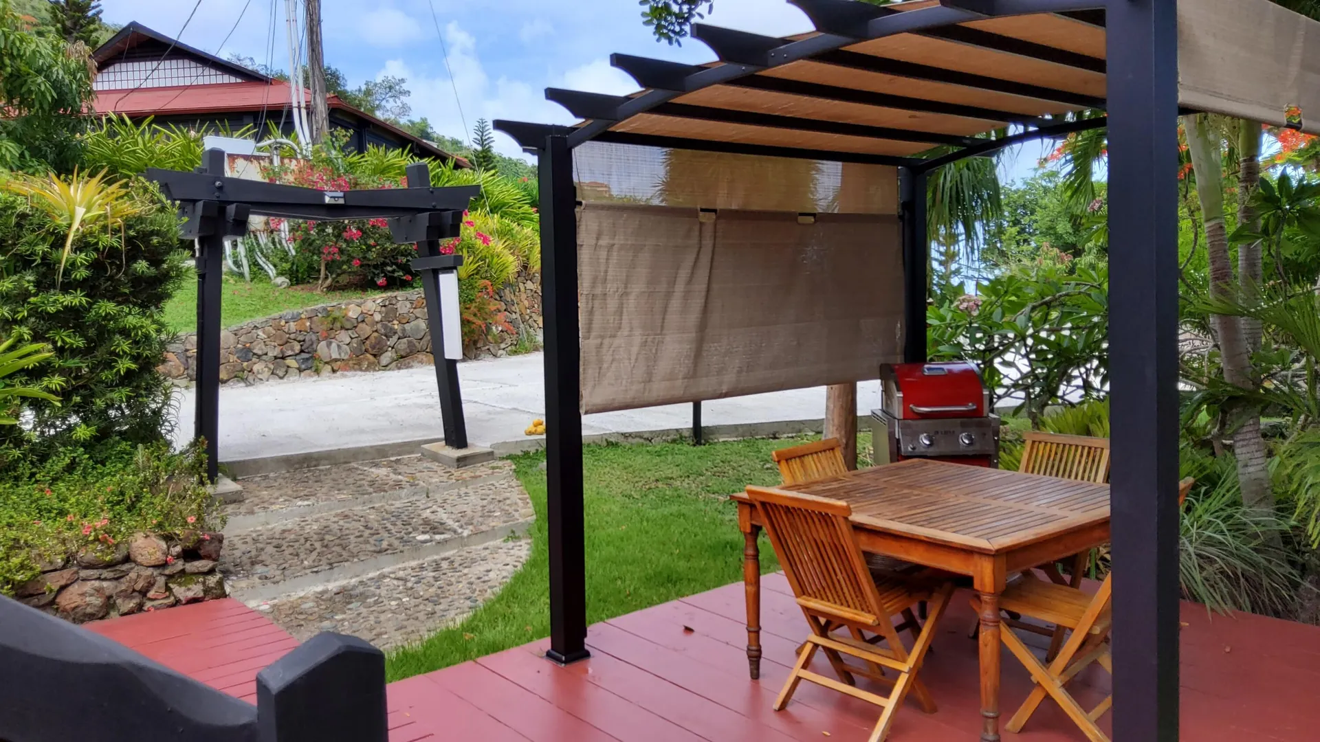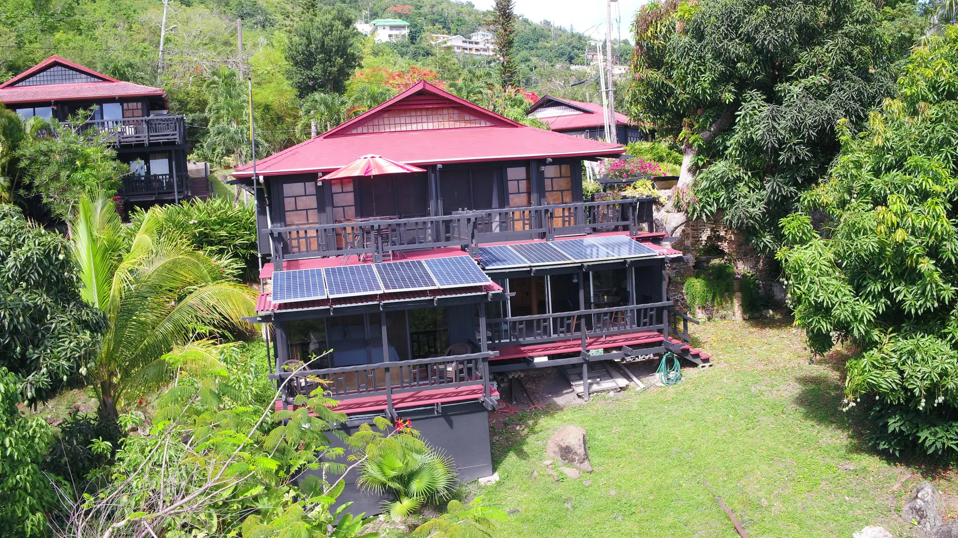 Unique, small complex. The decks boast stunning views. You are surrounded by the lush tropical landscaping in this gated community. Saltwater pool with large deck, on-site mail delivery. Dogs & cats allowed with board approval. For your renters, there is a coin-operated laundry facility on site. The Upper Unit is the central unit, gas stove, the primary's bath has the on-suite laundry and includes a separate shower. The lower unit has one bedroom, full kitchen w/electric stove, living room, and bathroom--separate water meters for each unit--small Veranda with views of a historical wall, drop-down shade from the sun. Take your shoes off at this unit and walk on some green grass, making the Veranda so unique--an extraordinary place. Gas Grill. Solar Panels for interior fans. Cedar closets.