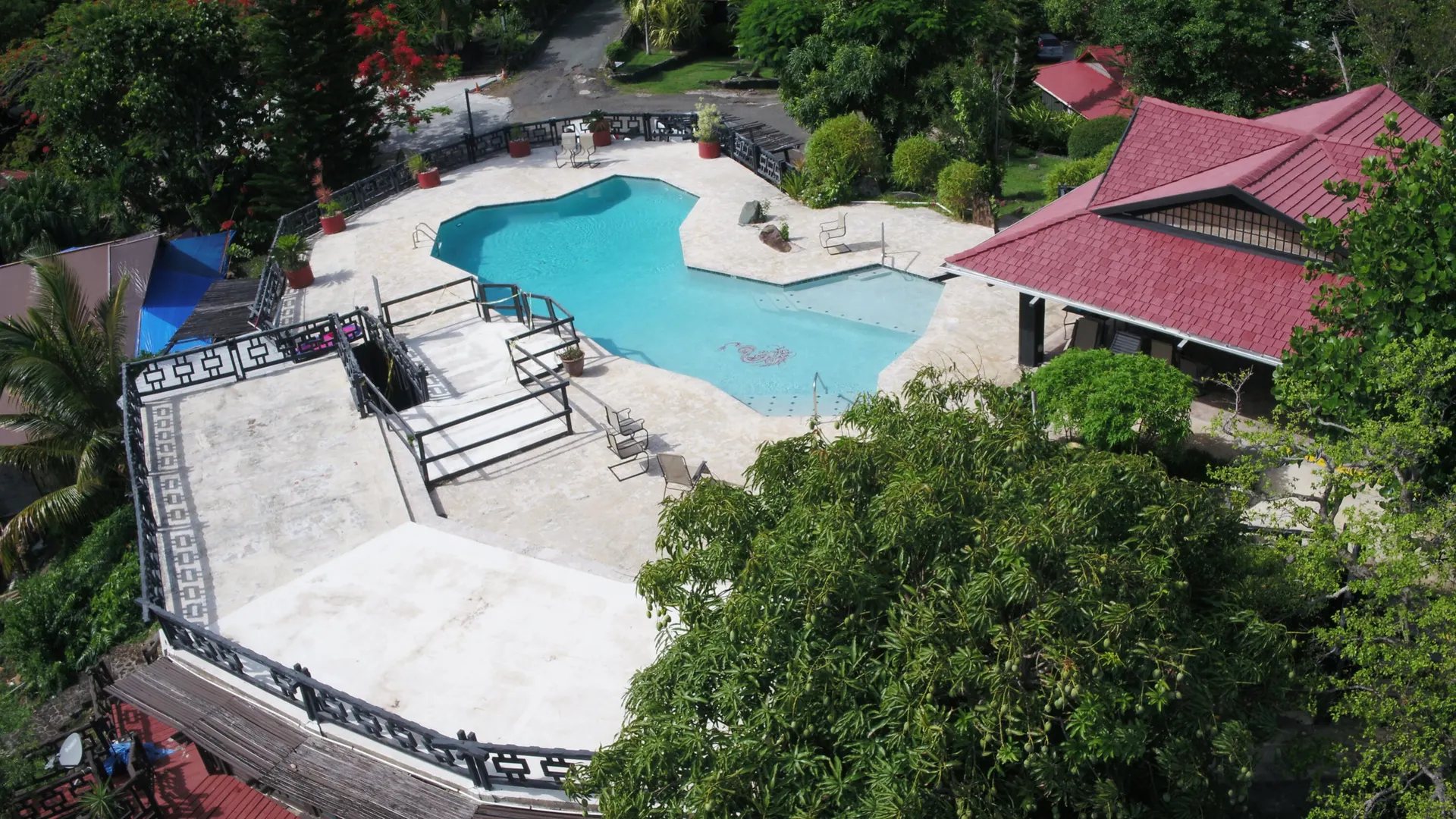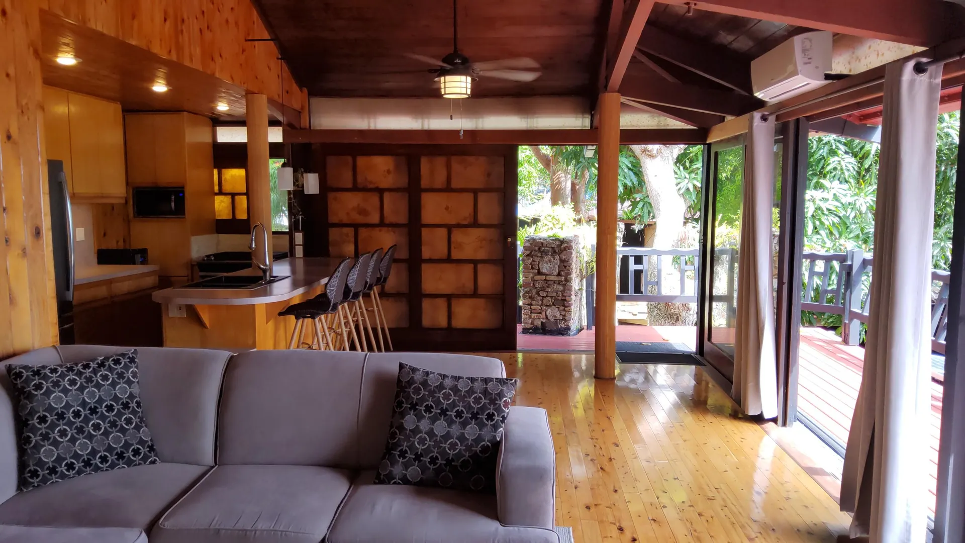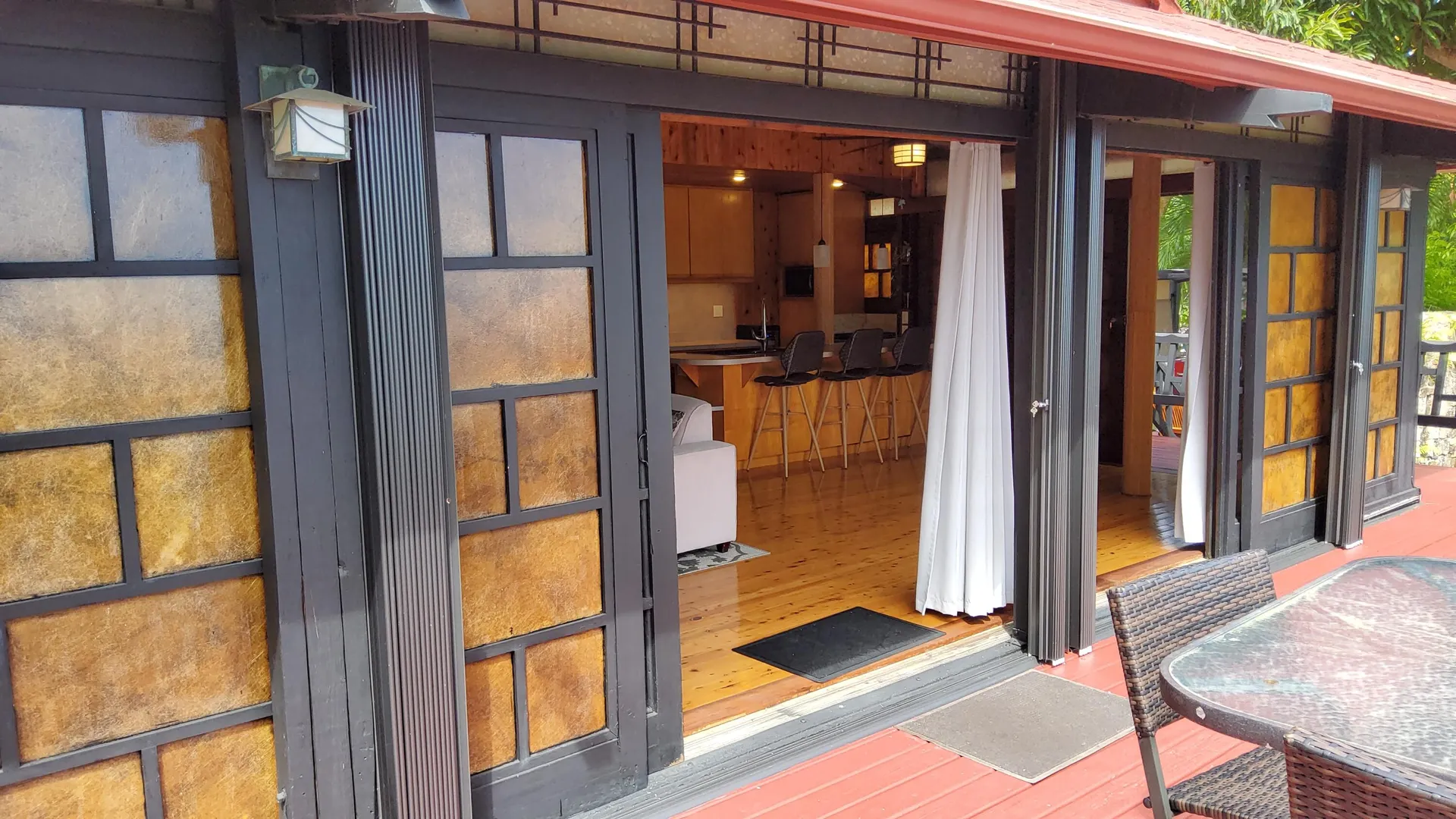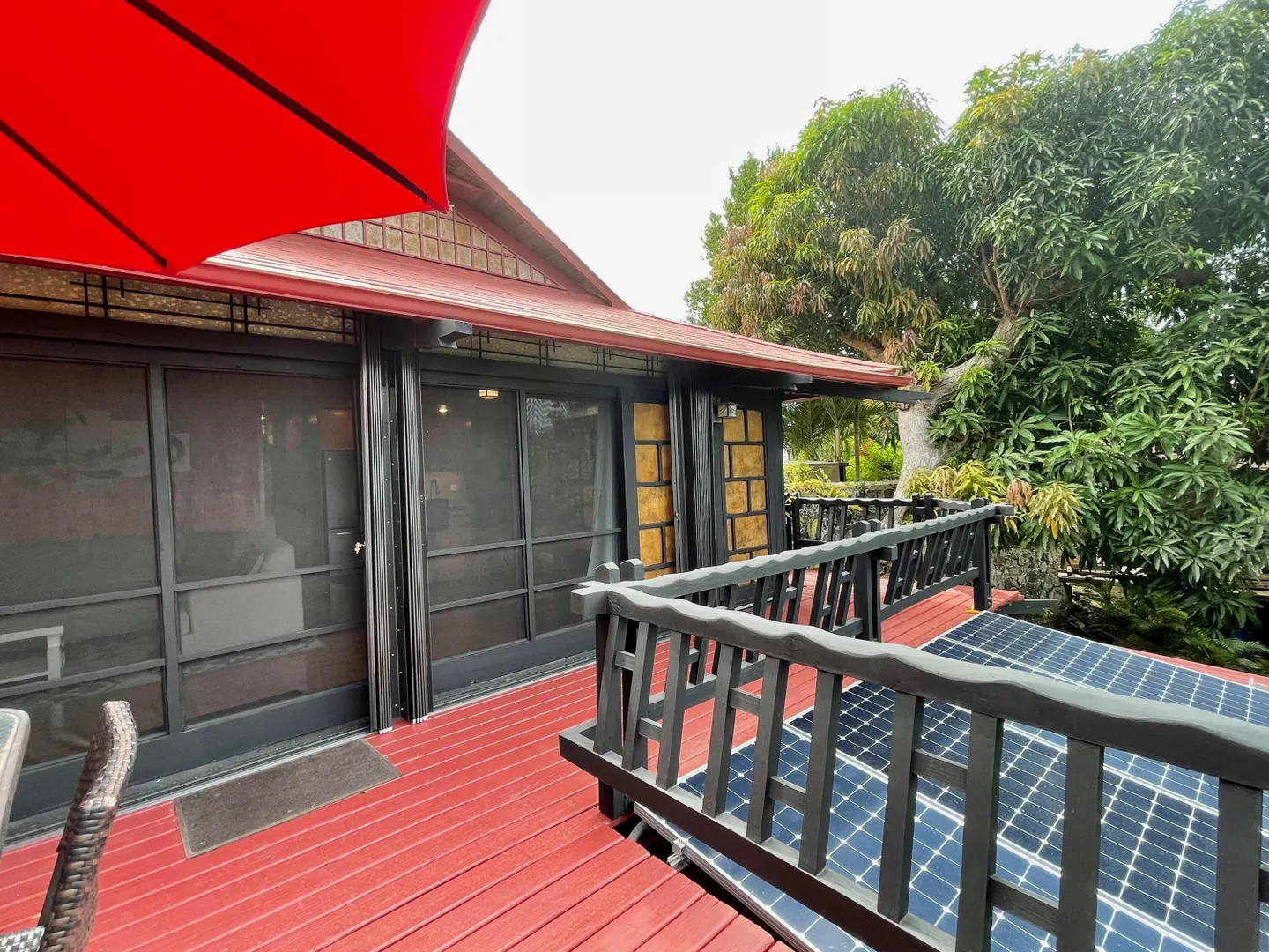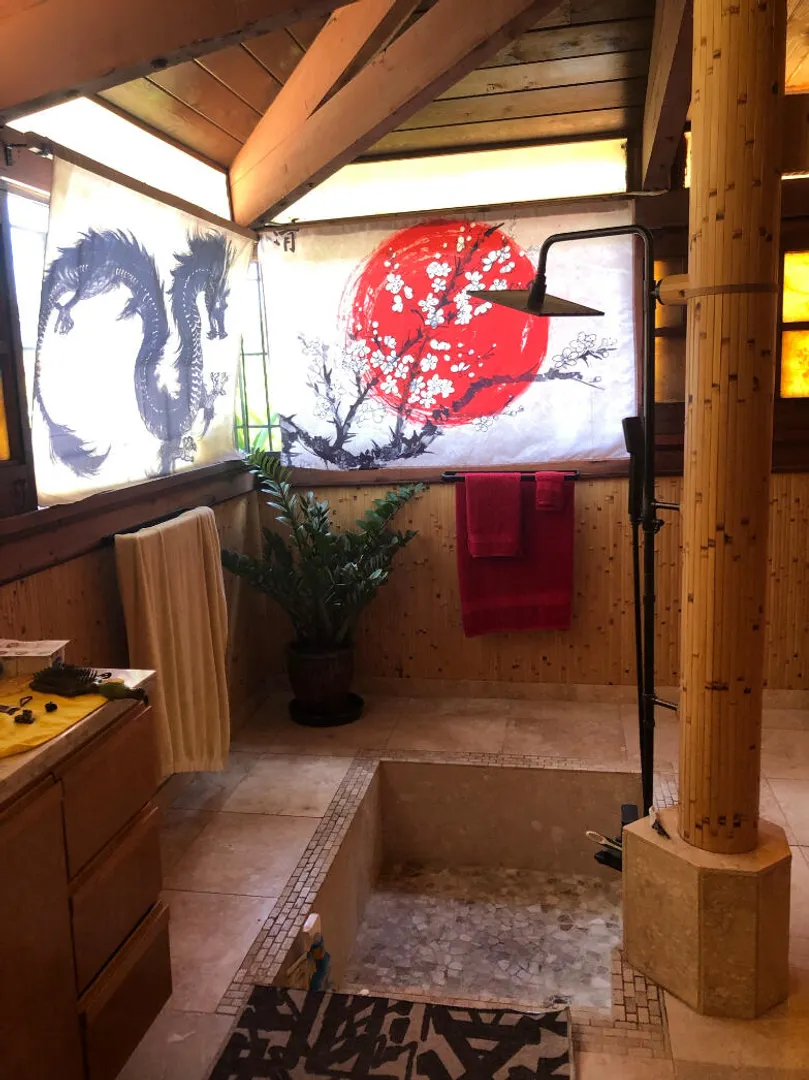 Unique, small complex. The decks boast stunning views. You are surrounded by the lush tropical landscaping in this gated community. Saltwater pool with large deck, on-site mail delivery. Dogs & cats allowed with board approval. For your renters, there is a coin-operated laundry facility on site. The Upper Unit is the central unit, gas stove, the primary's bath has the on-suite laundry and includes a separate shower. The lower unit has one bedroom, full kitchen w/electric stove, living room, and bathroom--separate water meters for each unit--small Veranda with views of a historical wall, drop-down shade from the sun. Take your shoes off at this unit and walk on some green grass, making the Veranda so unique--an extraordinary place. Gas Grill. Solar Panels for interior fans. Cedar closets.