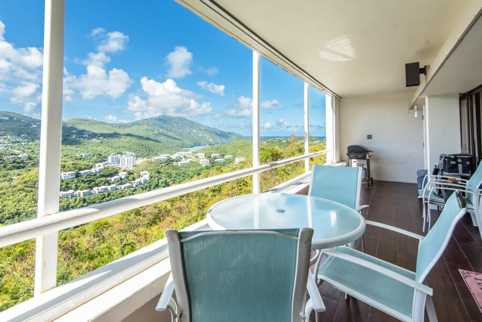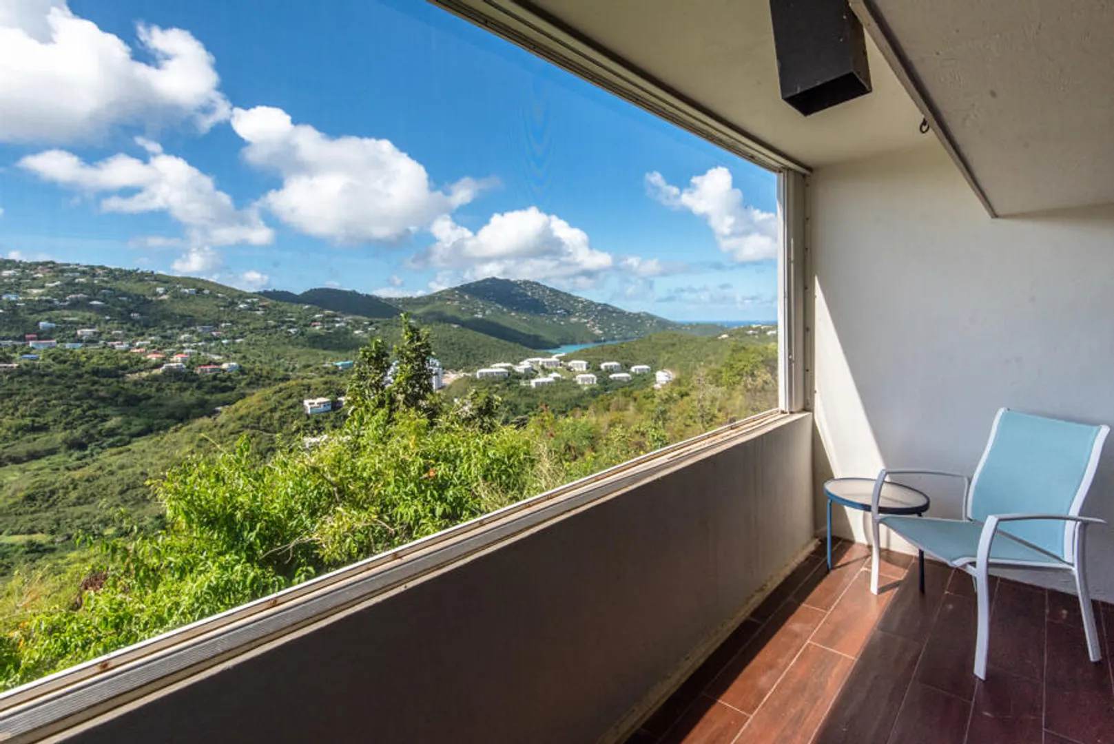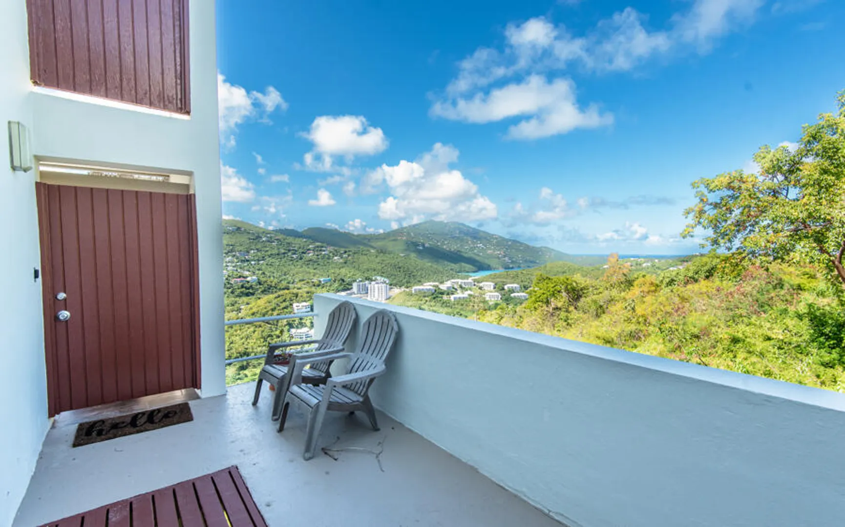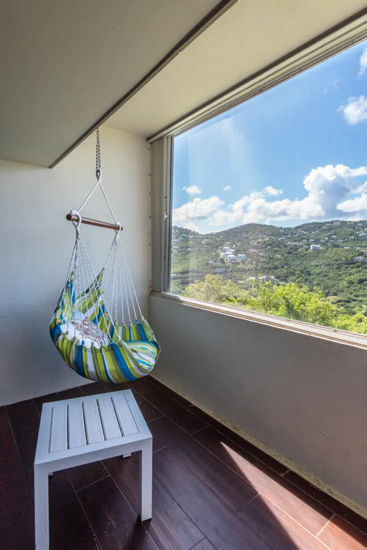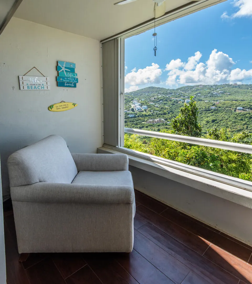 Beautifully remodeled condo with wood style porcelain floors, well-appointed kitchen, new doors, a/c units and more. Bedroom and living room open out onto covered porch overlooking the green valley and ocean beyond. Located in the upscale and gated Mahogany Run community, and convenient to Magens Bay Beach, downtown Charlotte Amalie and Red Hook. Roof was reinforced in 2020, unit remodeled in 2016.