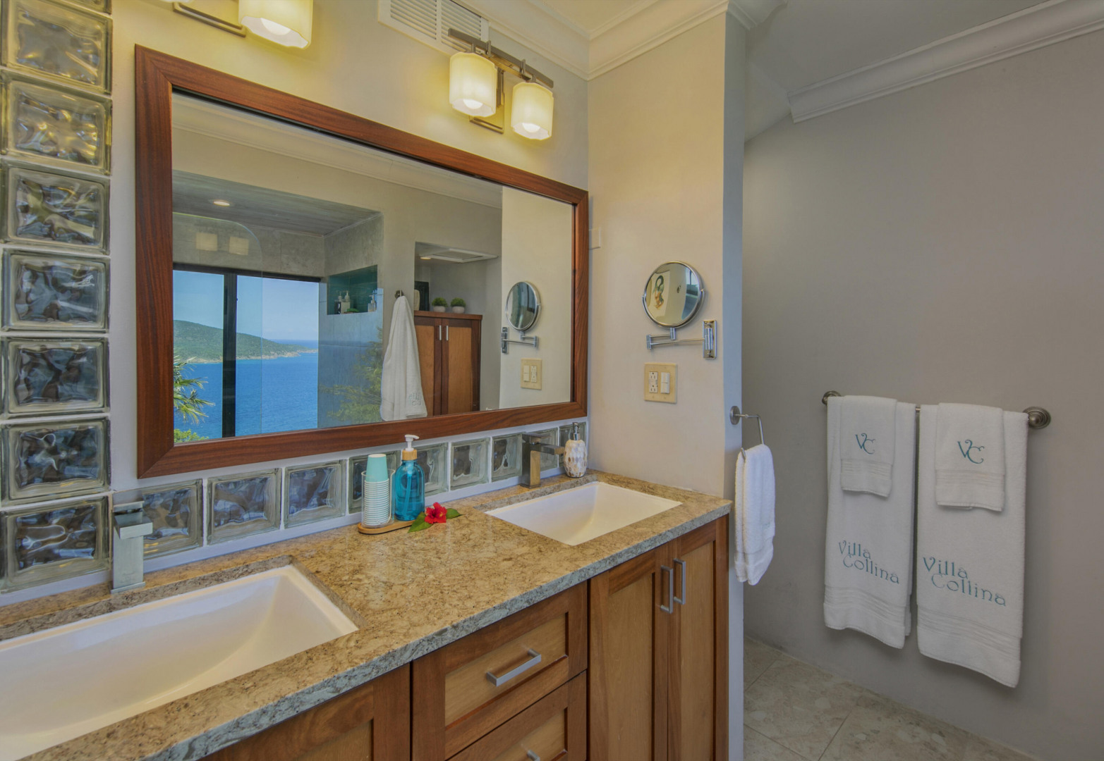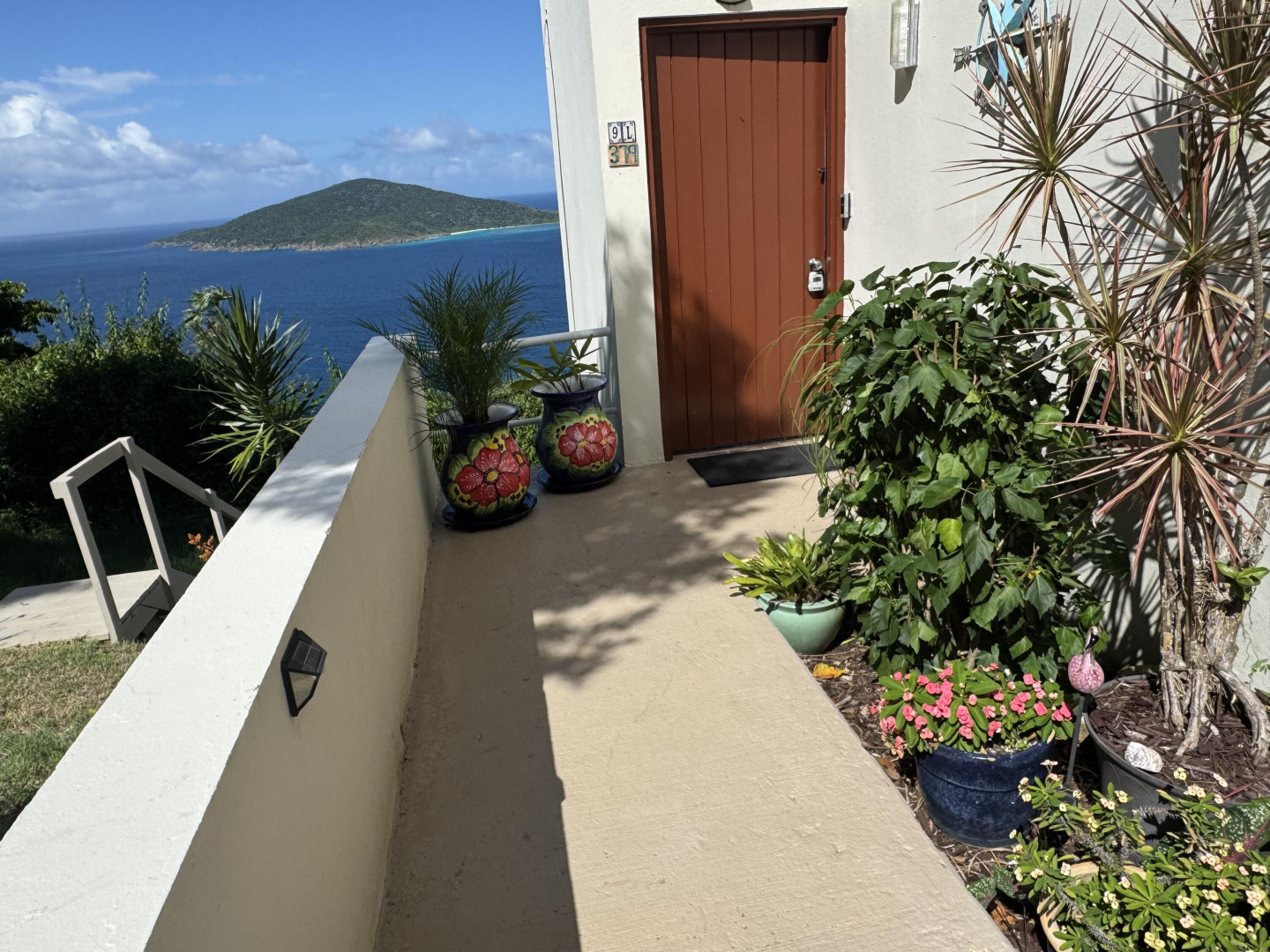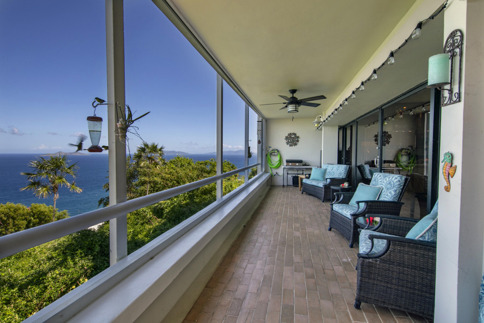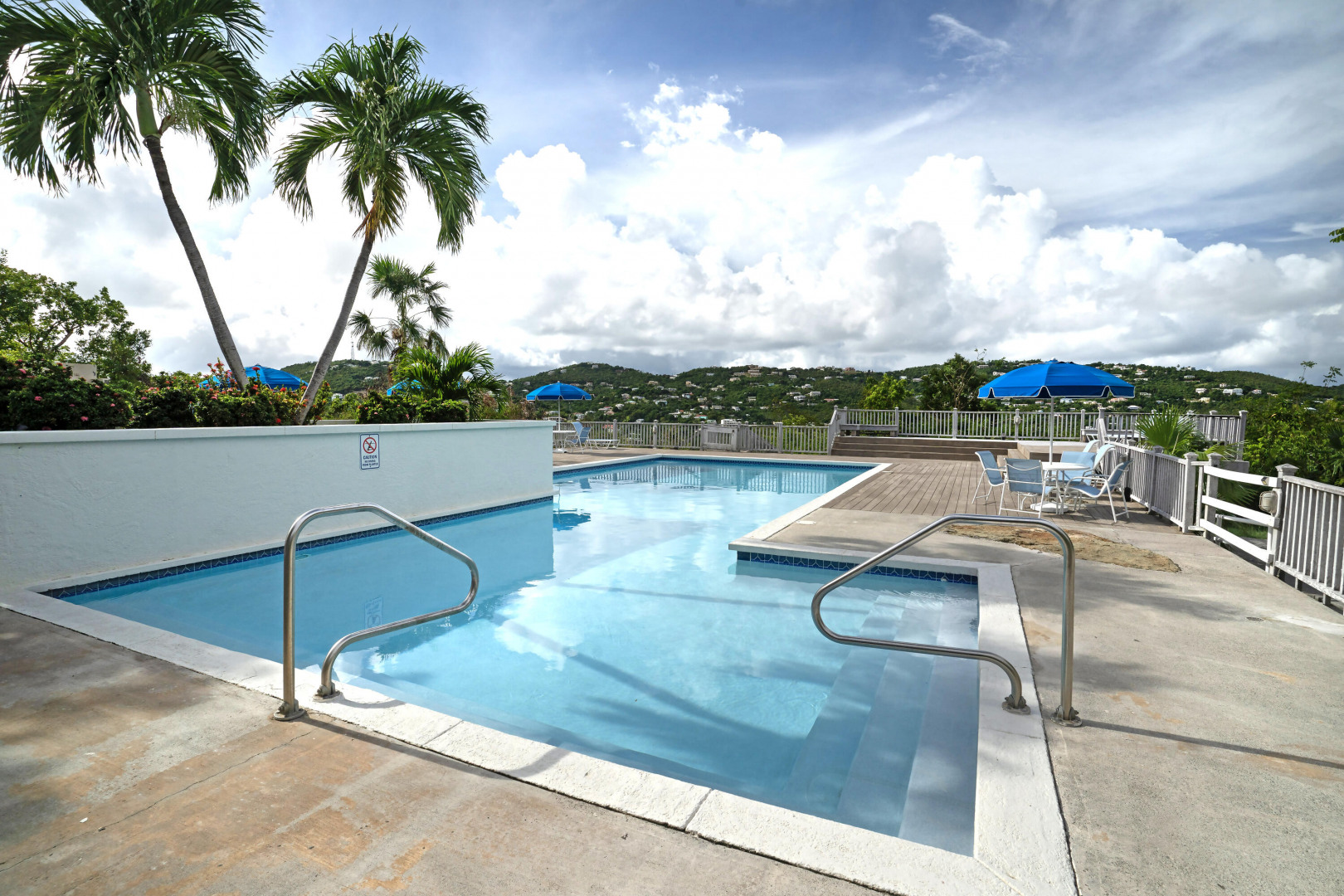 Villa Collina, is a 1 bedroom, 1.5 bath condo offering panoramic and unobstructed views from Hans Lollick to the BVI framed by beautiful, tropical vegetation. Located in the gated Mahogany Run Community, the condo features a 32' covered balcony, your outdoor living/dining 'room' and finely crafted custom mahogany cabinetry throughout. The expanded master bedroom has two built in desks and the spa-like bath has a double sink vanity and contemporary walk-in shower with a beautiful ocean vista. A rare half bath makes this the only one bedroom of its kind in the complex. Upgrades include a new, shared 30KW diesel generator, storm shutters, and Starlink mount. Private and exceptionally well maintained, Villa Collina is island living at its best
