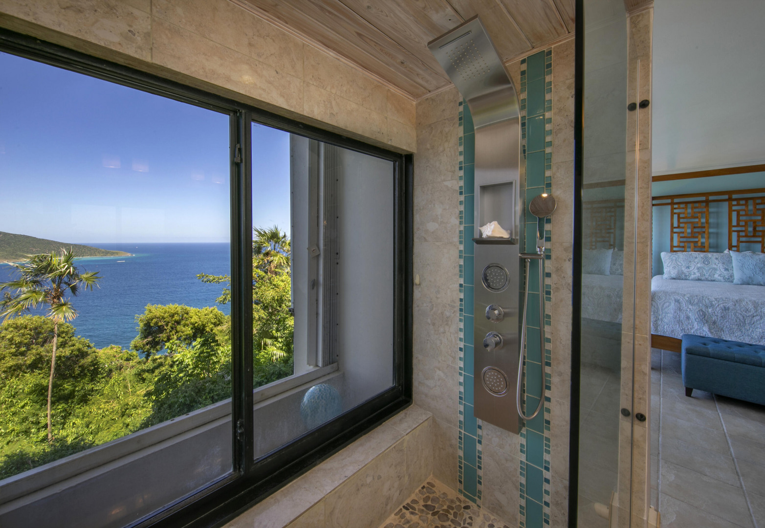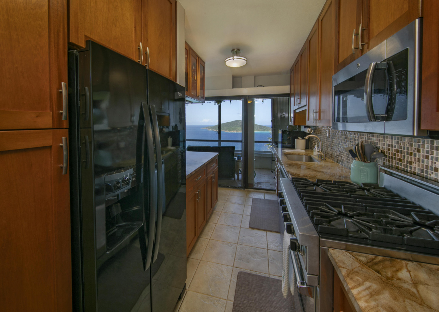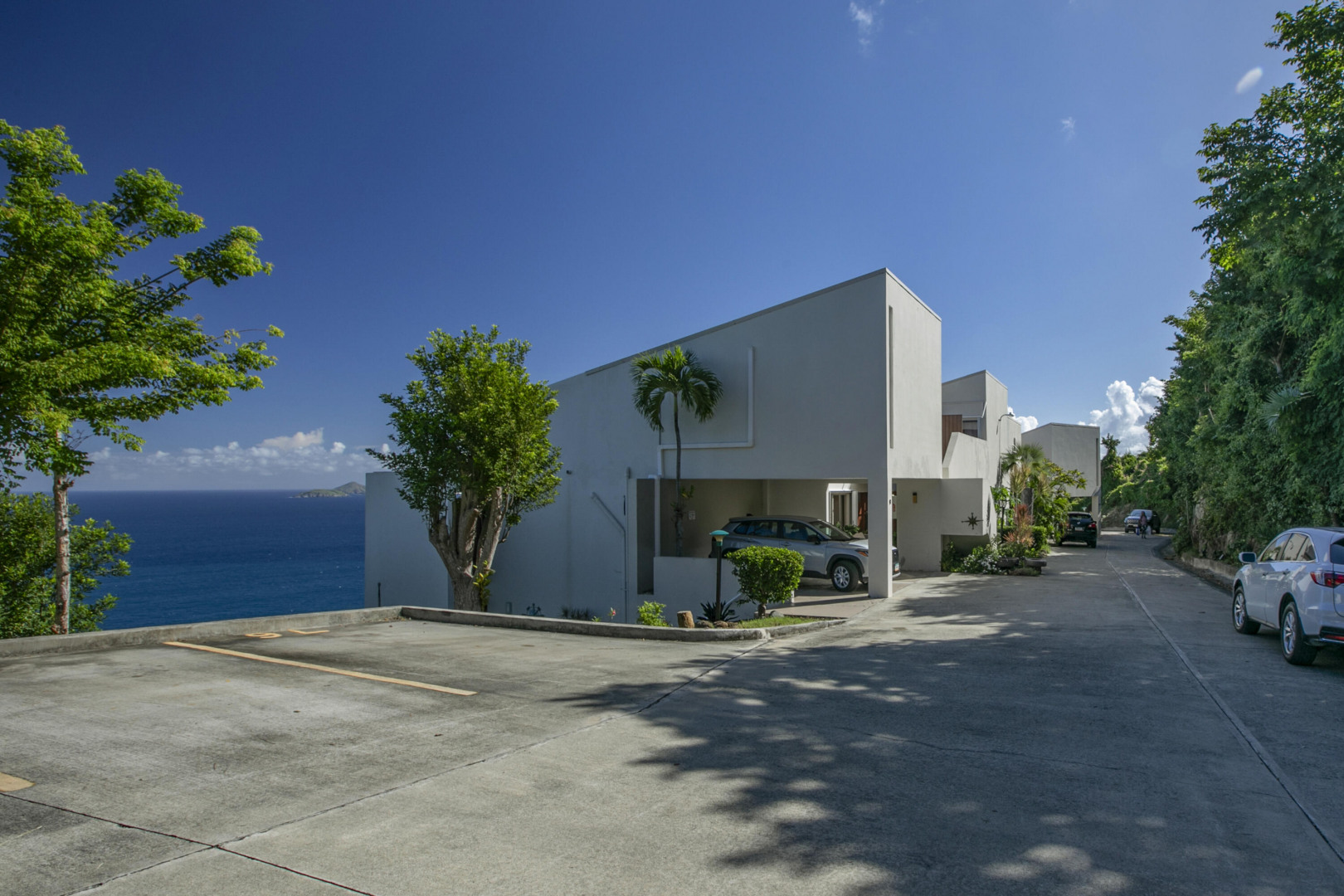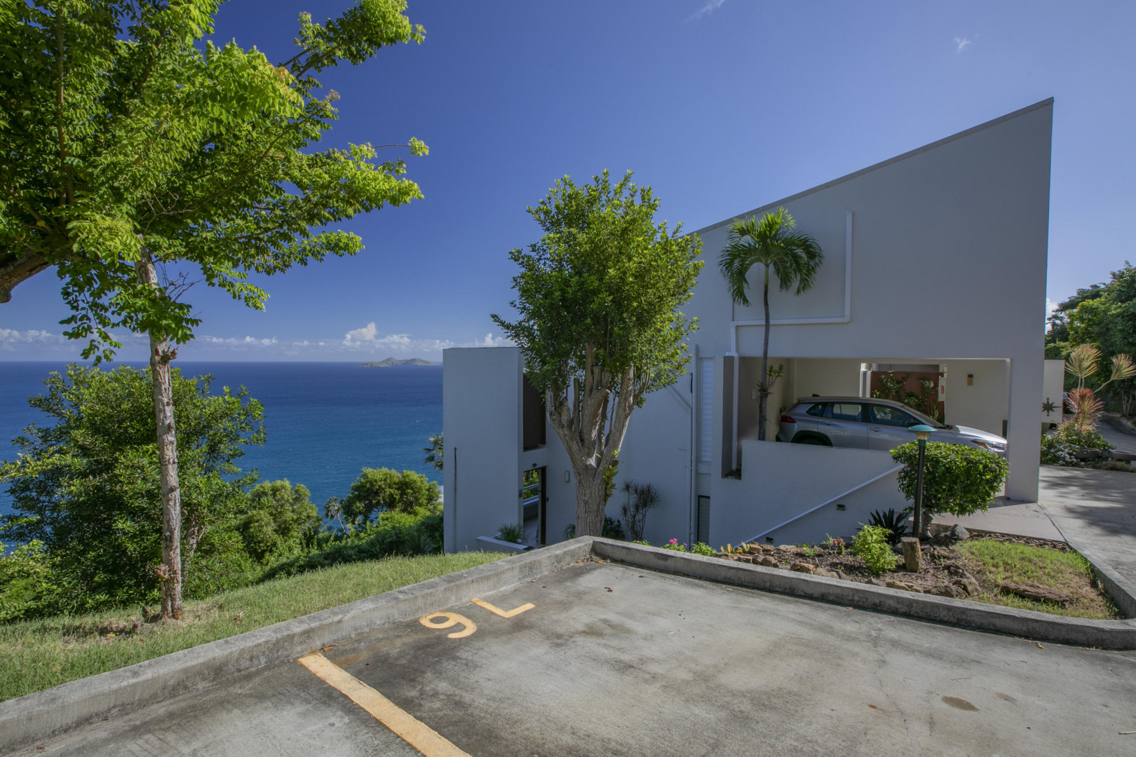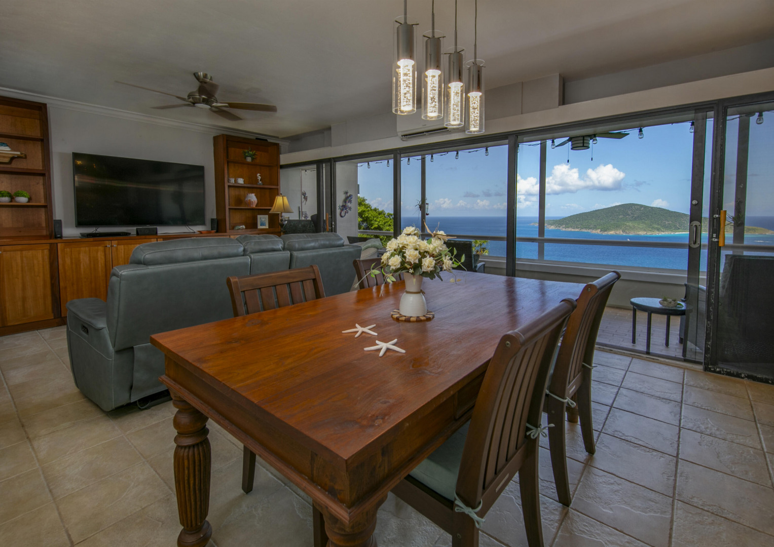 Villa Collina, is a 1 bedroom, 1.5 bath condo offering panoramic and unobstructed views from Hans Lollick to the BVI framed by beautiful, tropical vegetation. Located in the gated Mahogany Run Community, the condo features a 32' covered balcony, your outdoor living/dining 'room' and finely crafted custom mahogany cabinetry throughout. The expanded master bedroom has two built in desks and the spa-like bath has a double sink vanity and contemporary walk-in shower with a beautiful ocean vista. A rare half bath makes this the only one bedroom of its kind in the complex. Upgrades include a new, shared 30KW diesel generator, storm shutters, and Starlink mount. Private and exceptionally well maintained, Villa Collina is island living at its best