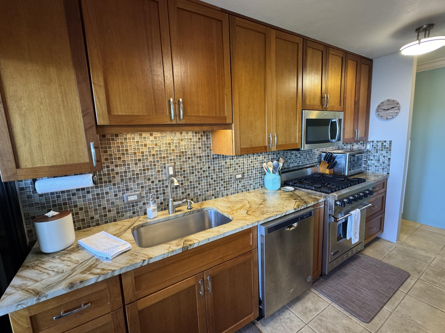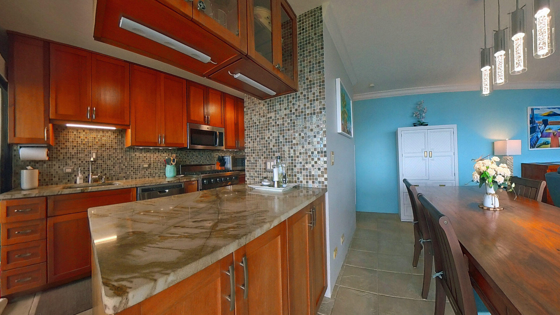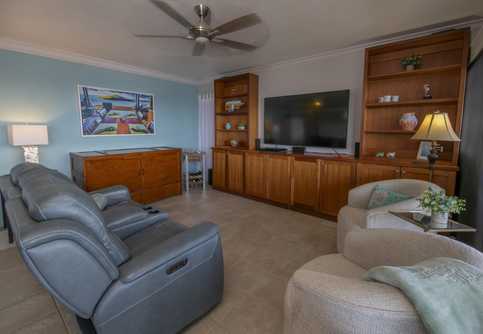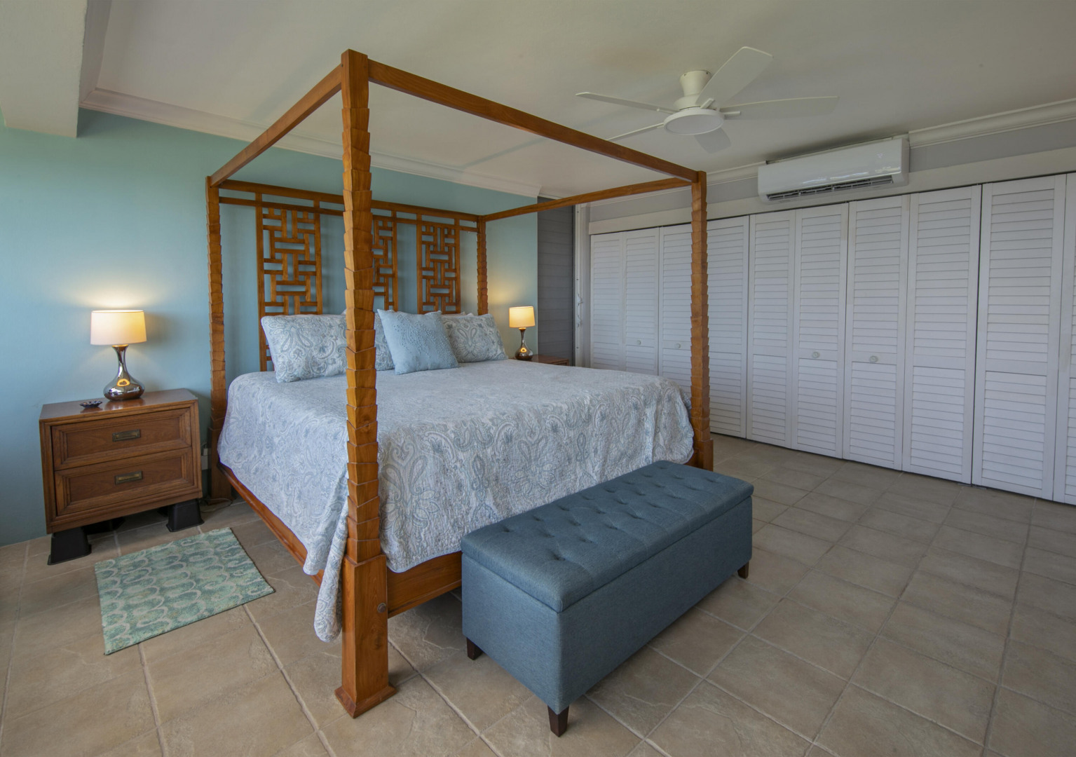 Villa Collina, is a 1 bedroom, 1.5 bath condo offering panoramic and unobstructed views from Hans Lollick to the BVI framed by beautiful, tropical vegetation. Located in the gated Mahogany Run Community, the condo features a 32' covered balcony, your outdoor living/dining 'room' and finely crafted custom mahogany cabinetry throughout. The expanded master bedroom has two built in desks and the spa-like bath has a double sink vanity and contemporary walk-in shower with a beautiful ocean vista. A rare half bath makes this the only one bedroom of its kind in the complex. Upgrades include a new, shared 30KW diesel generator, storm shutters, and Starlink mount. Private and exceptionally well maintained, Villa Collina is island living at its best