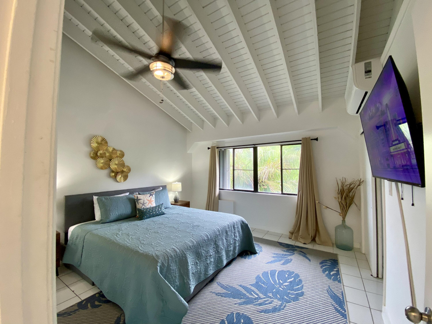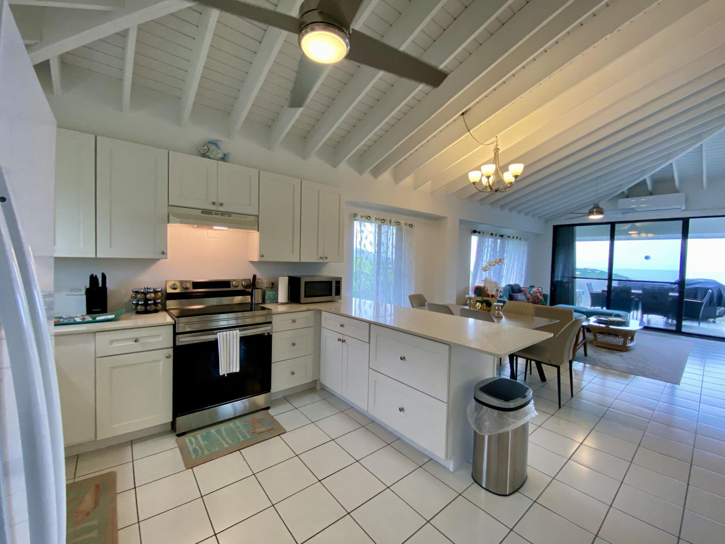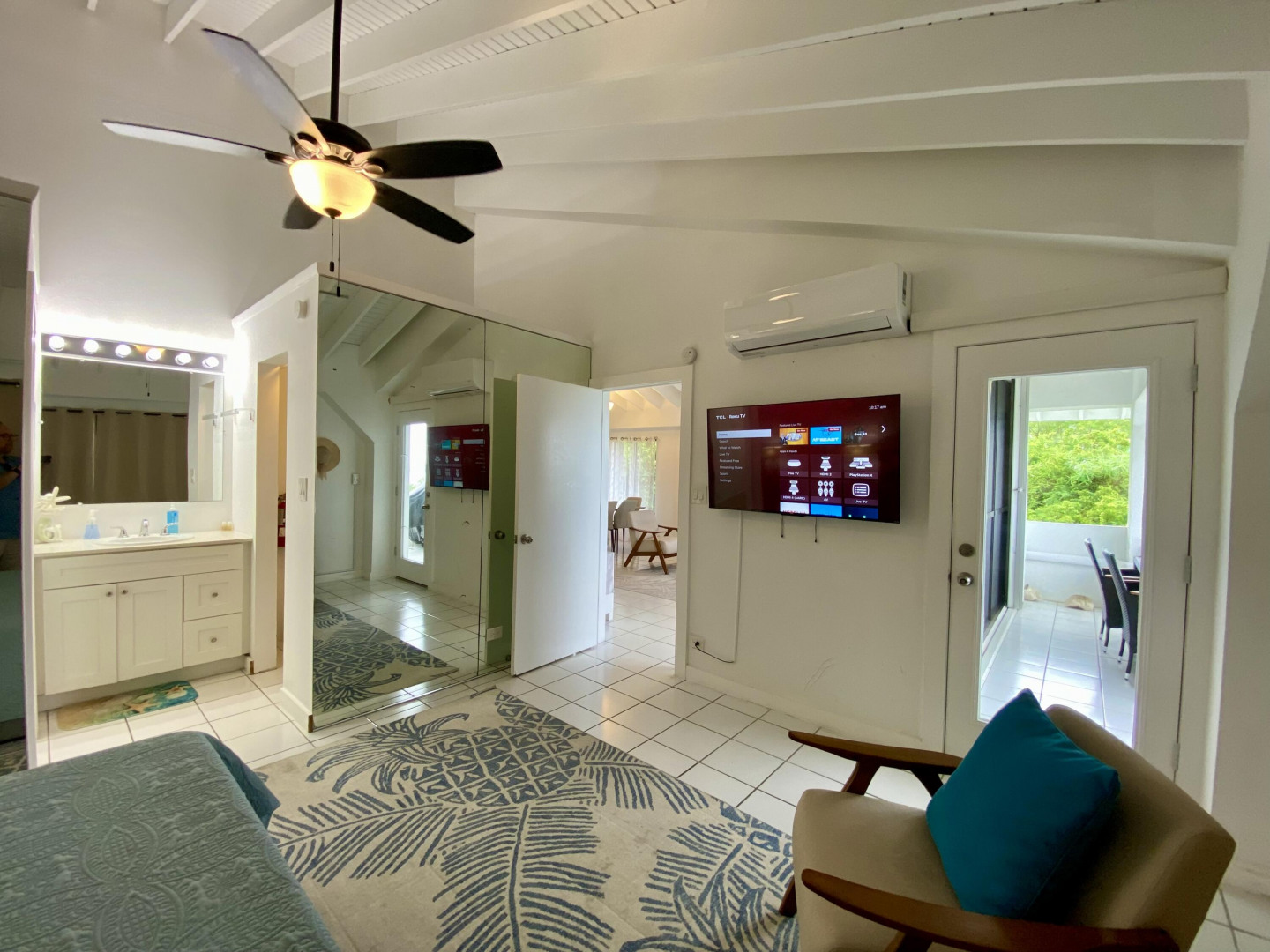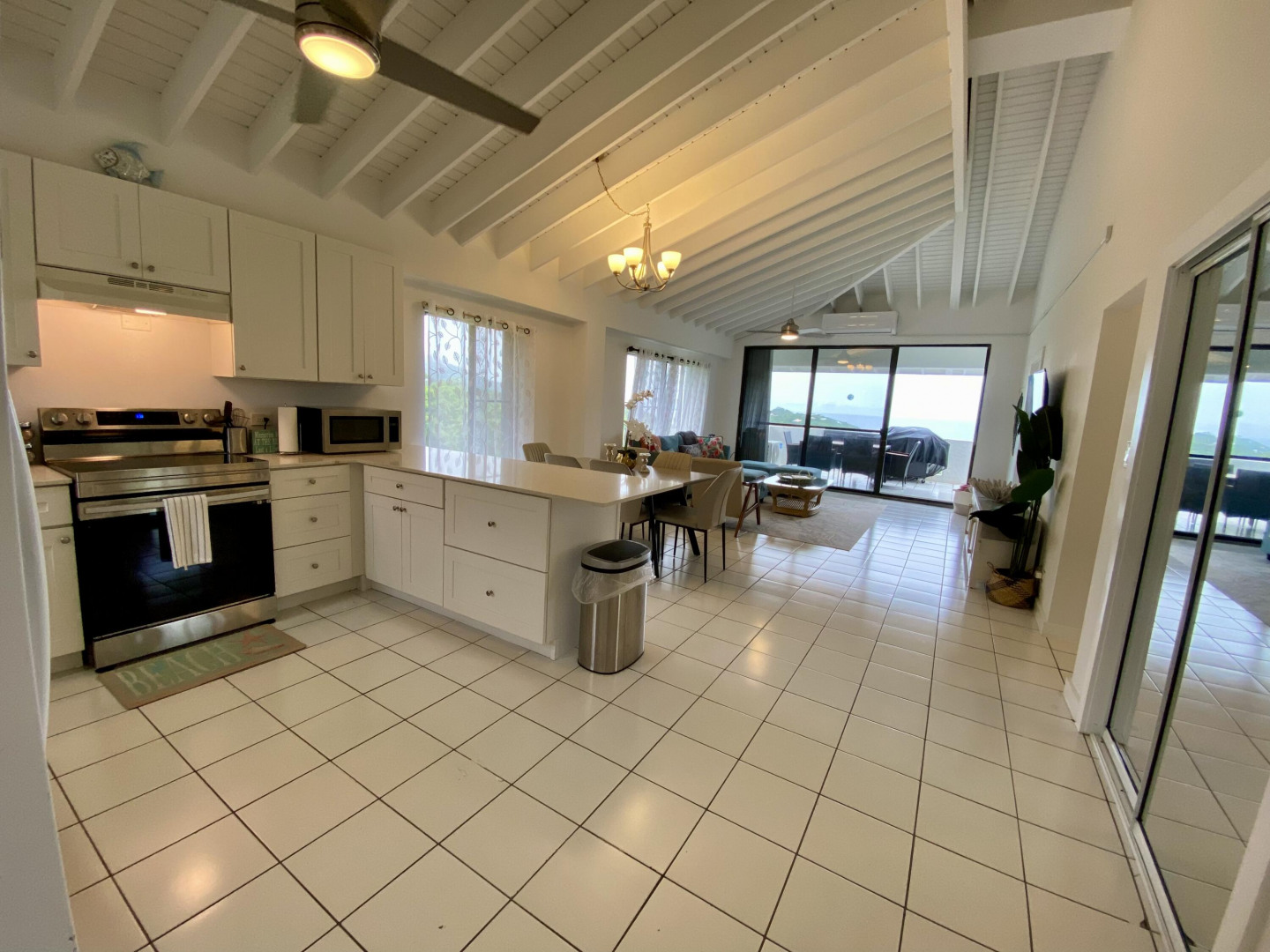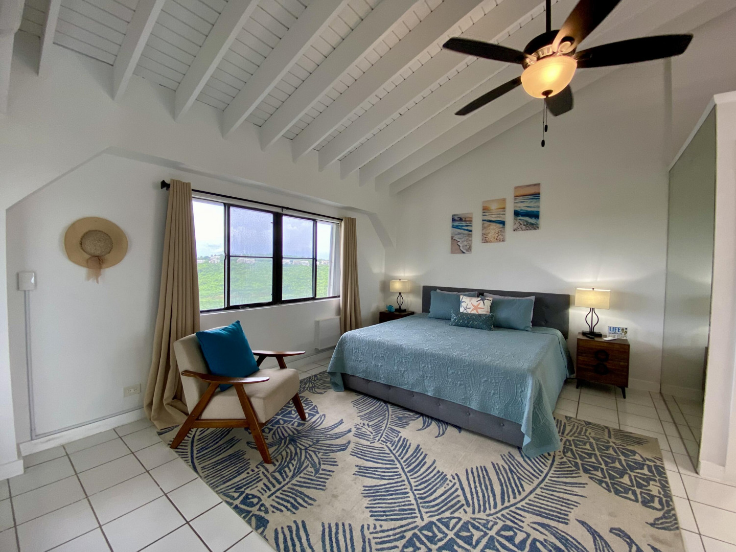 This popular condo on AirBnB, enjoys a spectacular North Side ocean view from its highest elevation in Palm Gardens, and the building most convenient to the complex entrance. Dramatic cathedral ceilings throughout, contemporary fixtures and lighting, newer split a/c's and instant hot water heater. Well-equipped, tastefully furnished and is move-in or short-term rental ready from day one. Relaxing balcony for entertaining or just chillin', 3 ea 50'' smart flat-screens throughout for your entertainment. Well-located, be in town or at Magens Bay Beach within minutes, Red Hook ferry dock just 15 minutes away for those excursions to St. John, the BVI and beyond! (see virtual tour's interactive floorplan experience)